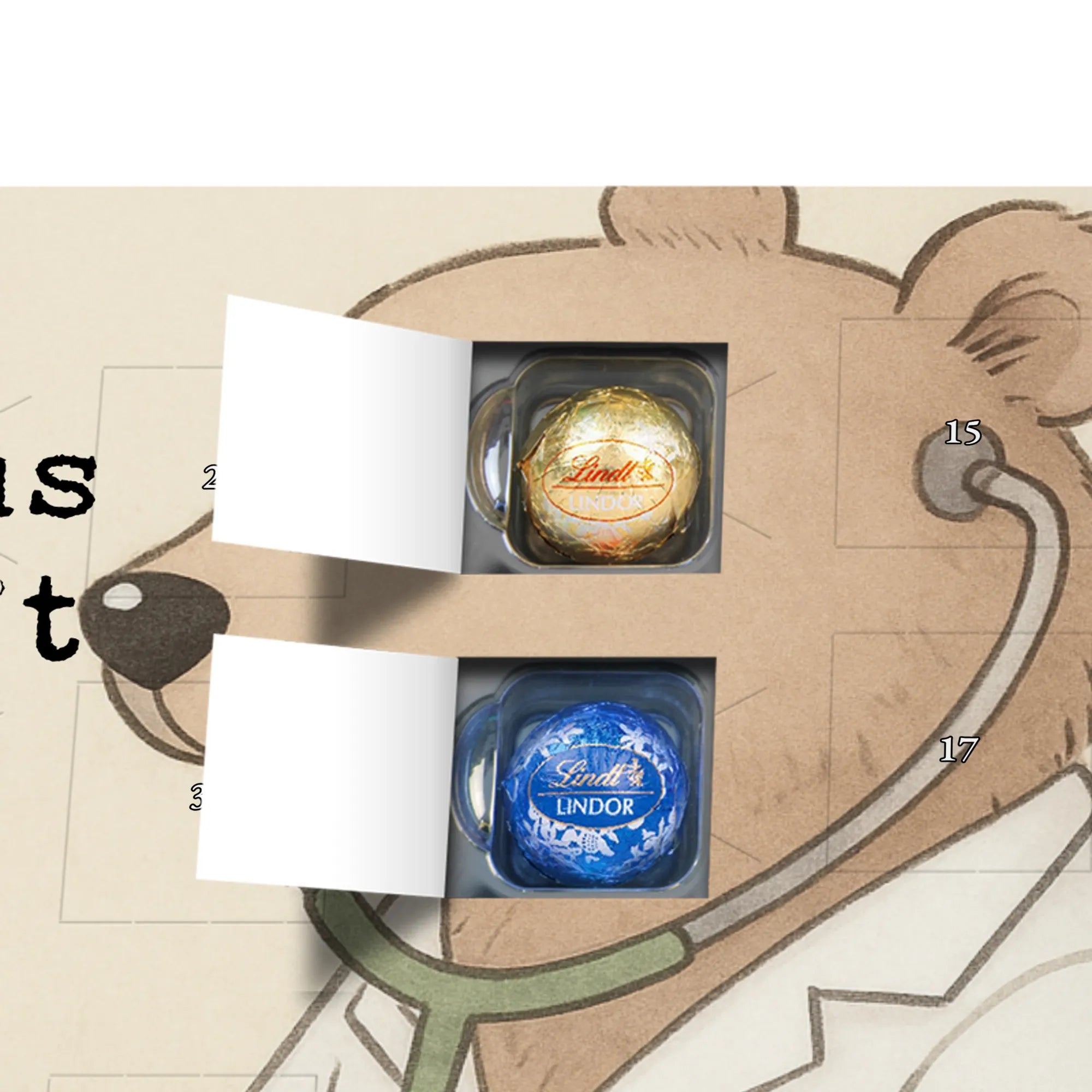 This handy advent calendar 2020 from Mr. & Mrs. Panda is really something very special - it is decorated with wonderful motifs and has the size 24m x 18cm x 2,5cm. It is filled with 24 chocolate balls and costs 14,90€ - the calendar can be hung up or set up using the set-up function on the back. Please note that we also have a larger calendar with delicious chocolate from Hello Lindt.