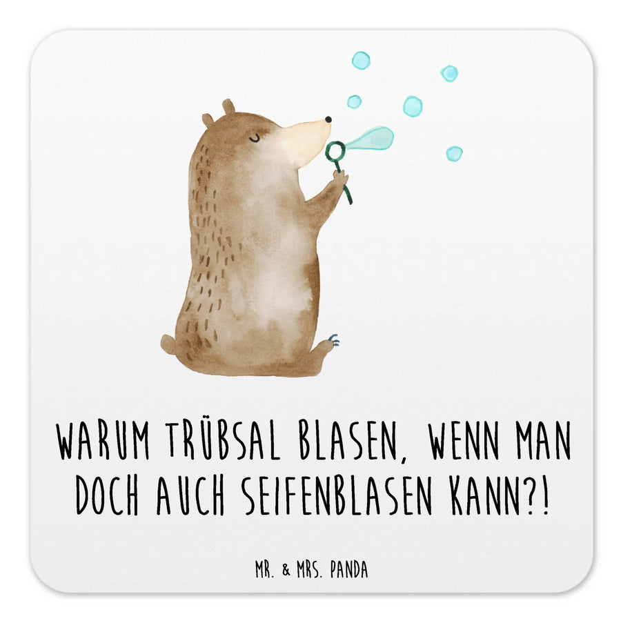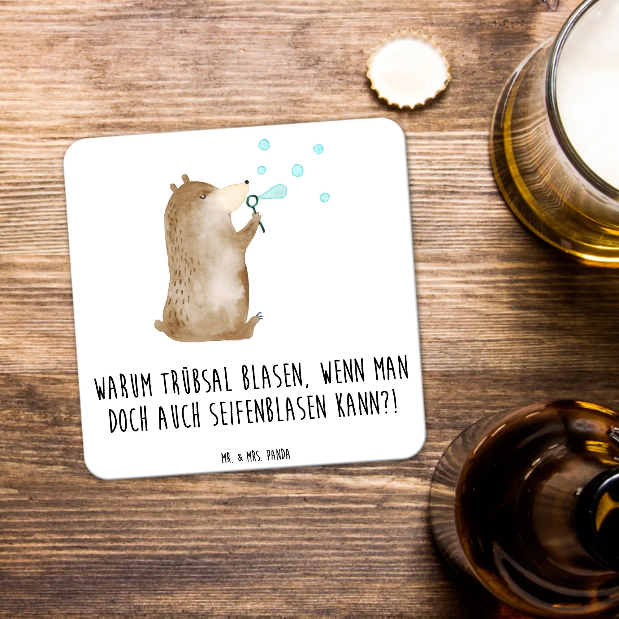 Mr. & Mrs. Panda Untersetzer Set „Bär Seifenblasen“ – ein kleines Stück Lebensfreude für deinen Tisch. Stell dir einen niedlichen Bären vor, der gemächlich Seifenblasen in die Luft pustet, begleitet vom fröhlichen Spruch „Warum Trübsal blasen, wenn man doch auch Seifenblasen kann?!“ 🌸