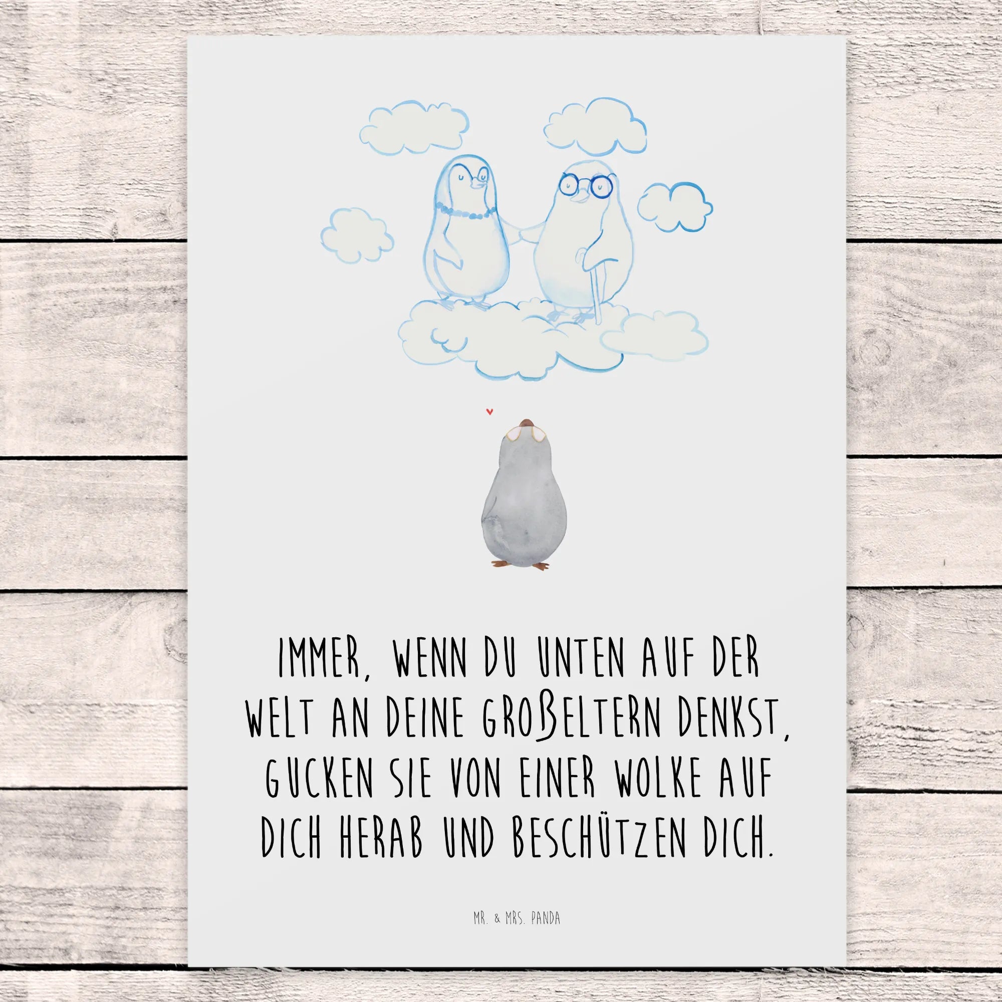 In this delightful motif, we see a little penguin gazing tenderly upwards where its beloved grandparents perch on a cloud. The saying, 'Whenever you think of your grandparents down on Earth, they look down on you from a cloud and protect you,' encapsulates the soothing notion that love never fades, even in loss. The small penguin’s curious eyes reflect the bond that continues to thrive, reminding us that our grandparents are always cheering us on from above. This beautiful image serves as a gentle hug during tough times, assuring us they are with us, sprinkling joy and wisdom into our everyday lives. Embrace the cherished memories and know that your grandparents cradle you in their love, guiding you from afar while you navigate your life's journey.