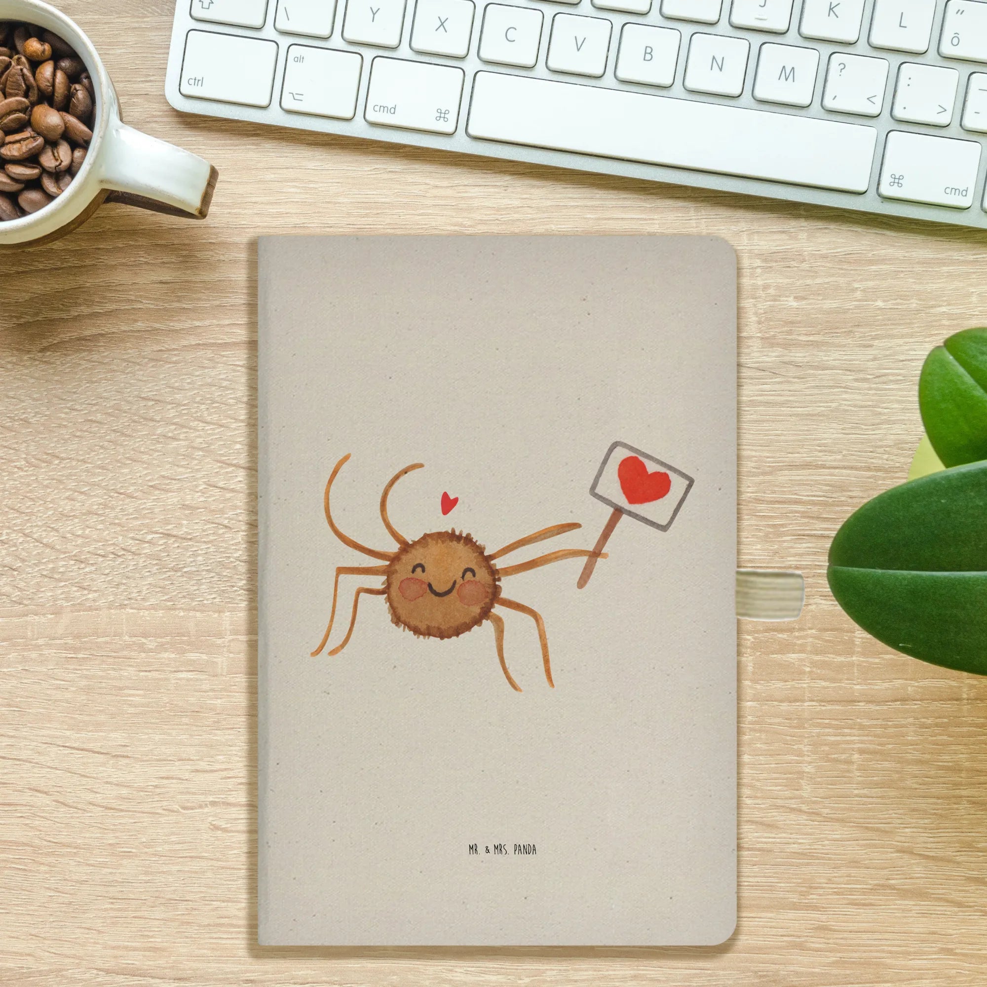 Covered in natural cotton, it features a delightful illustration of the friendly spider Agatha holding a heart-sign, radiating positivity and joy with every glance! Ideal for anyone seeking a little more happiness in their daily life, this notebook is perfect for students, artists, writers, or anyone who enjoys penning down their thoughts.