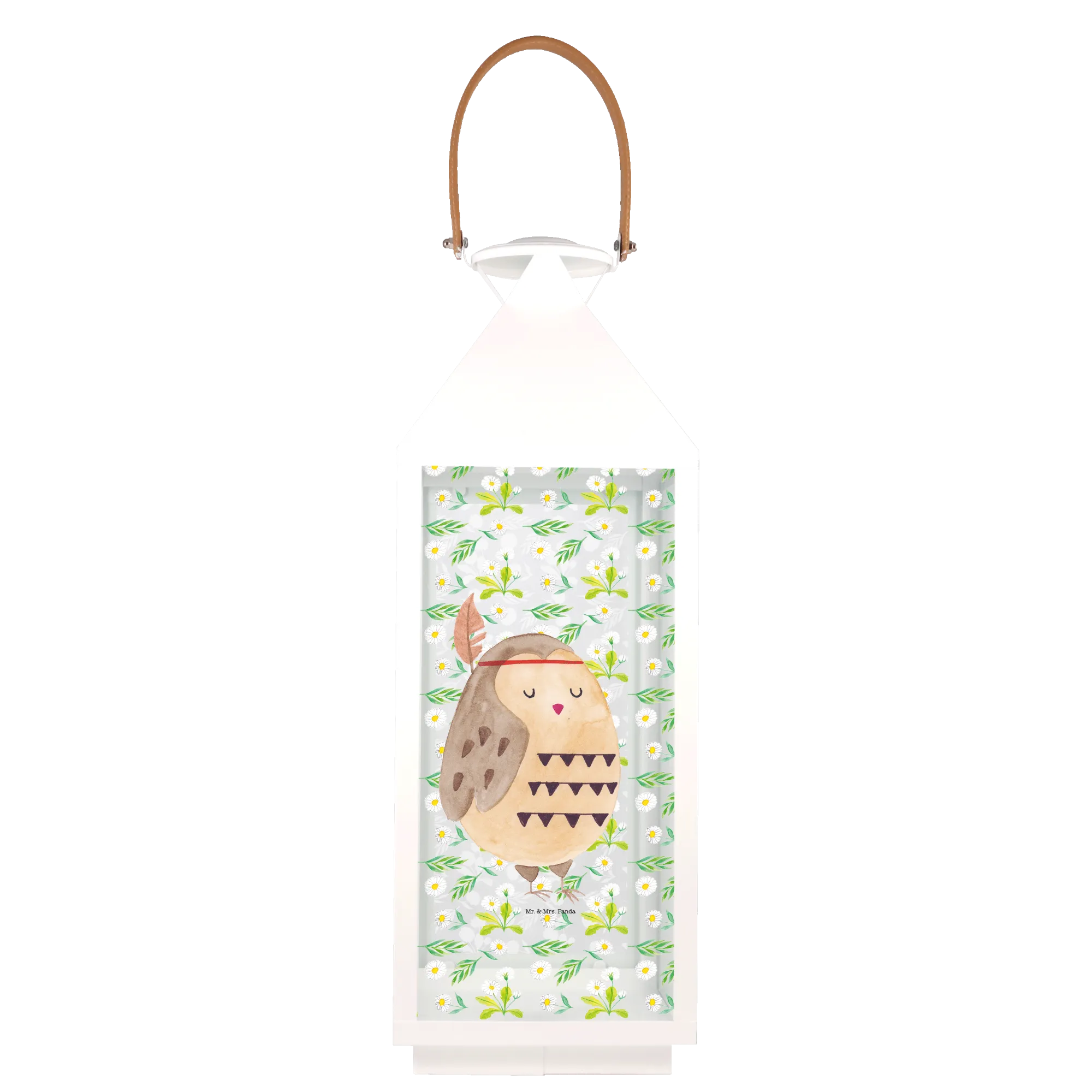 Measuring a generous size, this decorative lantern is crafted from premium metal and adorned with high-quality glass. The design showcases a cheerful owl, proudly displaying a feather on its head, perfectly aligned with the philosophy of 'Life is an Adventure'. This lovely owl motif inspires wanderlust and encourages its viewers to embrace the beauty of life’s journey. With all surfaces printed with the adorable illustrations from Mr. & Mrs. Panda, this lantern is sure to add a touch of whimsy to any environment.