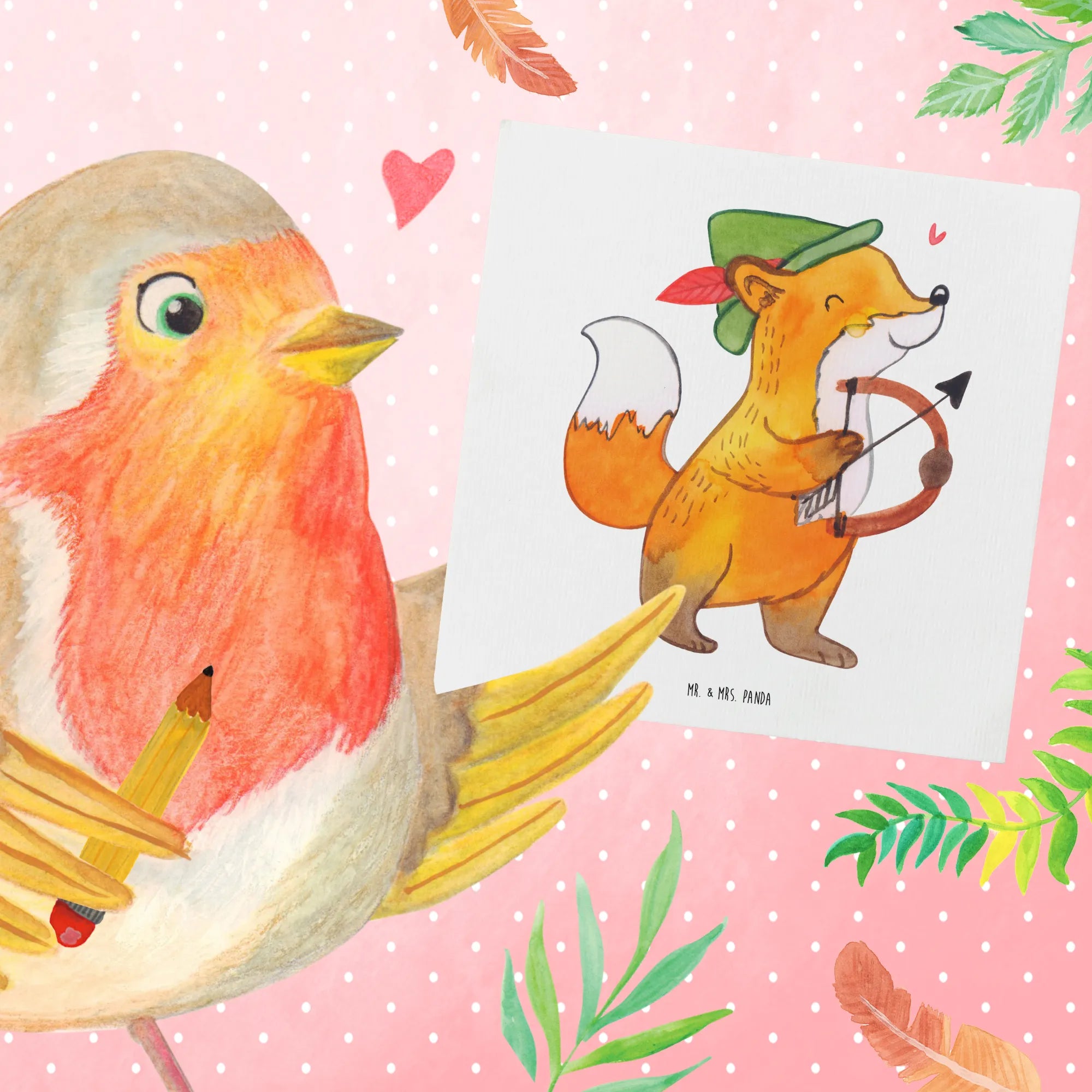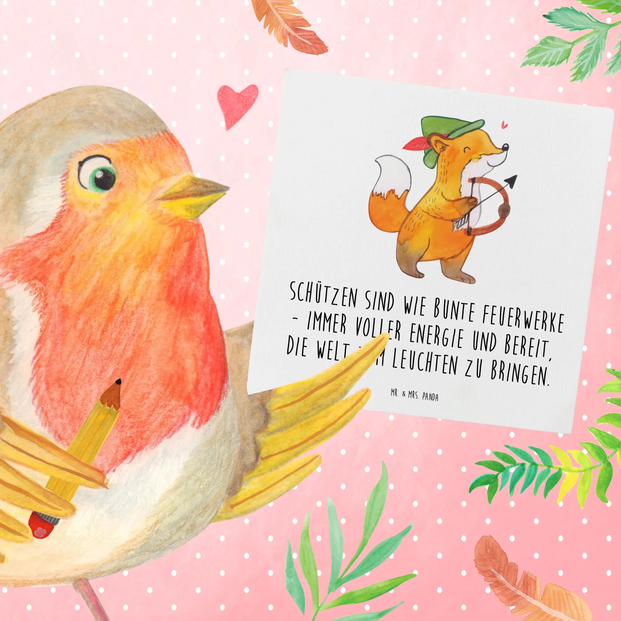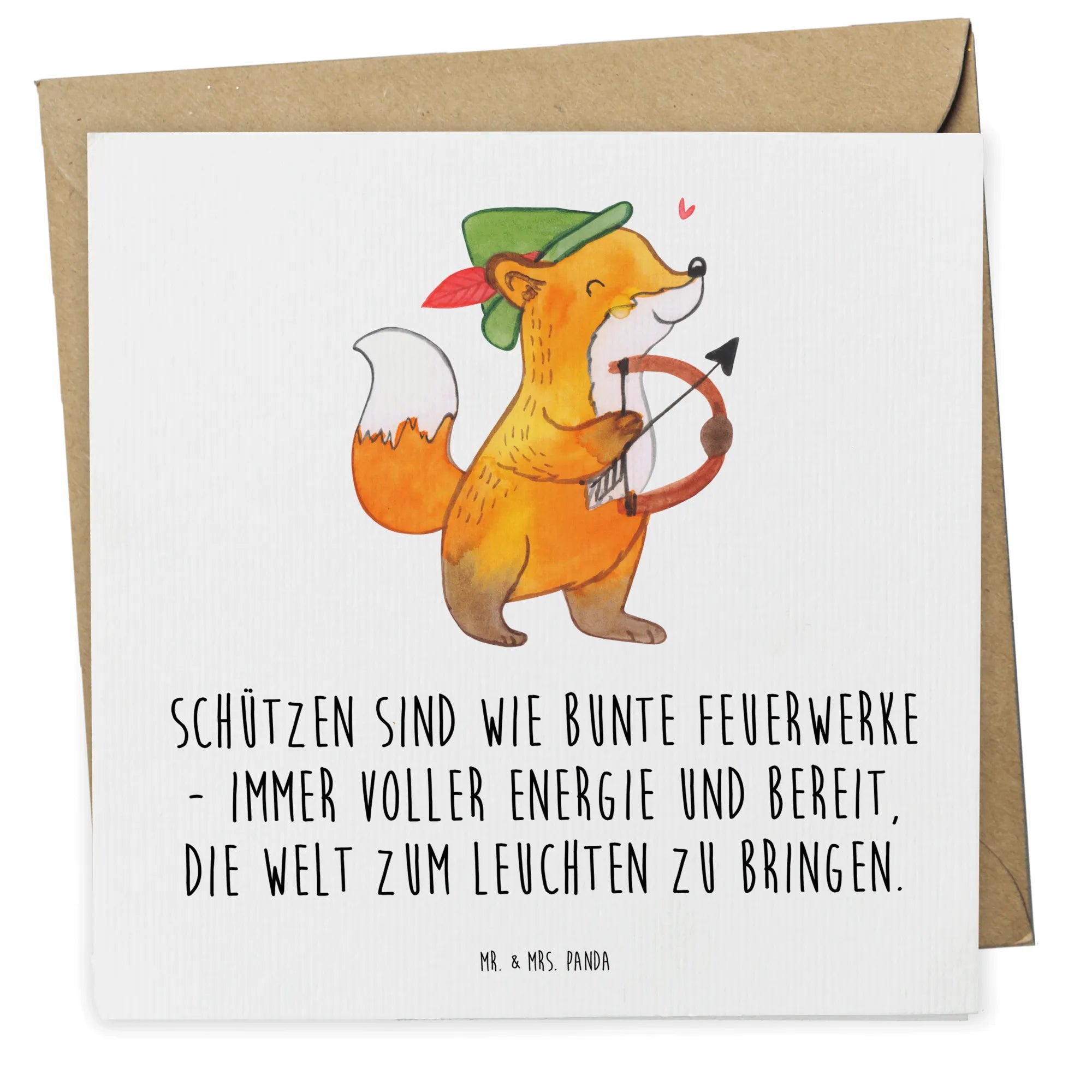 This high-quality square card measures 140 mm x 140 mm and is made from premium 300-gram cardboard, ensuring durability and a luxurious feel. The front of the card showcases an enchanting illustration of a charming fox, reminiscent of a playful archer aiming towards the skies. Hand-drawn with love by Mrs. Panda, the fox embodies the vibrant and energetic nature of Sagittarius.