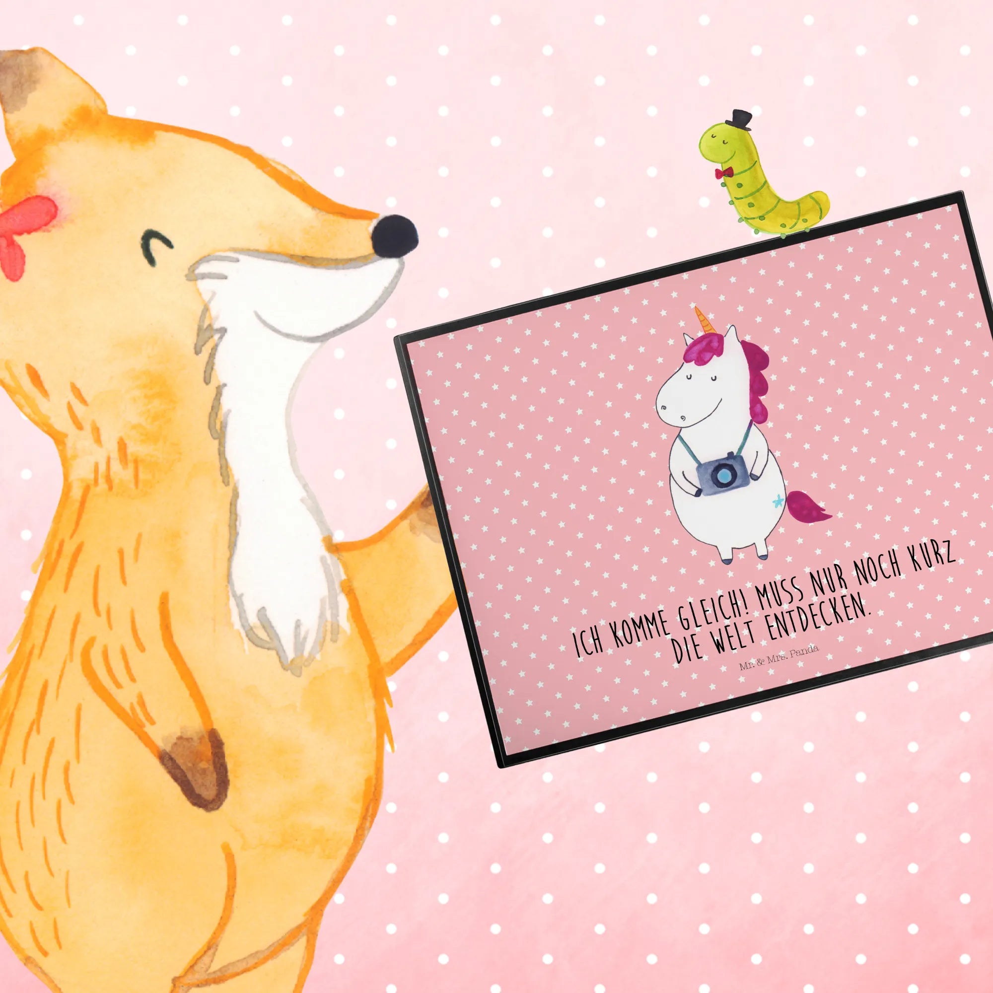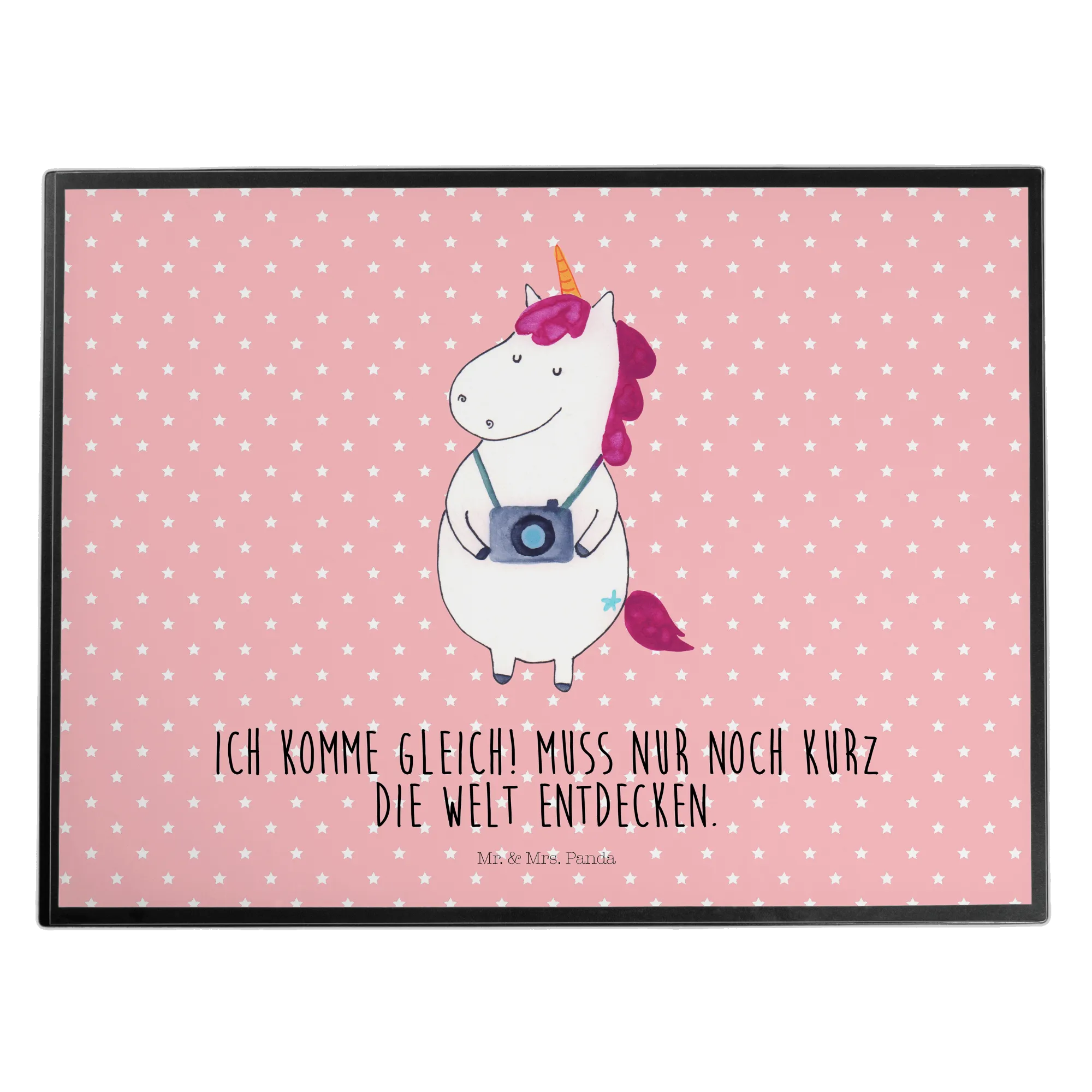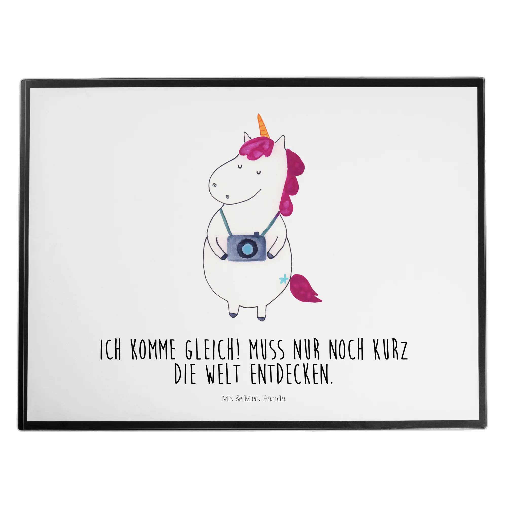 Meet our enchanting Unicorn Photographer, a whimsical being who carries a camera around its neck, always ready to capture the beauty of the world! With a spirit as adventurous as its colorful mane, this unicorn is eager to explore and document all the magical moments life has to offer. The saying 'Ich komme gleich! Muss nur noch kurz die Welt entdecken' perfectly embodies this delightful creature's zest for life. It reminds us to take a pause, immerse ourselves in the wonder around us, and snap a picture of those beautiful memories. Whether you're a traveler, a photography enthusiast, or simply someone who appreciates the lovely charm of unicorns, this motif speaks directly to your heart. Let the Unicorn Photographer inspire you to embark on your own adventures and capture every precious moment along the way.