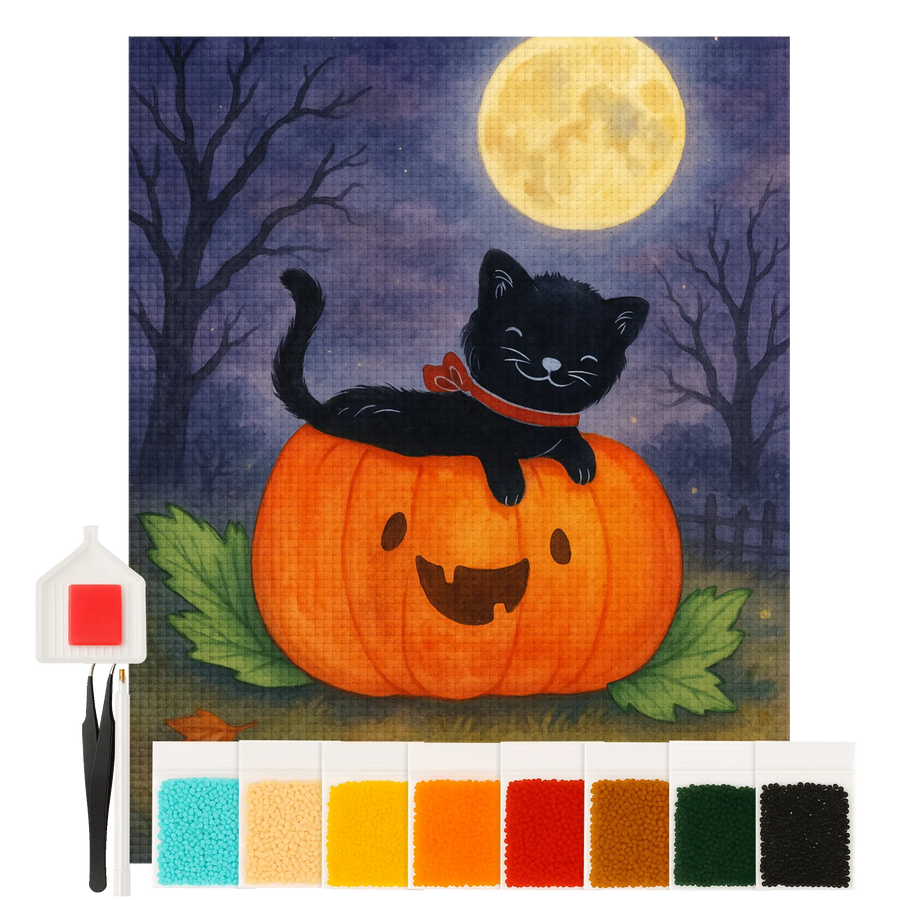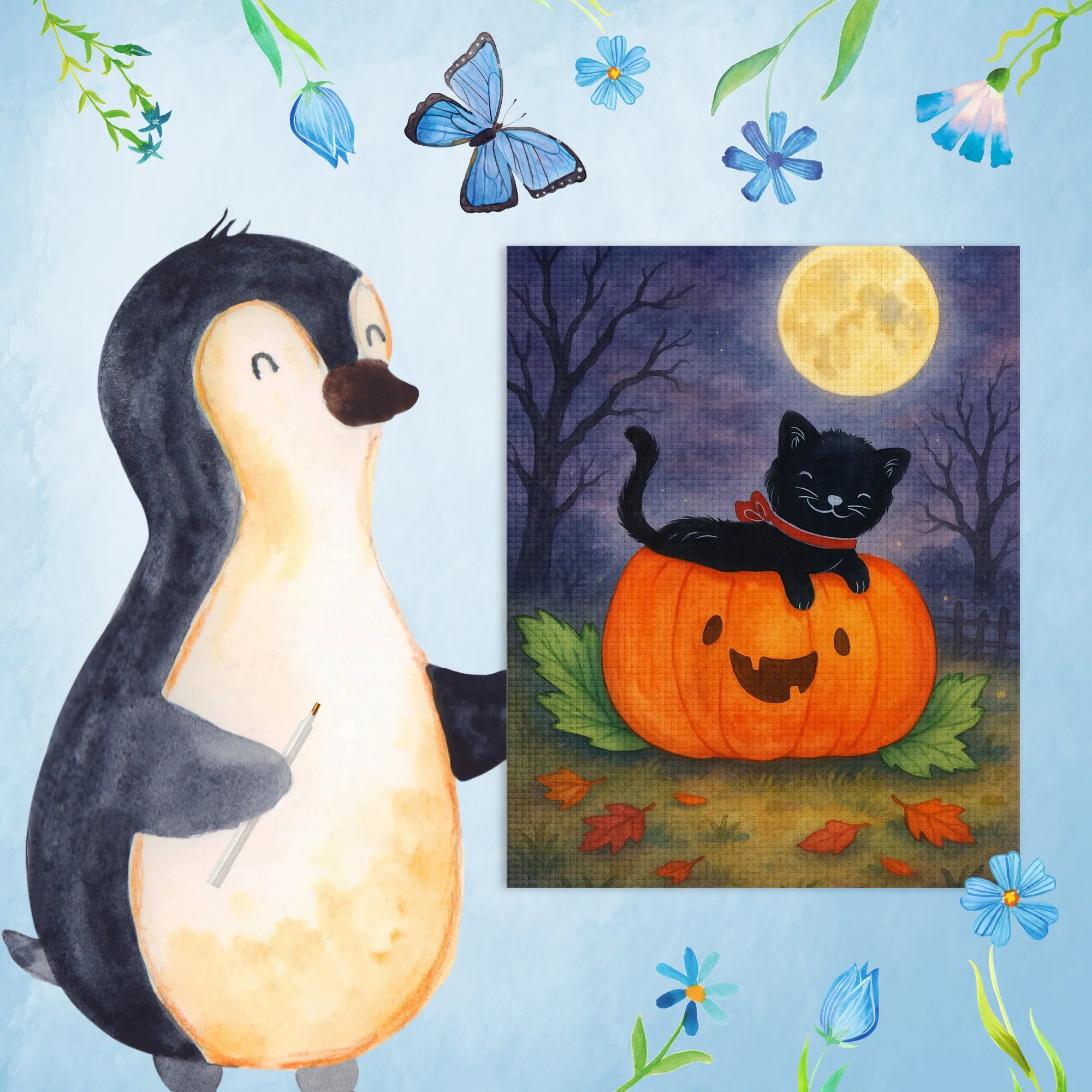 In this enchanting Halloween scene, a delightful black cat, stylishly adorned with a red bow, makes itself comfortable on a gleaming pumpkin. The pumpkin, sporting a friendly grin and lovely green leaves, adds an air of joy and warmth to the picture. This charming motif speaks to the playful spirit of the season, reminding us of cozy gatherings filled with laughter and love. The cat’s serene presence invites you to kick back, relax, and savor the delightful moments of autumn festivities. Perfect for setting a joyful tone in any space, it celebrates togetherness, warmth, and the magical feeling that Halloween brings. Let's embrace the fun and whimsy of the season together!