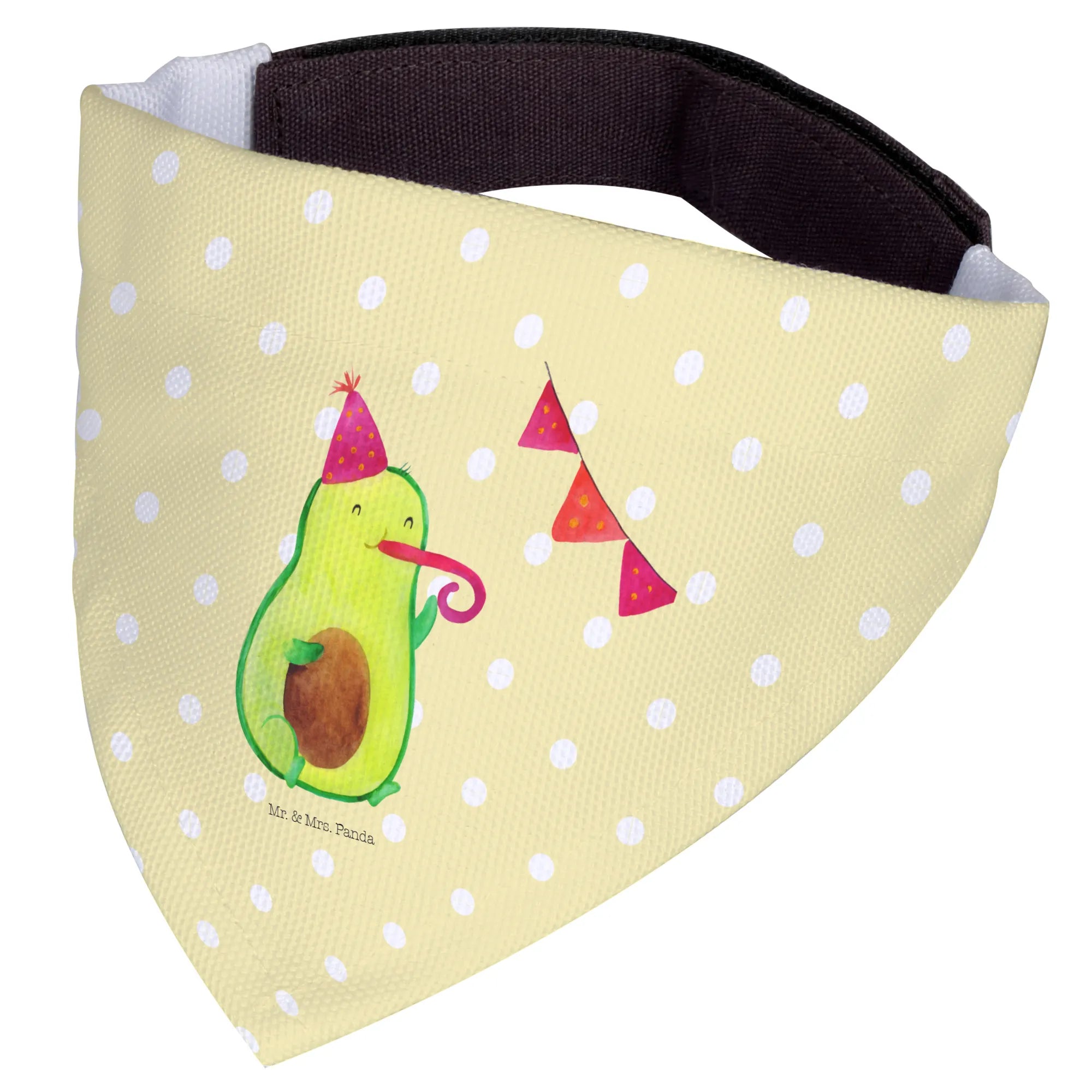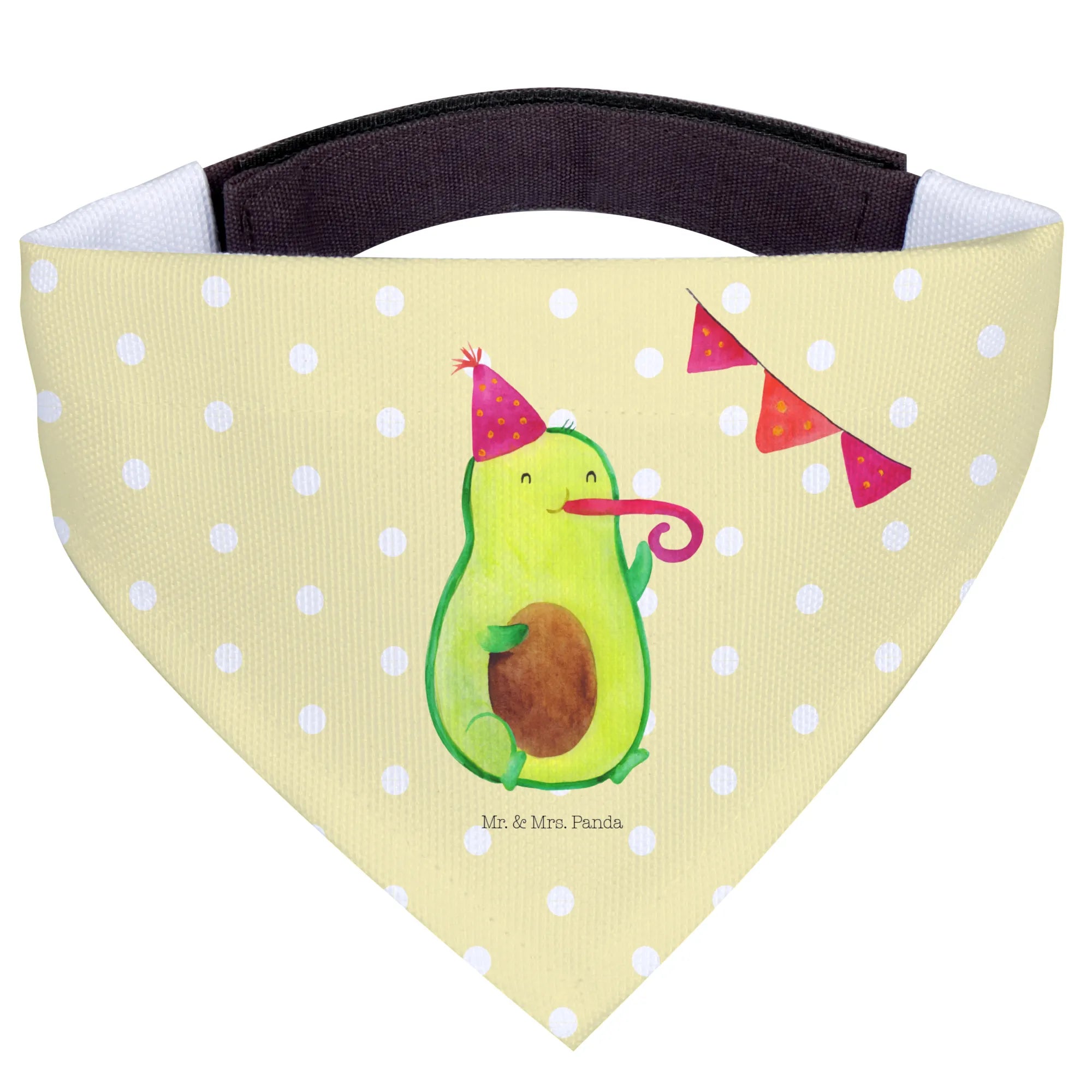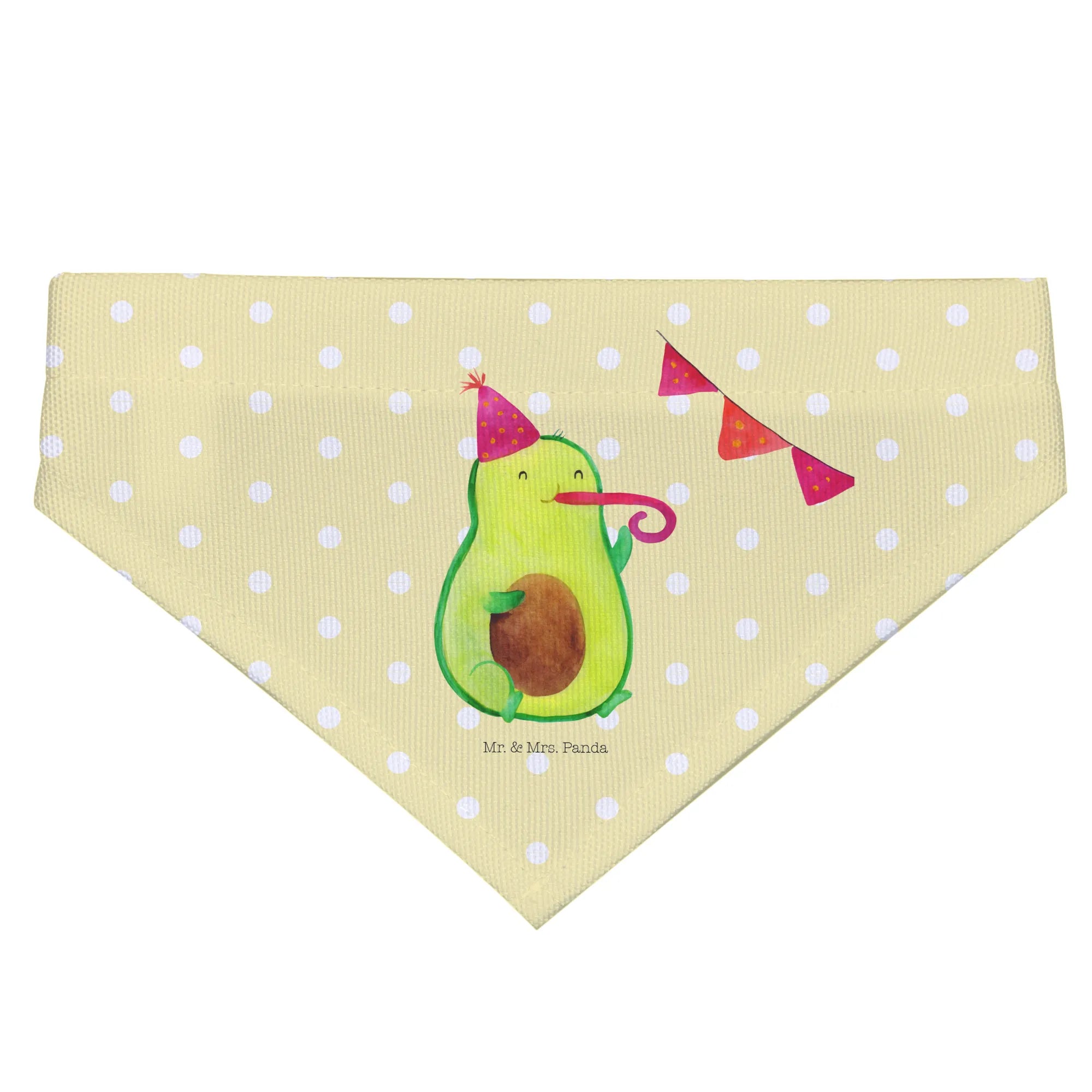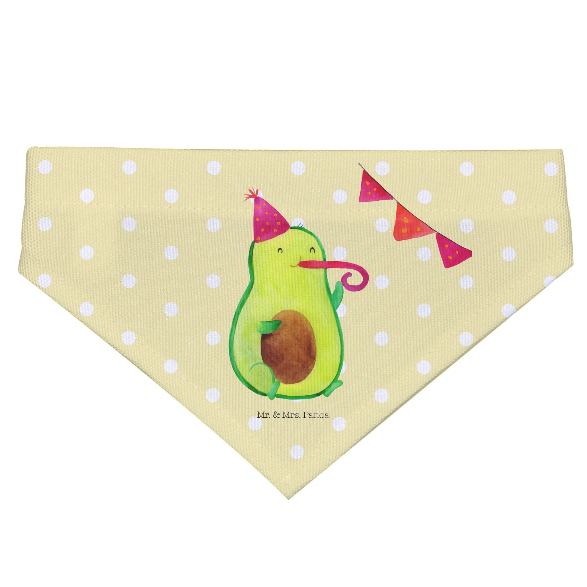 Introducing the adorable Mr. & Mrs. Panda Dog Neckerchief featuring the delightful Avocado Party motif! This charming scarf is not only a stylish accessory for your medium-sized dog but also a wonderful way to celebrate those special moments in life. Hand-drawn with love by Mrs. Panda, this neckerchief showcases a cute avocado wearing a party hat and blowing a party horn, making it festive and fun for any occasion.
