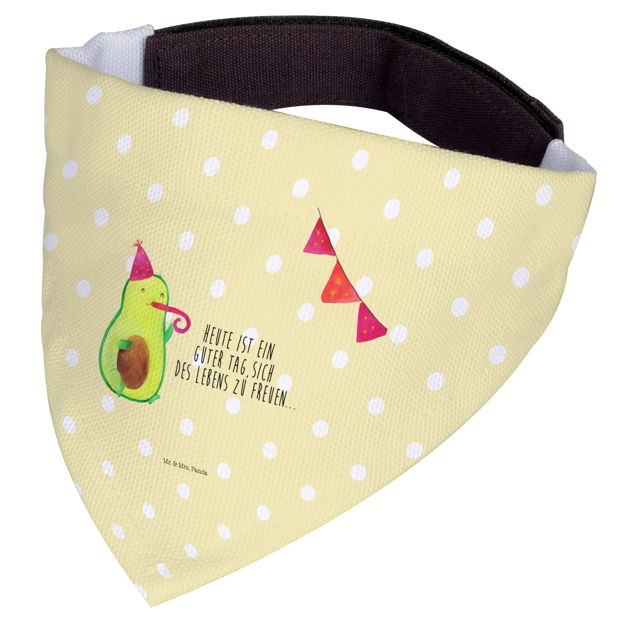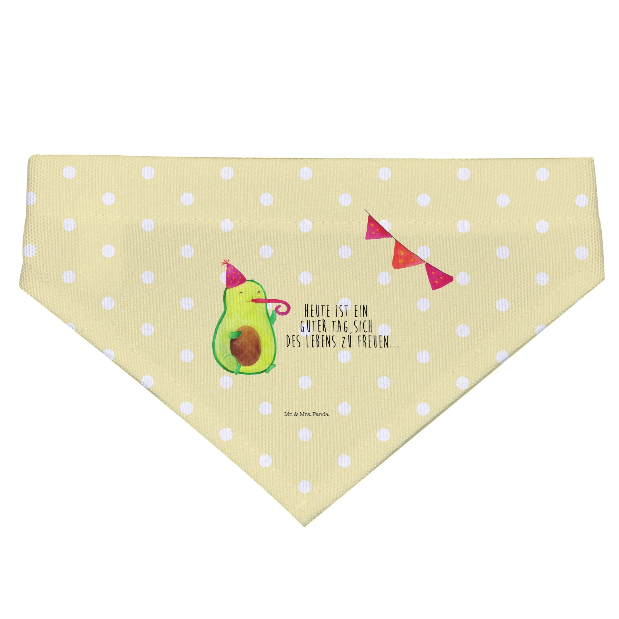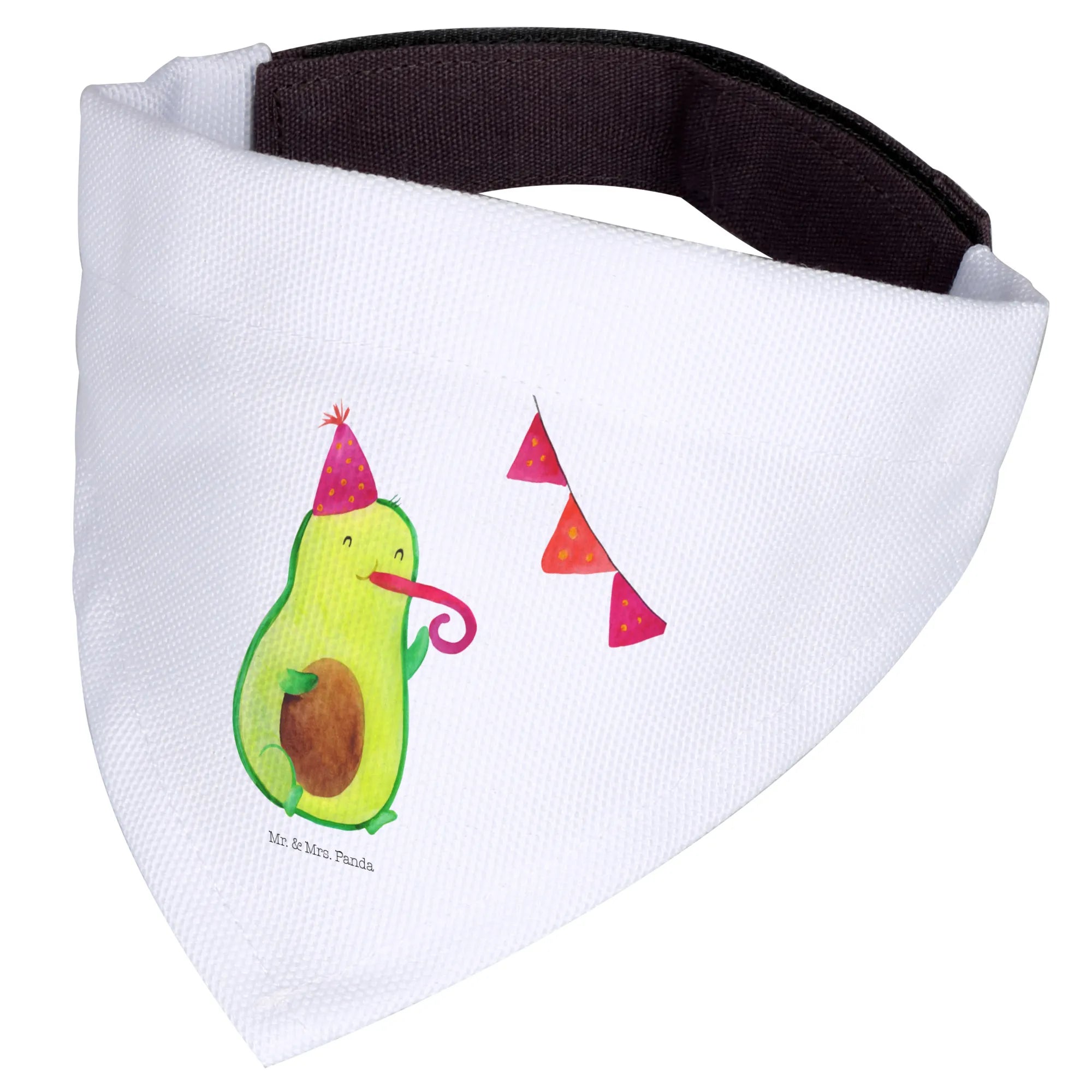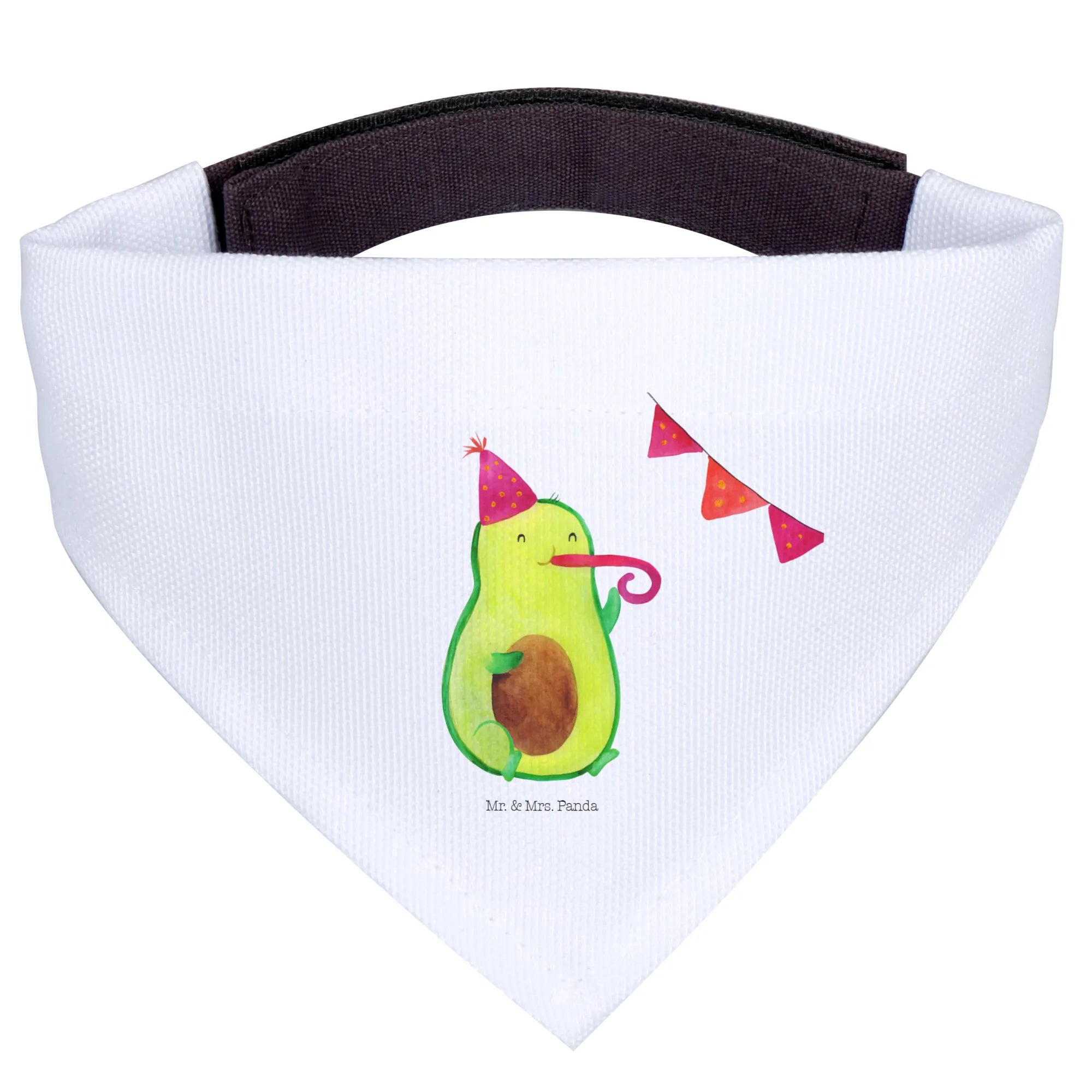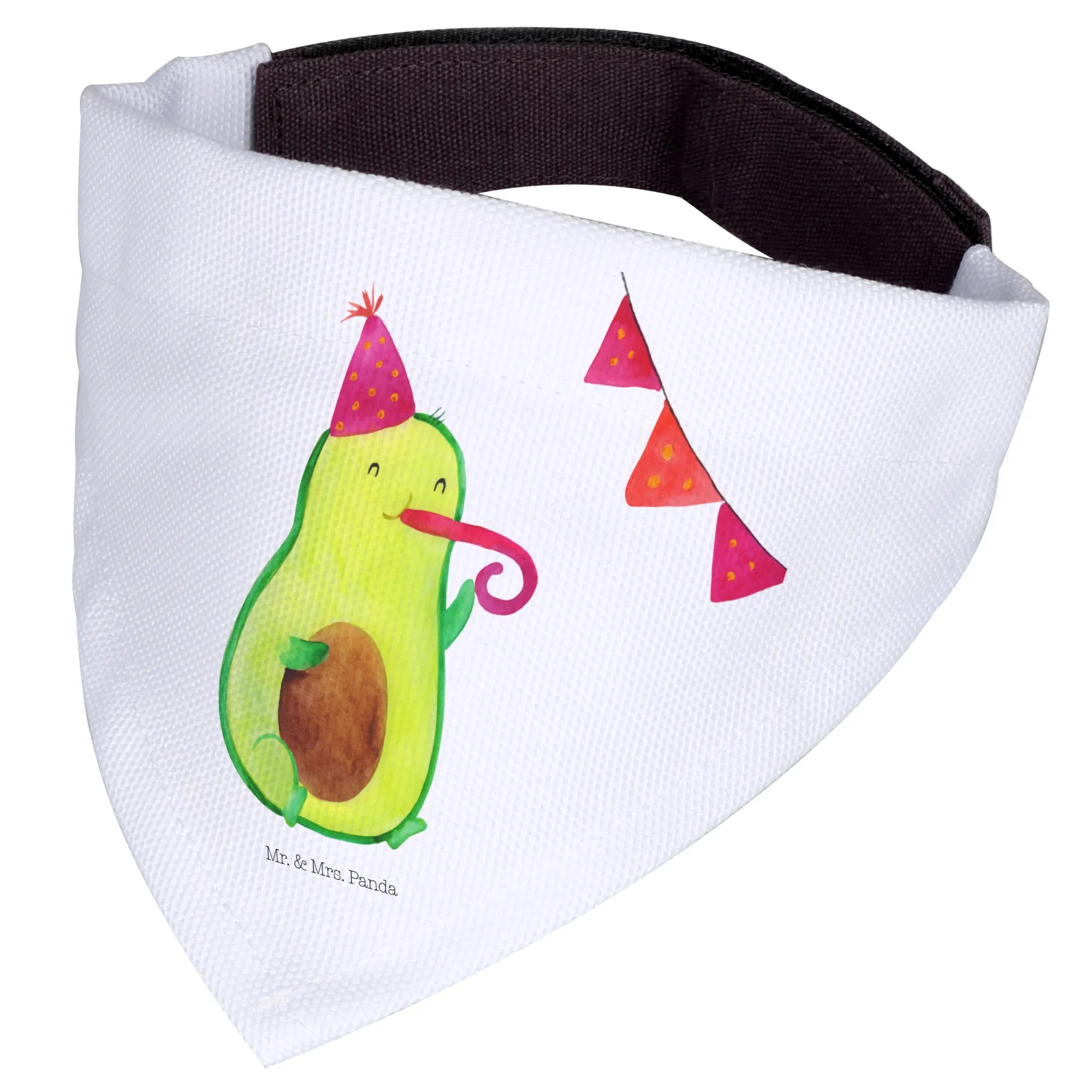 Introducing the adorable Mr. & Mrs. Panda Dog Neckerchief featuring the delightful Avocado Party motif! This charming scarf is not only a stylish accessory for your medium-sized dog but also a wonderful way to celebrate those special moments in life. Hand-drawn with love by Mrs. Panda, this neckerchief showcases a cute avocado wearing a party hat and blowing a party horn, making it festive and fun for any occasion.