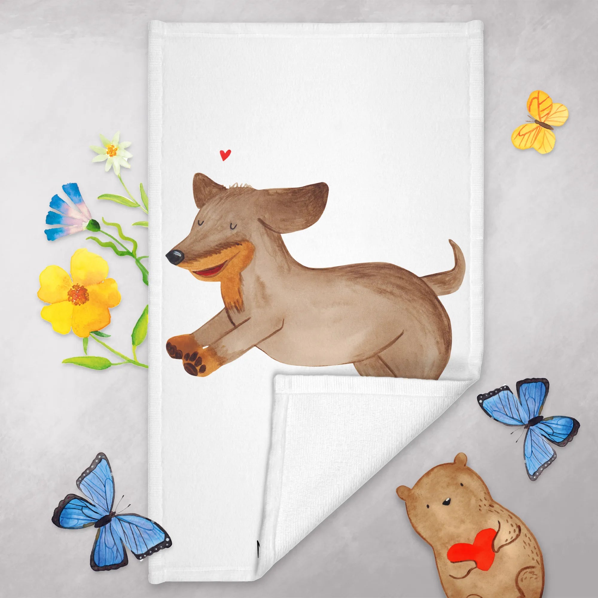 Looking for the perfect gift for a dog lover? Look no further than the delightful Hand Towel featuring our happy Dachshund motif from the special Dog Collection by Mr. & Mrs. Panda! This hand towel is not just a functional bathroom accessory; it's a heartwarming tribute to the unconditional love that exists between humans and dogs. Measuring at a perfect 50 x 100 cm (20 x 40 inches), this towel is made from a fluffy cotton blend that is incredibly soft to the touch, making it ideal for all your face care routines or daily drying needs.
