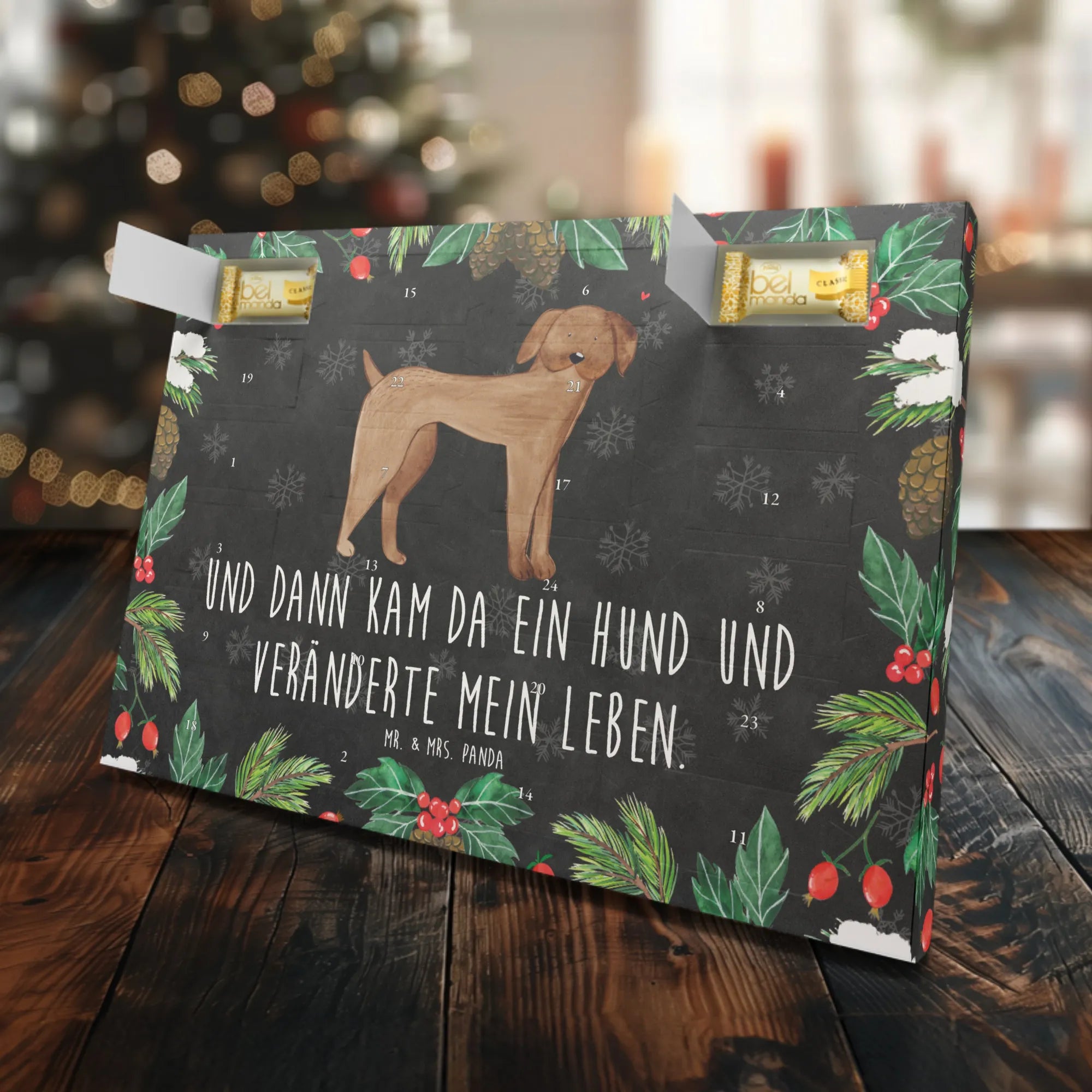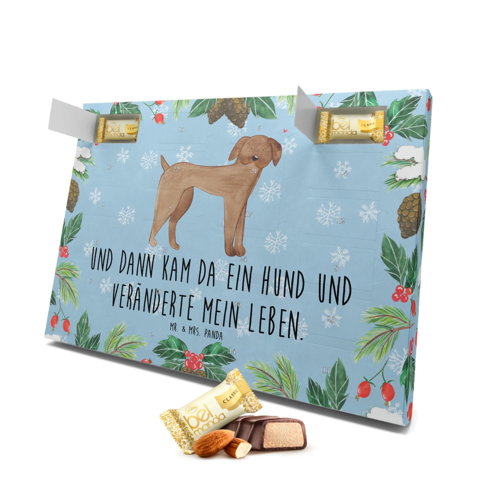 Der Marzipan Adventskalender mit dem Motiv Hund Dogge von Mr. & Mrs. Panda ist das perfekte Geschenk für jeden Tierliebhaber, der die besondere Verbindung zu seinem Hund feiert. Mit dem liebevollen Slogan "Und dann kam da ein Hund und veränderte mein Leben" bringt dieser Adventskalender nicht nur Freude in die Weihnachtszeit, sondern erinnert auch an die wundervollen Momente, die Hundebesitzer mit ihren treuen Begleitern teilen.