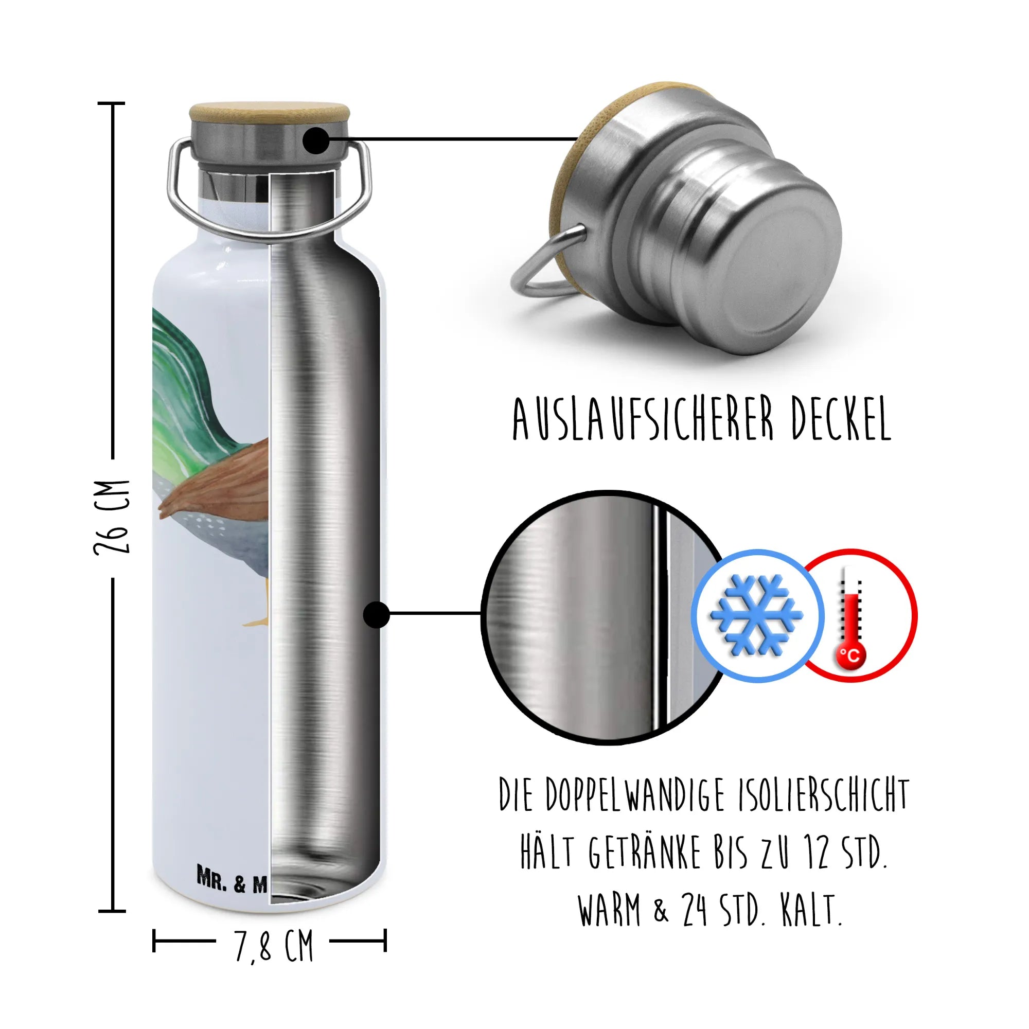 Discover the delightful Drinks Bottle by Mr. & Mrs. Panda! Embrace style and functionality with this beautiful double-walled stainless steel bottle featuring a sleek bamboo lid. Designed to keep your drinks hot or cold for hours, it has a capacity of 750 ml (25 oz) and measures 255 mm (10 in) tall with a 78 mm (3 in) diameter. Perfect for your day at school, work, or outdoor adventures, it’s also great for sparkling drinks! Each bottle showcases unique illustrations and motivational quotes that can uplift your day. Easy to carry and incredibly durable, don’t forget to hand wash to maintain its charm. Hydration has never been this fun!