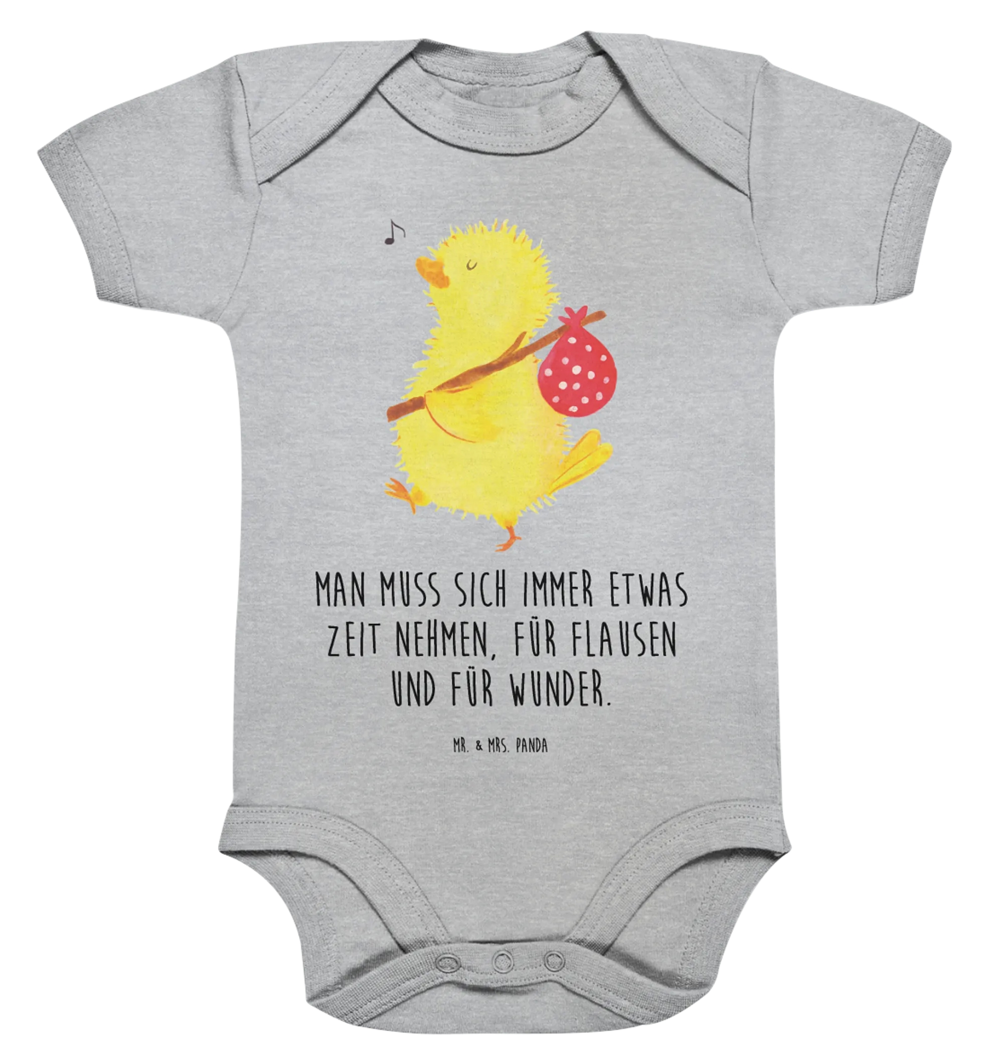 Whether you’re preparing for Easter festivities or celebrating the arrival of a new baby boy or girl, this strampler is a delightful option. The bright colors and the cheerful design capture the essence of springtime and fill the home with the joy of the season. Every time you dress your little chick in this outfit, you'll be reminded to take time for fun and miracles, perfectly encapsulated in our slogan, "Man muss sich immer etwas Zeit Nehmen, für Flausen und für Wunder."