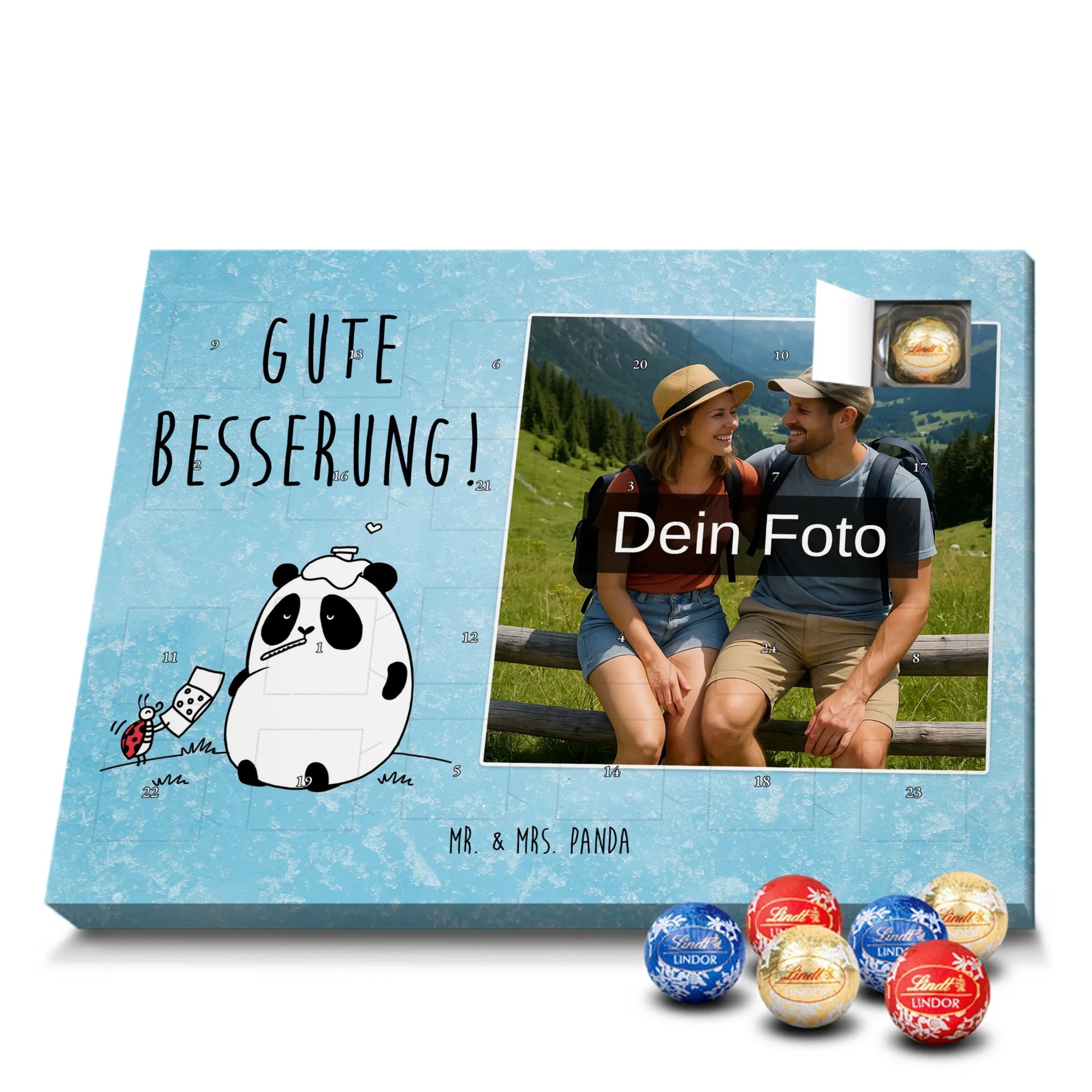 Entdecke unseren charmanten Personalisierter Schoko-Foto Adventskalender von Mr. & Mrs. Panda – ein liebevolles Geschenk für Freunde, Familie oder dich selbst. Aufdrucke mit süßen Motiven und herzlichen Sprüchen begleiten dein persönliches Foto, das du individuell hochlädst. Achte bitte auf eine ausreichende Auflösung des Bildes und einen passenden Bildausschnitt, damit das Druckbild klar bleibt. Wir weisen darauf hin, dass Fotos nicht nachbearbeitet oder zugeschnitten werden; achte daher auf Bildrechte und Zustimmung der abgebildeten Personen. Die Verarbeitung überzeugt durch eine seidenmatte Oberflächenveredelung und bedruckte Seitenflächen; dadurch wirkt der Kalender sehr hochwertig. Der Kalender ist vielseitig: Du kannst ihn sowohl aufstellen als auch aufhängen. Maße: 233 mm x 178 mm x 24 mm. Gefüllt mit Lindt Lindor Markenschokolade – 24 einzeln verpackte Markenschokoladen Kugeln in den Geschmacksrichtungen Vollmilch, Feinherb und Weiße Schokolade. Zutaten und Allergene sind auf der Verpackung angegeben; es kann Spuren von Haselnüssen und Mandeln geben. Hinweis: Personalisierte Foto-Artikel sind vom Umtausch ausgeschlossen.