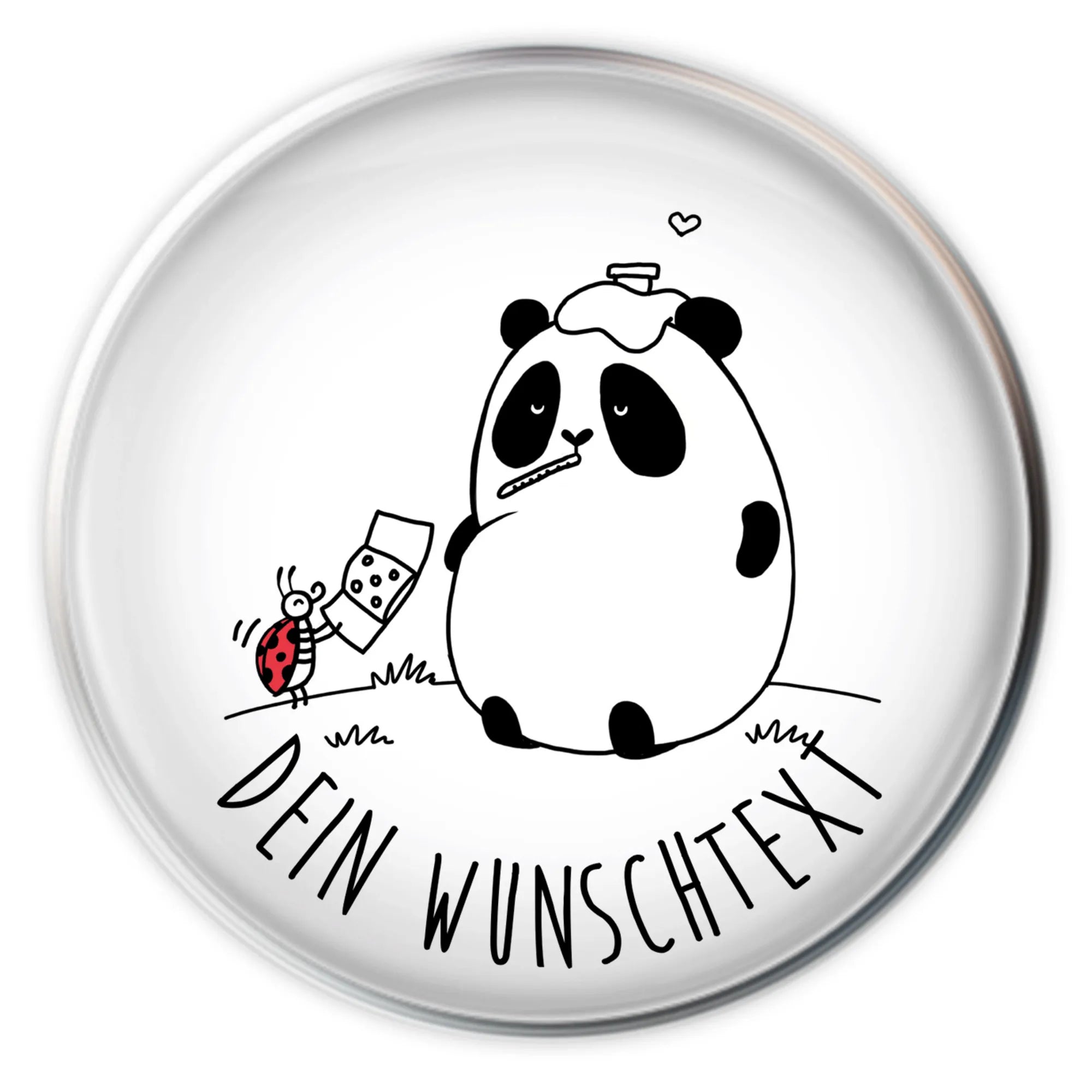 Meet our delightful panda friend, snuggled up with a thermometer perched in his mouth, sitting on a cozy green meadow. This lovable little bear isn't feeling his best, but he's not alone—his faithful companion, a cheerful ladybug, is right by his side, offering a band-aid as a sweet gesture of care and friendship. With the slogan 'Get Well Soon!' ringing in the air, this motif is a wonderful reminder that a little support can go a long way when you’re under the weather. Together, they share the warmth and joy of companionship, showing that even on tough days, love and laughter can lighten the heart. Perfect for sending a heartfelt message to anyone needing a bit of cheer, this design creates a sense of comfort and hope, encapsulated by the charm of Mr. & Mrs. Panda's playful spirit.