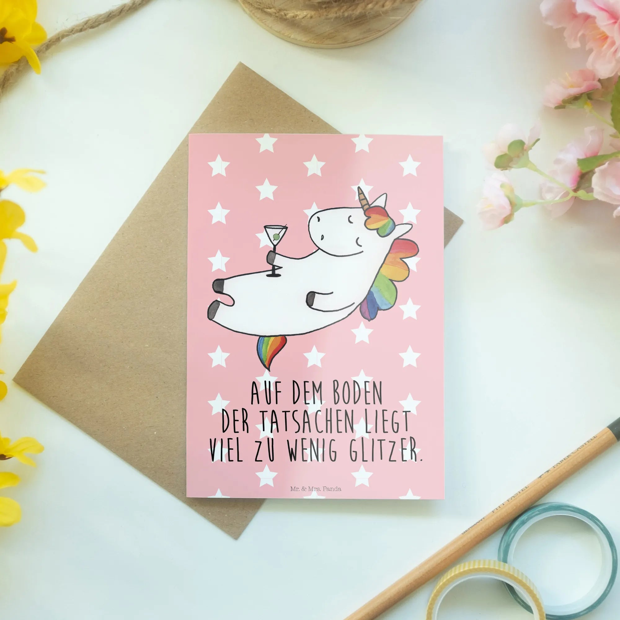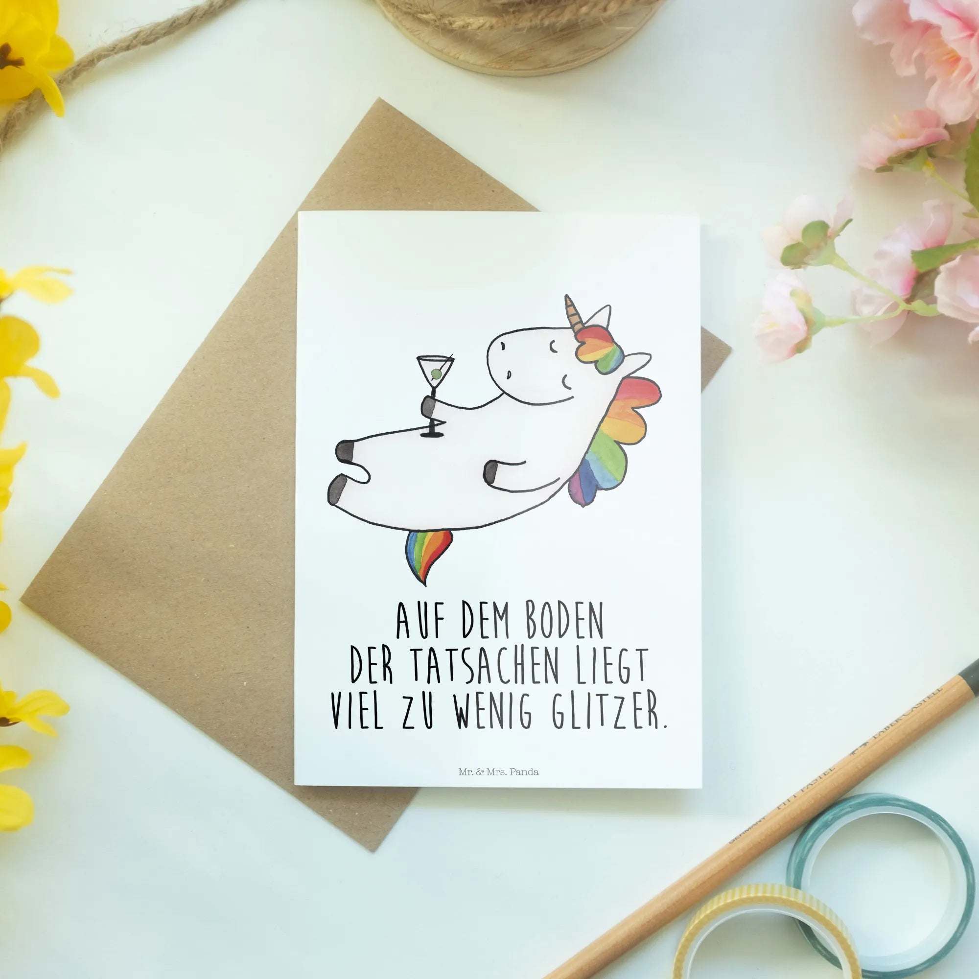 This Unicorn Cocktail card is perfect not only for birthdays but also as a charming invitation to a cocktail party or as a delightful little surprise just to say "I’m thinking of you!" Whether you celebrate with rum, caipirinha, or champagne, this card adds that extra sparkle to your festivities. The phrase on the card, "Auf dem Boden der Tatsachen liegt viel zu wenig Glitzer," reminds us of the fun and glitter we need more of in our lives.