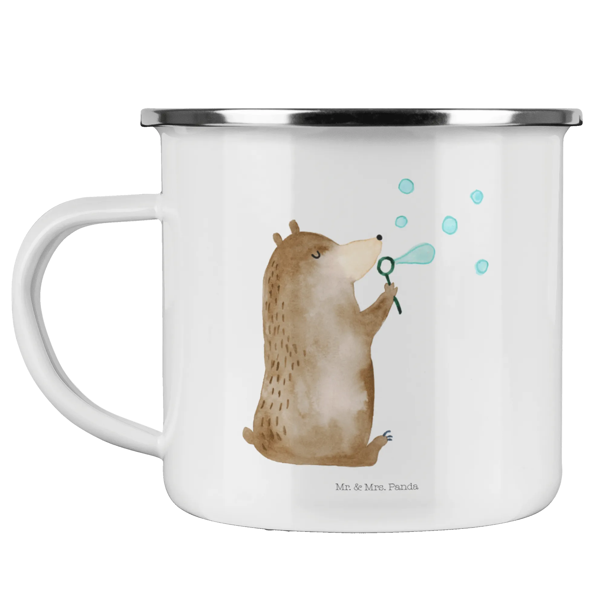 If you're looking for a delightful and practical gift for camping enthusiasts, the Enamel Camping Mug featuring our charming Bear Soap Bubbles design is your perfect match! This beautiful and sturdy enamel mug, a product of Mr. & Mrs. Panda, is more than just a drinking vessel—it's a statement piece for every adventure lover. Imagine taking a sip of your favorite hot cocoa while sitting around a campfire, with the delicate bear blowing bubbles showcased on your mug. It's not just about a drink, it's about the joy and laughter that comes with it!
