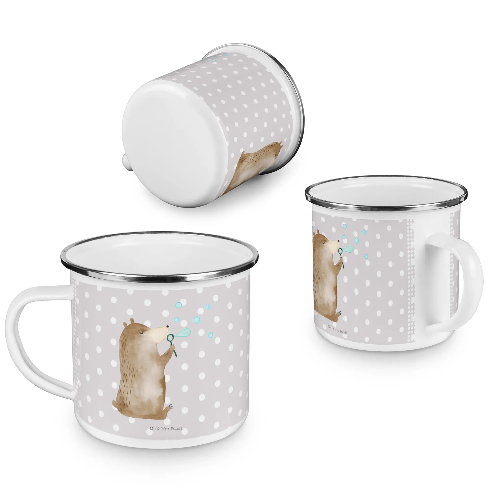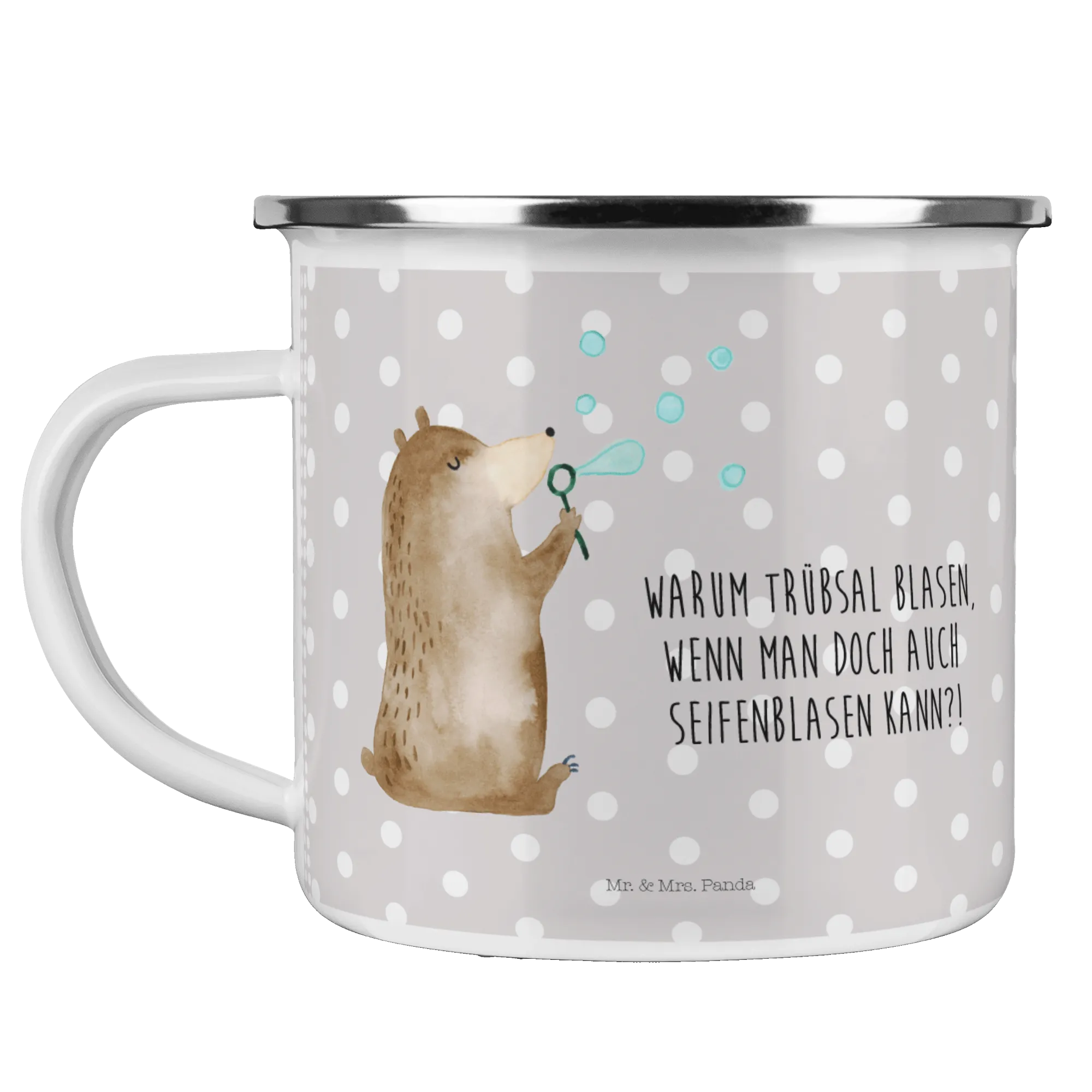 Gifting this enamel camping mug is an excellent choice for various occasions—imagine surprising a friend for their birthday, rewarding a colleague for a job well done, or just saying "thank you" to someone special. The adorable bear design accompanied by the playful sentiment "Why mope when you can blow bubbles, too?!" makes it a striking conversation starter and a reminder to always look on the bright side. The mug is also a lovely gift for those who adore bears and teddy bear themes, fitting perfectly into a cozy kitchen or a camping setup.