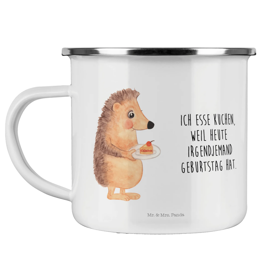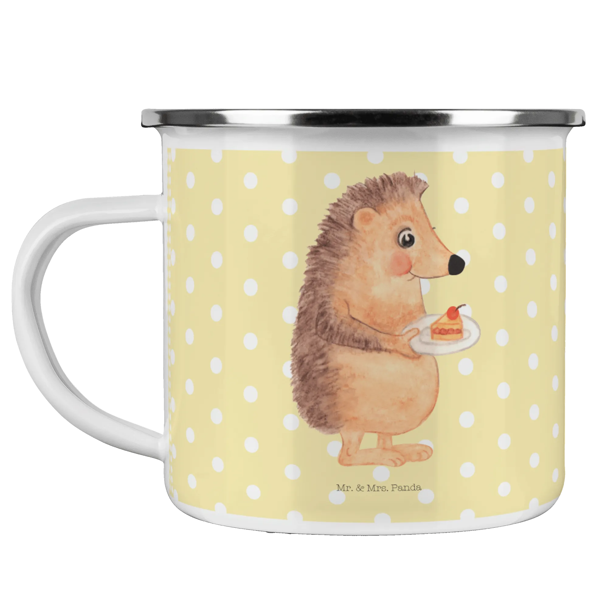 Introducing the enchanting Enamel Camping Mug featuring a delightful hedgehog with a piece of cake from the lovely Small World collection by Mr. & Mrs. Panda! This charming outdoor cup is not only a perfect companion for your camping adventures or cozy hikes, but it also adds a sprinkle of joy with its cute and funny design.