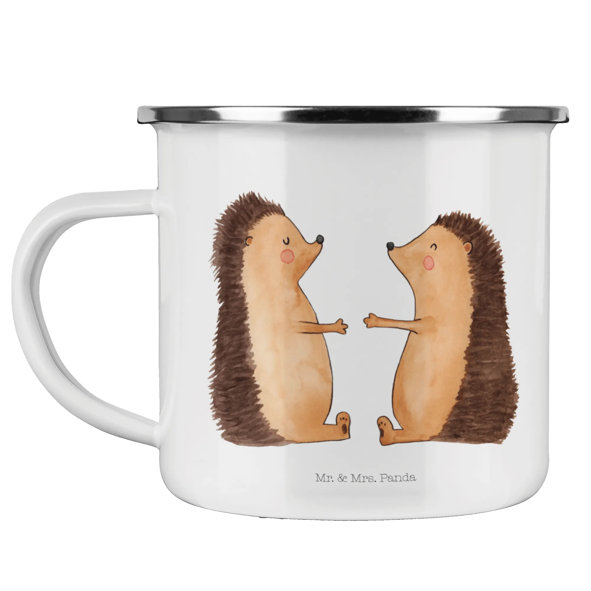 Enamel camping mug Hedgehogs in love - with a saying - White