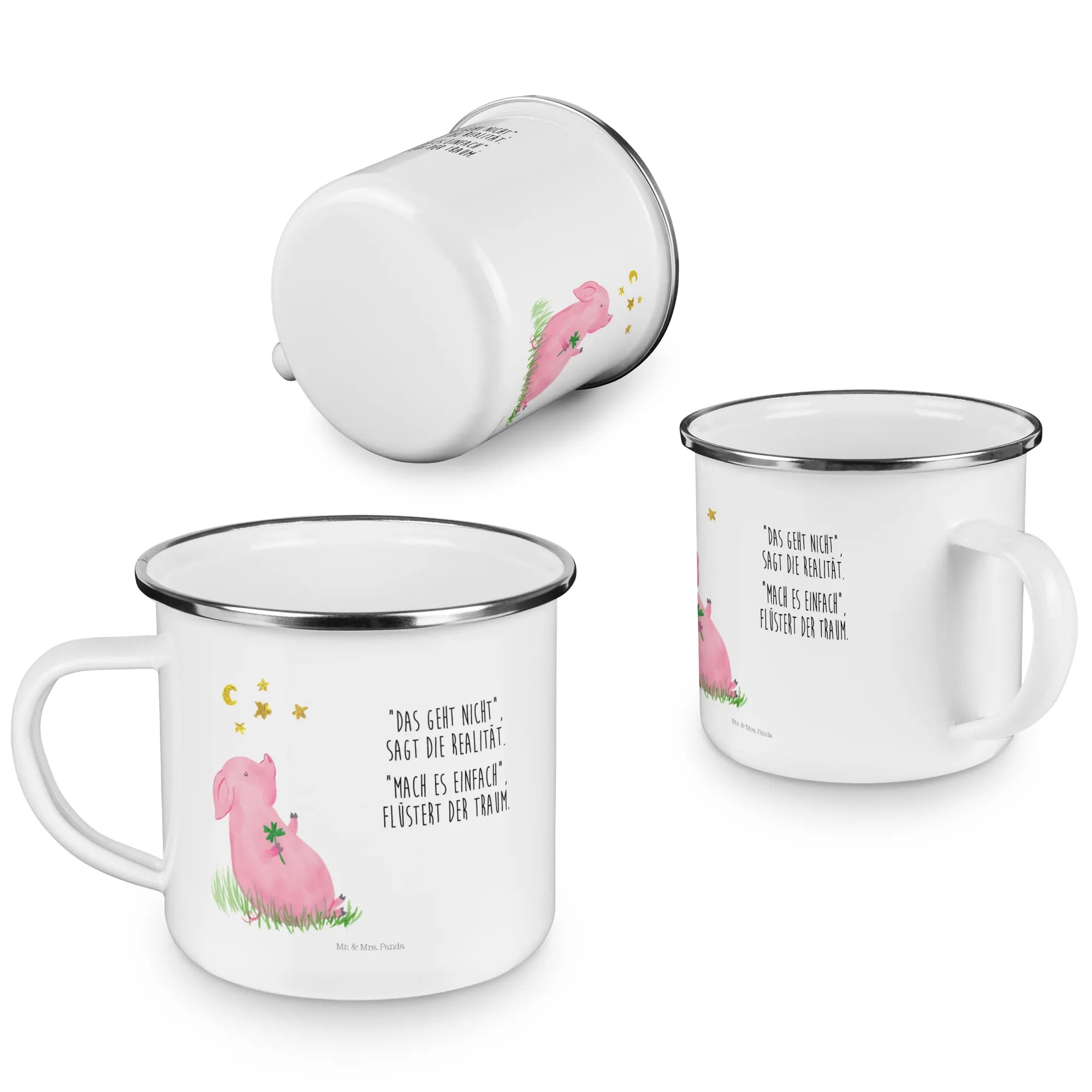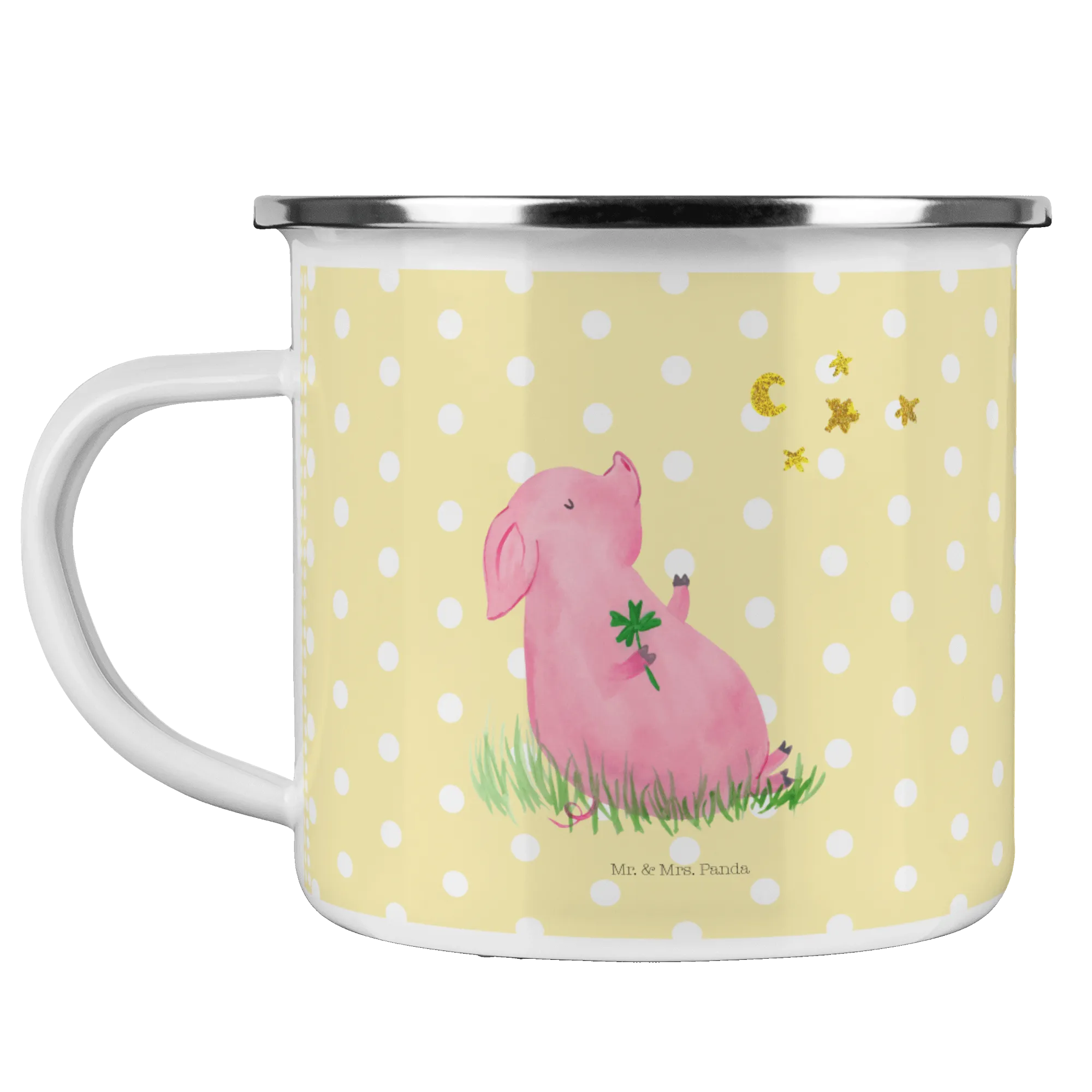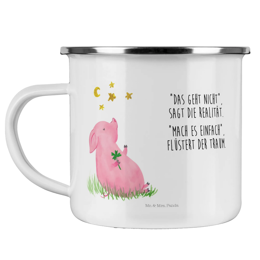 Introducing the delightful Enamel Camping Mug featuring the cute and captivating "Lucky Pig" motif from the beloved Small World collection of Mr. & Mrs. Panda! This charming little piggy, holding a four-leaf clover—a symbol of luck and happiness—is here to add a sprinkle of joy to your outdoor adventures.