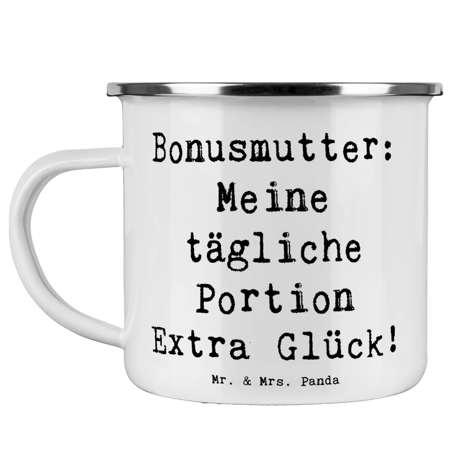 Enamel camping mug Saying Bonusmutter: Meine tägliche Portion Extra Glück!