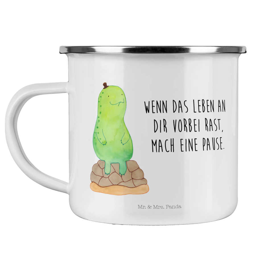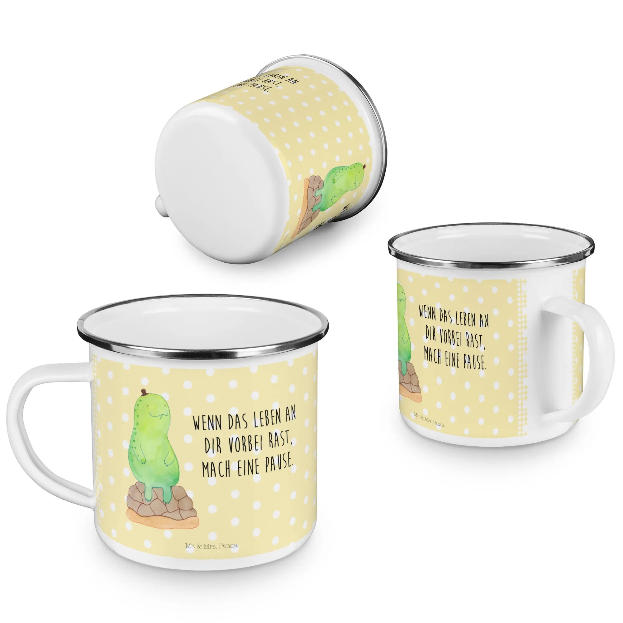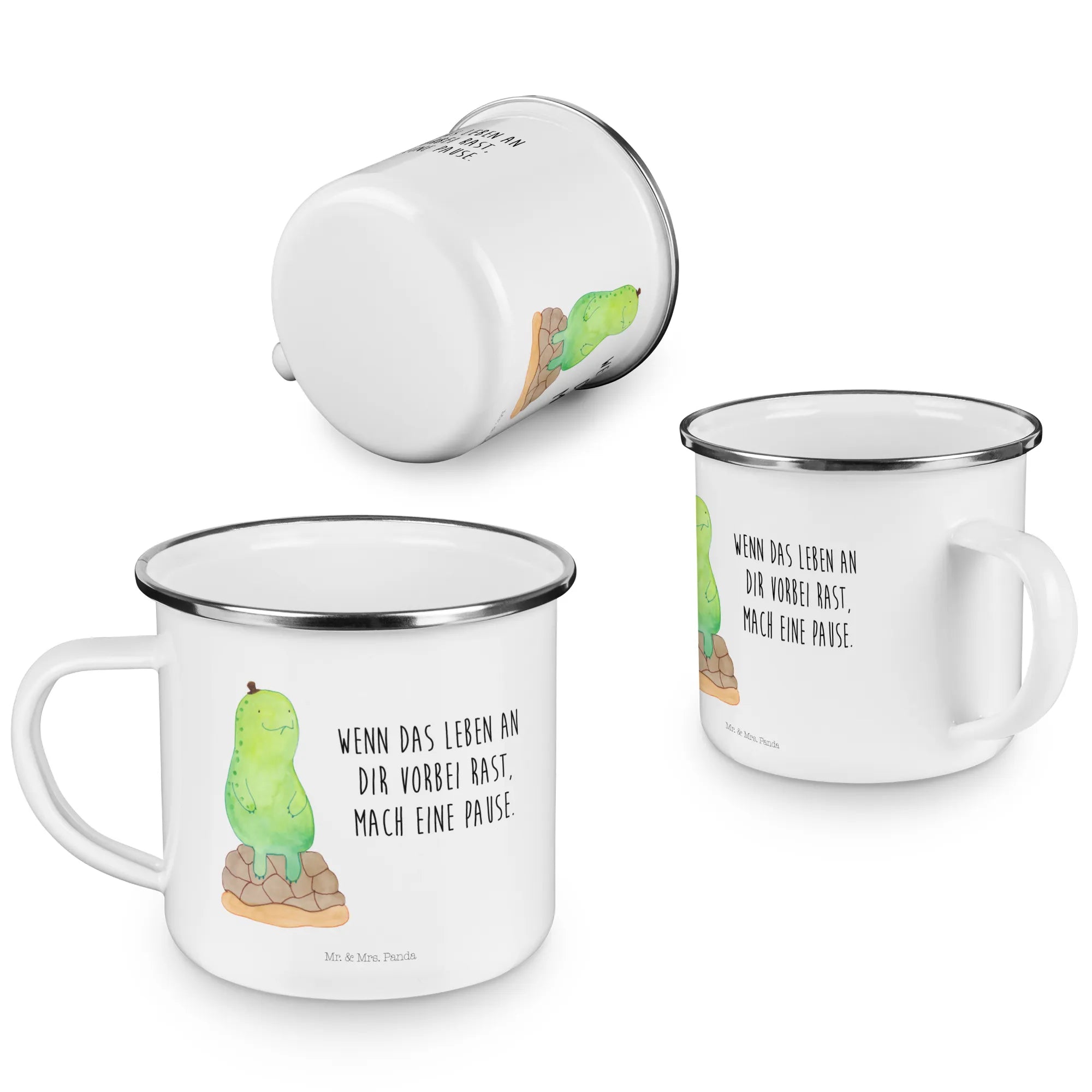 What better way to enjoy your favorite hot beverage while taking a much-needed break than with a cute, illustrated turtle reminding you to decelerate and embrace the slower moments in life? With the slogan, "If you feel like life’s passing you by, just take a break," this camping mug is a gentle nudge to pause and appreciate the simplicity of life. Whether you’re hiking through the mountains, lounging by the campfire, or simply relaxing on your balcony, this enamel mug will make every sip feel special.