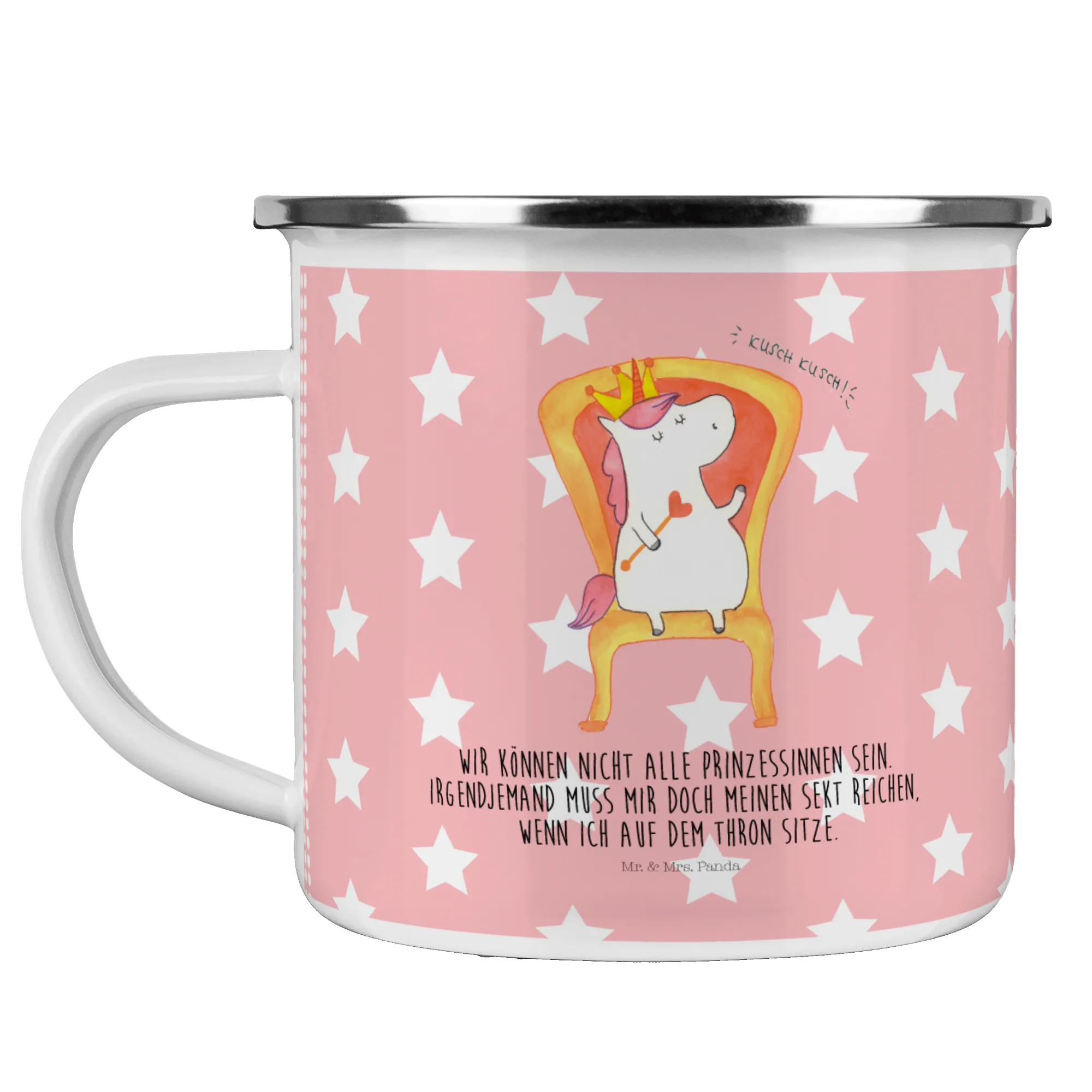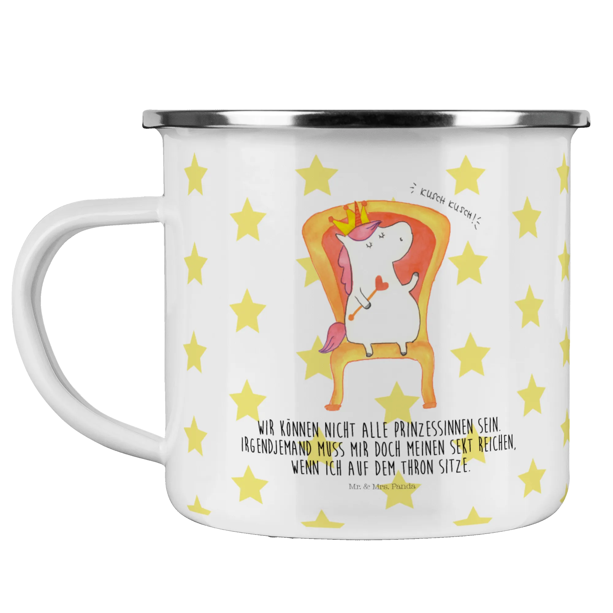 Crafted with love, this enchanting enamel camping mug is designed for the ultimate outdoor enthusiasts. Whether you're hiking through majestic mountains or enjoying a cozy campfire evening with friends, this durable metal cup serves hot cocoa, soothing tea, or your favorite prosecco with grace. The playful unicorn sitting on a throne reminds us all that we need a little magic in our daily lives, making it the ideal companion for your adventures.