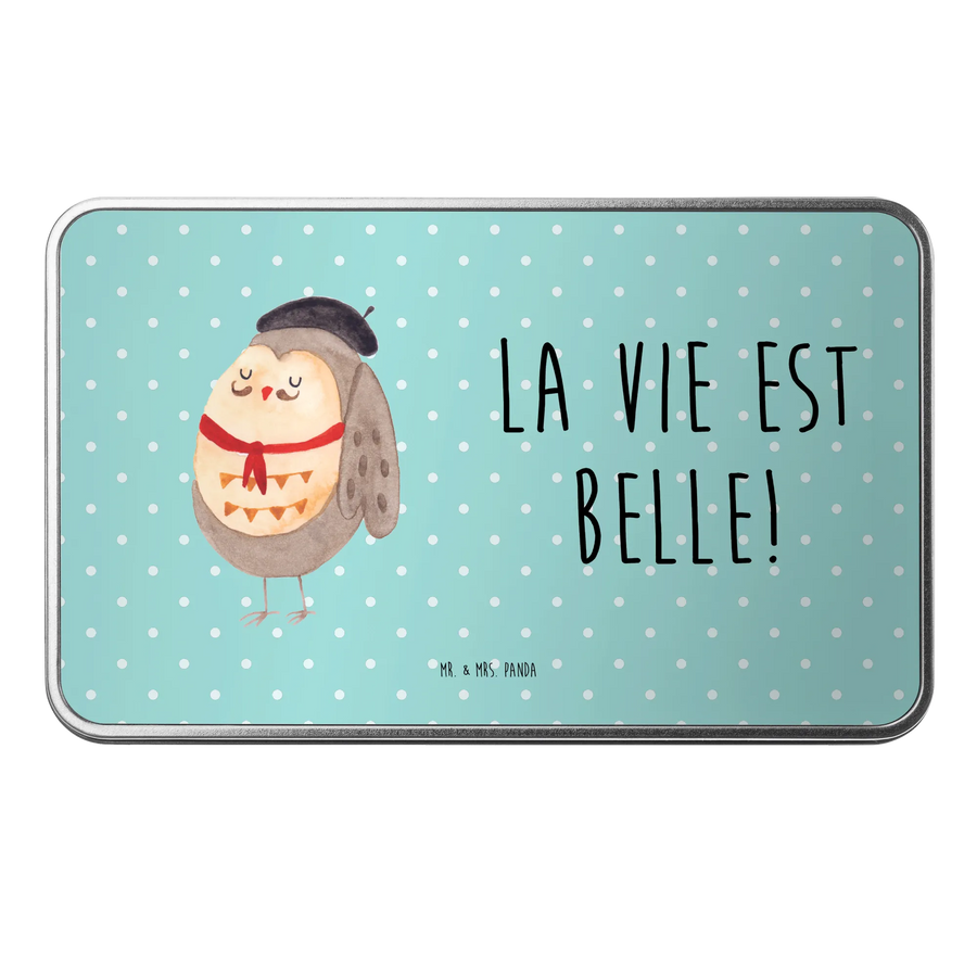 Measuring 7 inches by 5 inches and 1 inch deep, this stunning tin is crafted from high-quality premium aluminum that guarantees it will be a standout piece in any setting. The vibrant turquoise pastel background is adorned with a beautifully illustrated French owl that will simply capture your heart and bring a smile to your face. The slogan "La vie est belle!"—which translates to "Life is beautiful!"—adds an ethereal touch, making this tin not just a storage solution but a daily reminder to embrace the beauty of life.