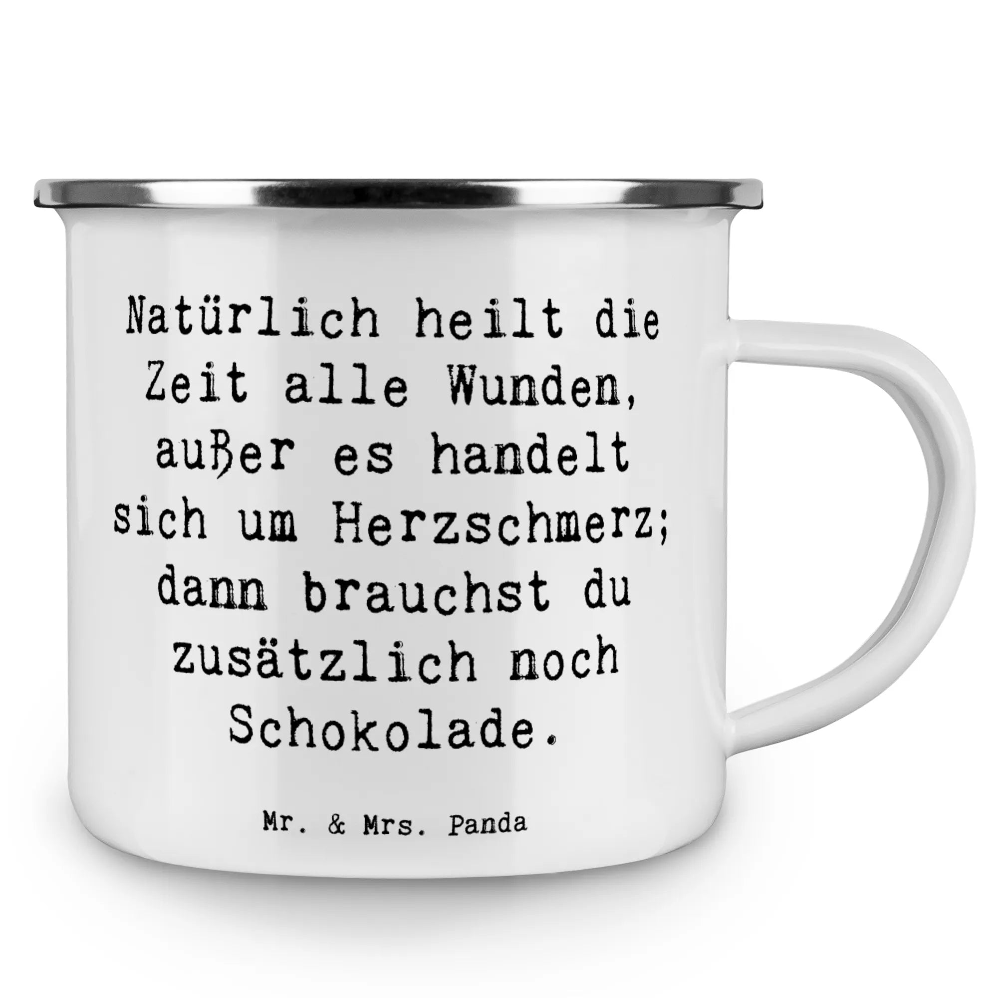 Enamel camping mug Saying Natürlich heilt die Zeit alle Wunden, außer es handelt sich um Herzschmerz; dann brauchst du zusätzlich noch Schokolade.