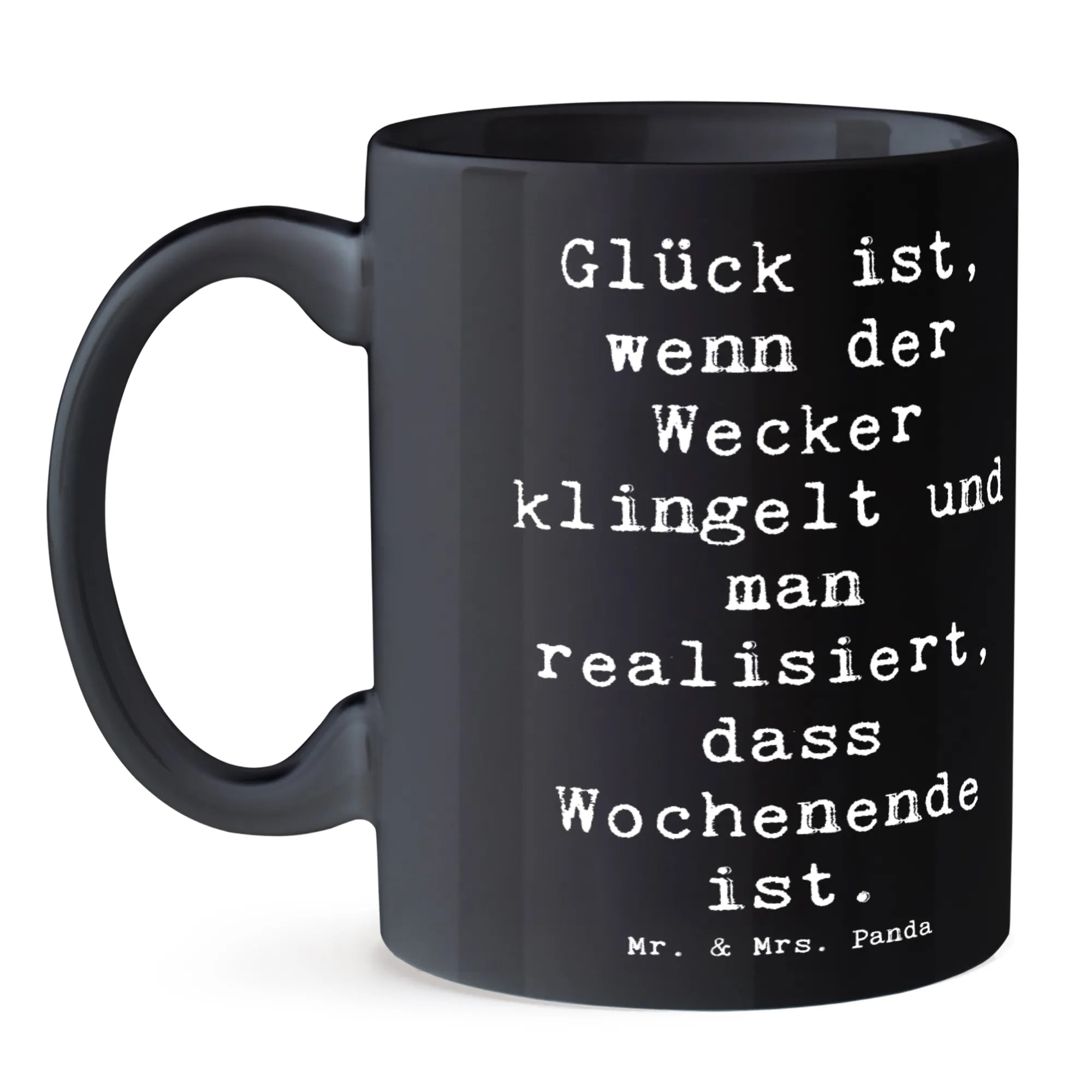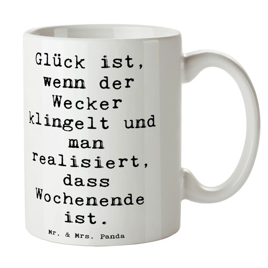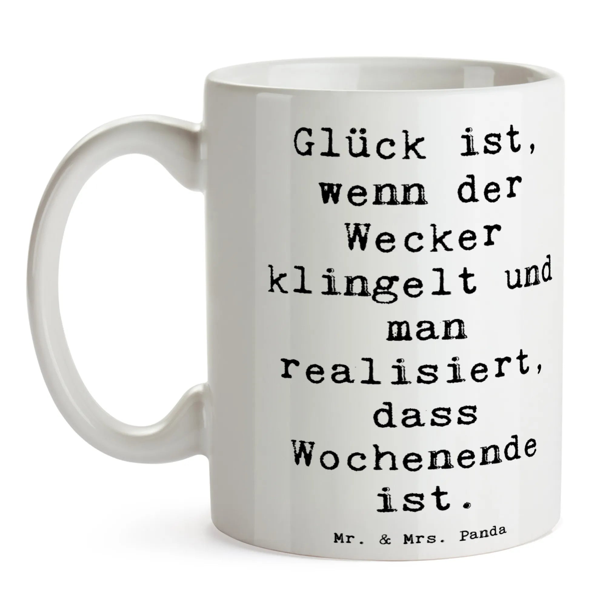 Mug Saying Glück ist, wenn der Wecker klingelt und man realisiert, dass Wochenende ist. - White