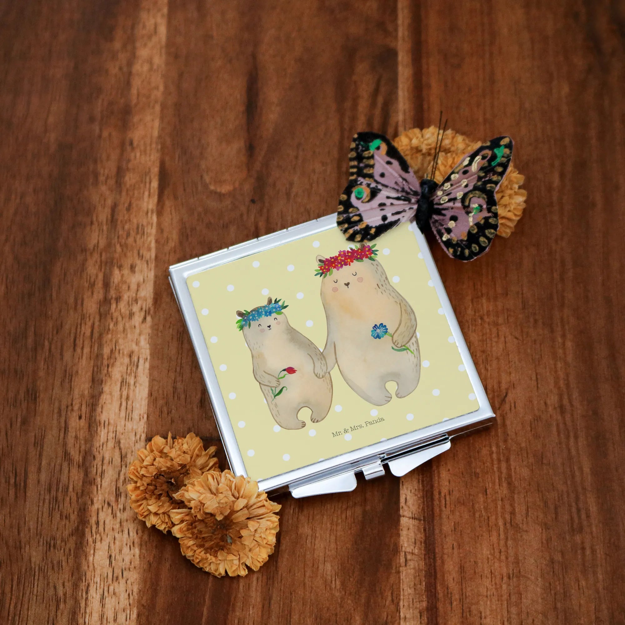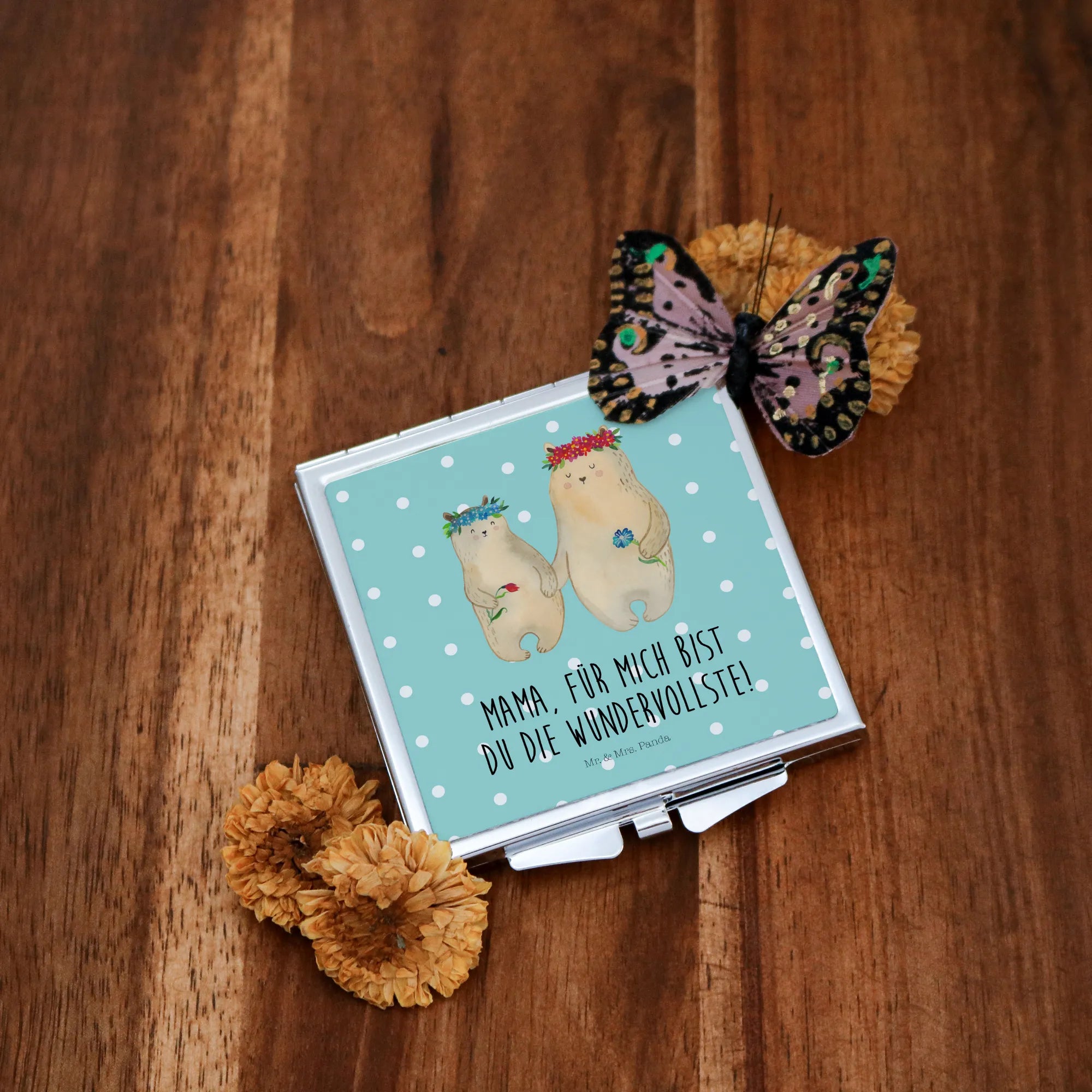 Handbag mirror Bears with flower crown - with saying - Pastel Blue