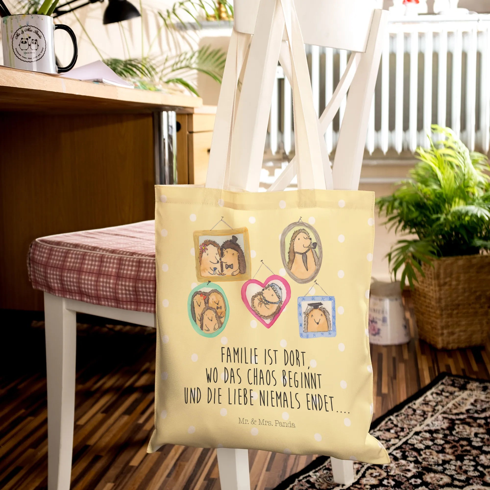 Shopping bag Hedgehog family - with saying - Pastel Gray