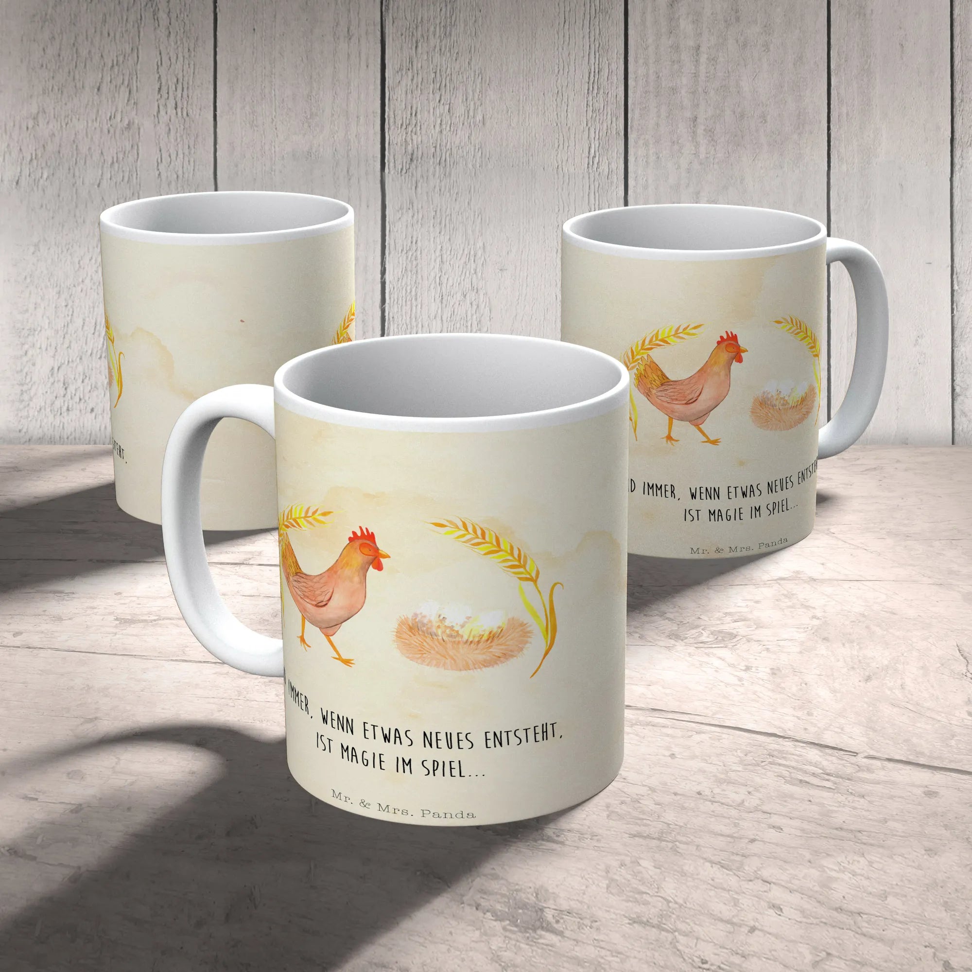 In a sun-drenched yard, a proud chicken struts about, bringing joy to anyone who lays eyes on it. With feathers fluffed and a confident gait, this spirited hen embodies the blessings of country life. As the saying goes, "Und immer, wenn etwas neues entsteht, ist Magie im Spiel." It's a beautiful reminder that every new beginning, whether it's the warm hum of eggs in a nest or the magical arrival of a chick, is filled with the wonder of life. This motif celebrates not only the resilience of farm life but also the delightful randomness of new birth and the sweet moments that come with it. From bustling farms to quiet moments of reflection, this design captures the essence of motivation, inspiration, and the sheer delight found in everyday magic.