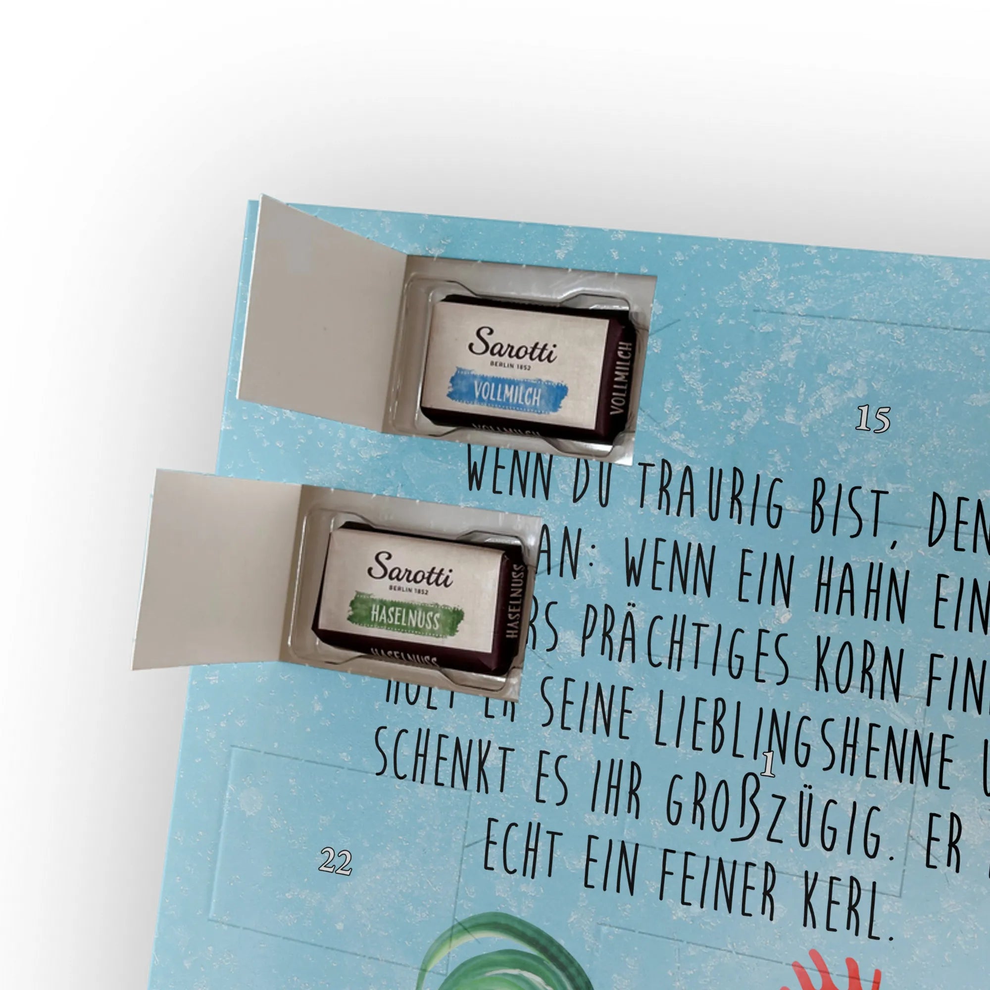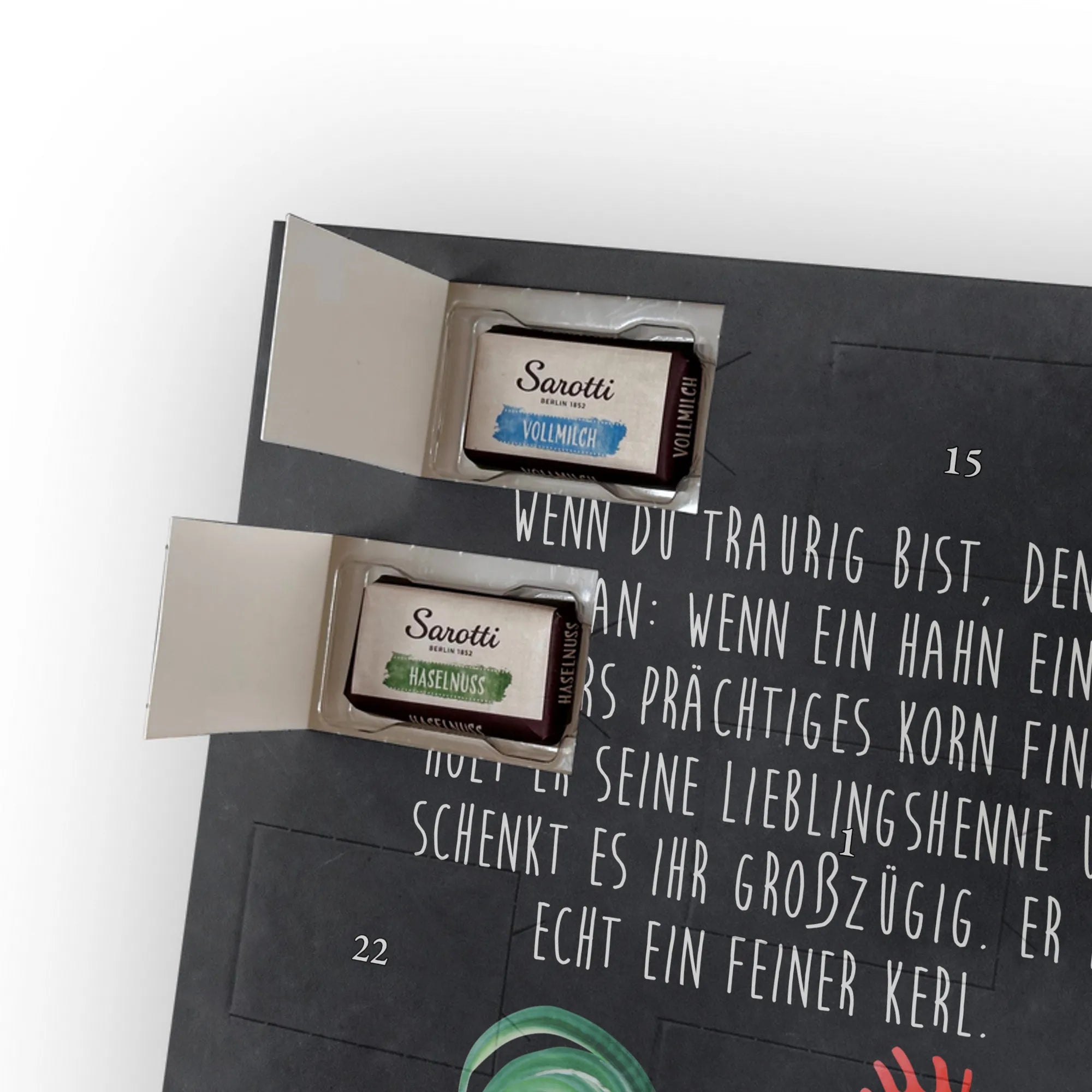 Personalisierter Schoko Foto Adventskalender – die süße, individuelle Adventsüberraschung von Mr. & Mrs. Panda! Jeder Kalender ist bedruckt mit unseren liebevollen Motiven und Sprüchen und kann mit deinem persönlichen Foto gestaltet werden. Für ein perfektes Druckergebnis achte bitte auf eine hohe Auflösung des Fotos und auf einen passenden Bildausschnitt; lade nur Bilder hoch, für die du die Rechte besitzt. Der Kalender überzeugt durch brillante Druckqualität, seidenmatte Oberflächenveredelung und bedruckte Seitenflächen. Maße: 355 mm x 245 mm x 11 mm – ideal zum Hinstellen oder Aufhängen. Hinweis: Die Fotos werden weder aufbereitet noch zugeschnitten; personalisierte Foto Artikel sind vom Rückgaberecht ausgeschlossen. Gefüllt mit einer hochwertigen Auswahl: 24 einzeln verpackte Schokoladentäfelchen in den Geschmacksrichtungen Vollmilch, Nougat, Zartbitter und Haselnuss von Sarotti® und Confiserie Heidel®. Insgesamt 107 g Markenschokolade sorgen für köstliche Adventsmomente. Verschenke Erinnerungen und Schokolade – ein persönliches Statement unter dem Weihnachtsbaum, mit ganz viel Mr. & Mrs. Panda Herz.
