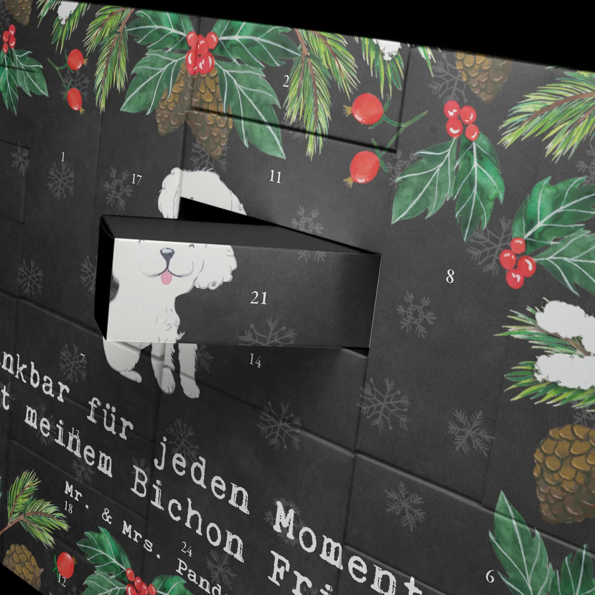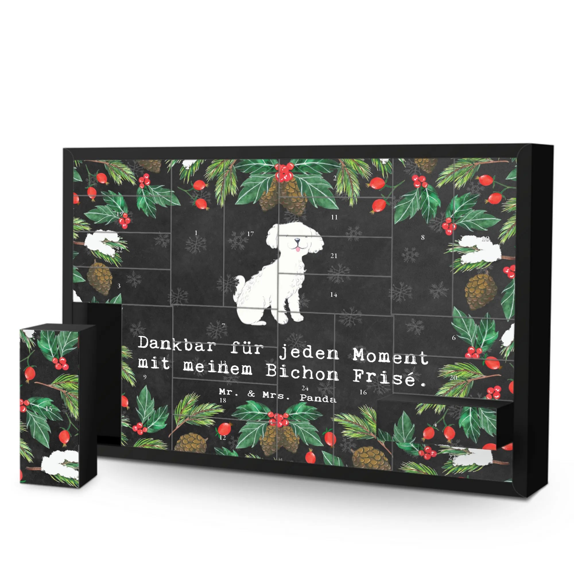 Der wunderschöne, befüllbare Adventskalender von Mr. & Mrs. Panda im zauberhaften Bichon Frisé-Motiv ist das ideale Geschenk für jeden Hundeliebhaber! Mit viel Liebe zum Detail zeigt dieser Adventskalender einen fröhlichen Bichon Frisé, der mit seinem verspielten Ausdruck und den lockigen, flauschigen Haaren einfach allseits beliebt ist. Die Botschaft "Dankbar für jeden Moment mit meinem Bichon Frisé" lässt Herzen höherschlagen und sorgt für eine kuschelige Vorfreude auf die Adventszeit.