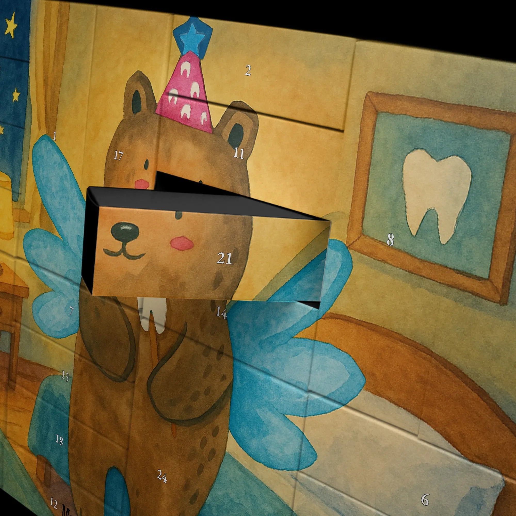 Du willst einen Adventskalender, der mehr ist als nur Schoki? Mit dem Zahnfee Bär Adventskalender schenkst Du eine persönliche Geschichte – jeden Tag ein kleines Erlebnis. Die Kombination aus niedlichem Bärenmotiv und Zahnfee-Thematik schafft Vertrauen und Freude in einer besonderen Lebensphase.