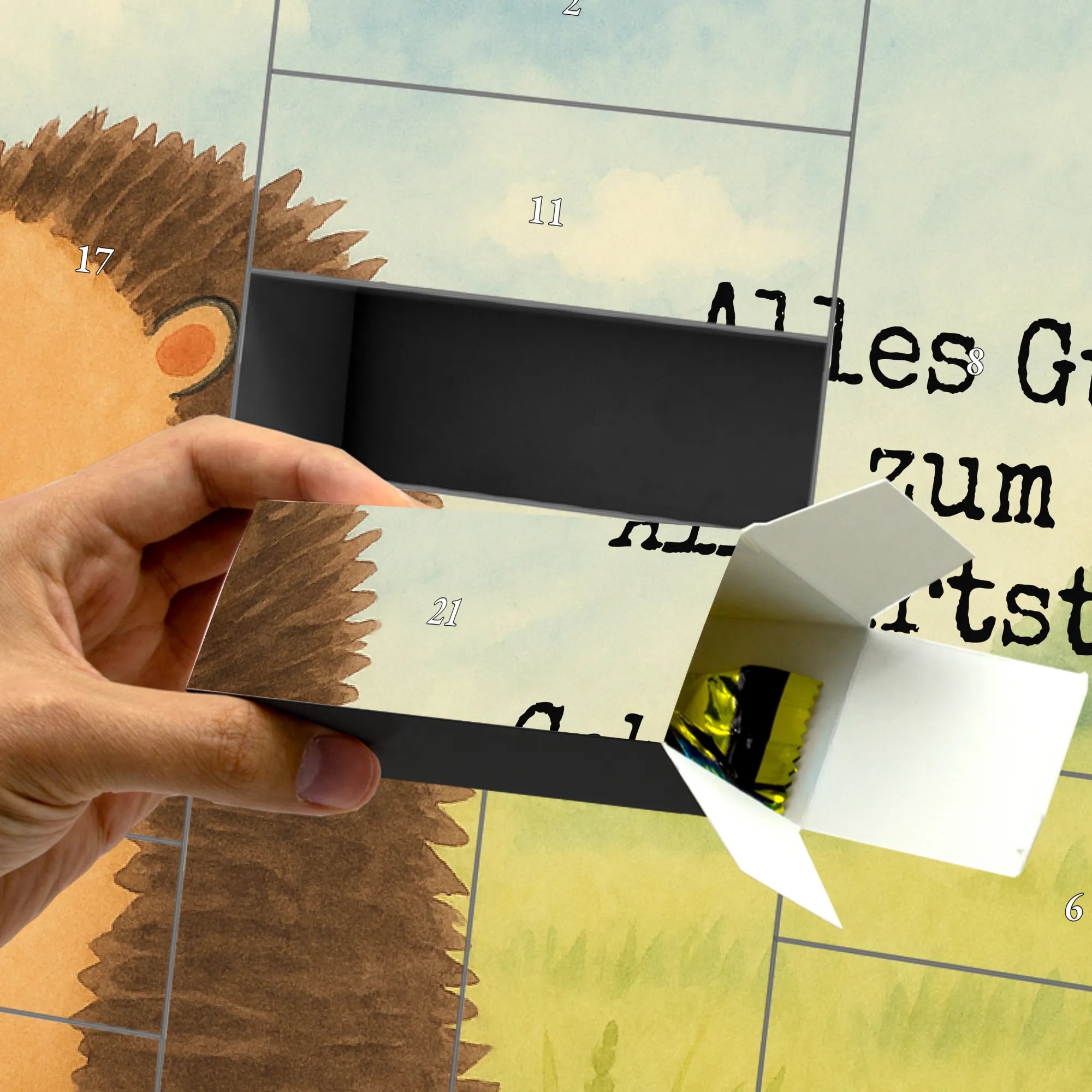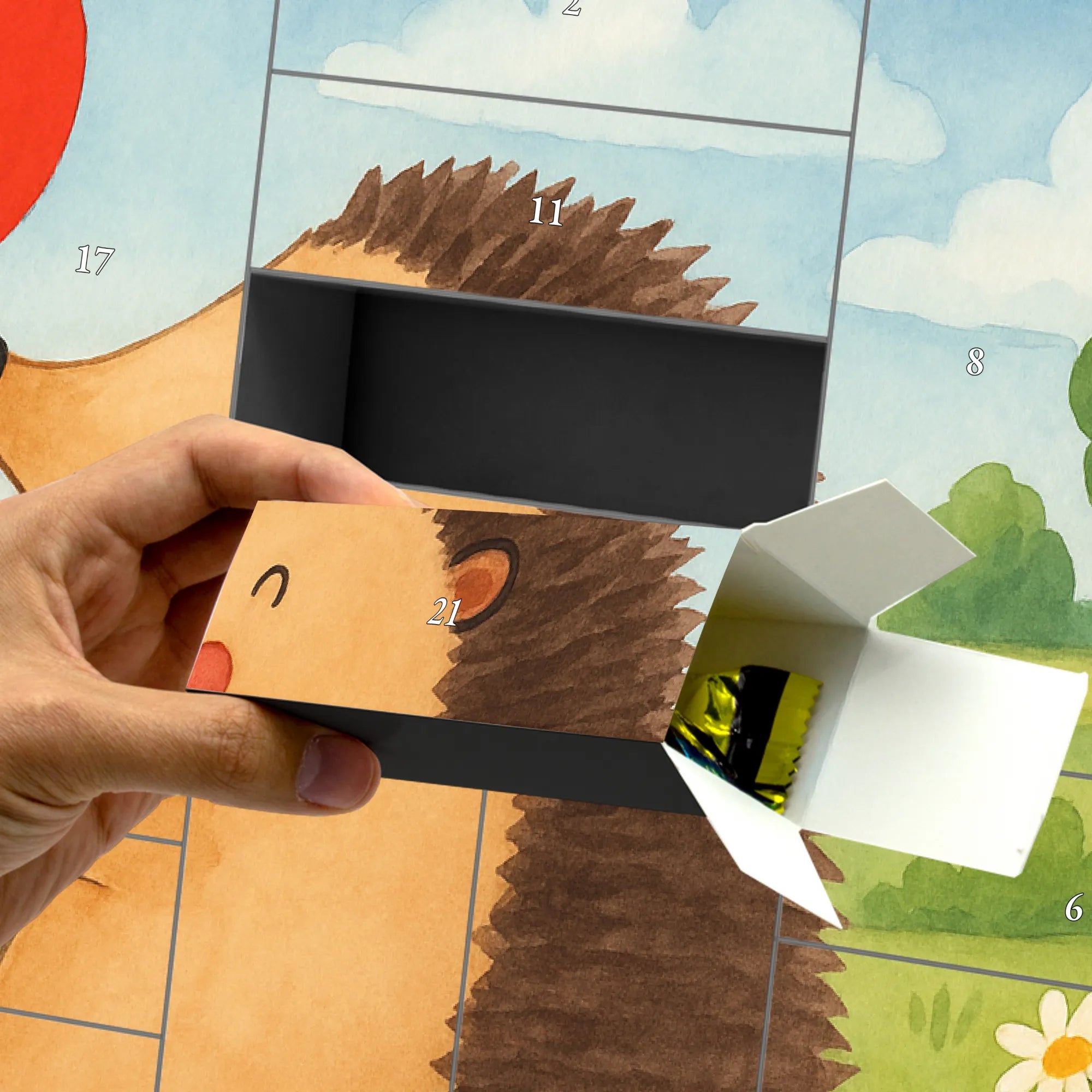 Unser zauberhafter Adventskalender zum Selbstbefüllen verbindet liebevolles Design mit viel Platz für deine eigenen Überraschungen. Das von Mrs. Panda handgezeichnete Motiv zeigt einen fröhlichen Igel mit einem bunten Luftballon – eine Einladung, den Alltag hinter sich zu lassen und jeden Dezembertag mit einem kleinen Glücksmoment zu füllen. 🎈🦔