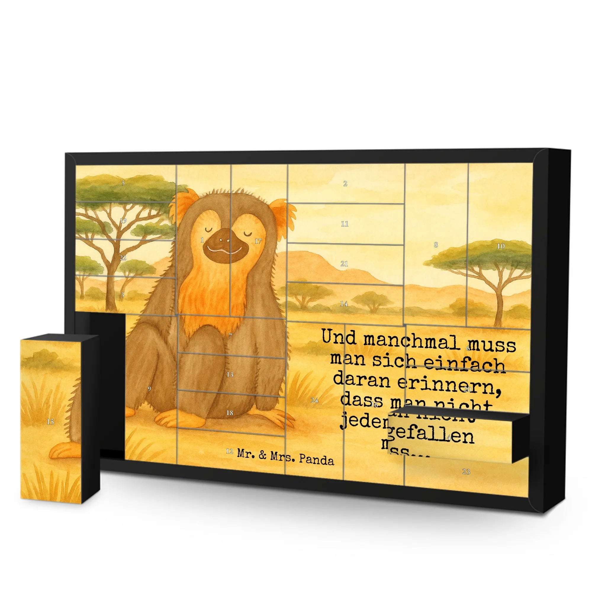 Stabiler Adventskalender Karton von Mr. & Mrs. Panda – hübsch gestaltet und zum Befüllen. Dieser Adventskalender aus hochwertigem Adventskalender Karton ist mit liebevollen Motiven und Sprüchen bedruckt und zeigt auf der Front eine entzückende Zeichnung von Mrs. Panda. Du erhältst 24 einzelne Schachteln zum Selbstbefüllen, die sich wunderbar für kleine Geschenke, Süßigkeiten oder handgeschriebene Botschaften eignen. Die Druckqualität ist brillant und die seidenmatte Oberfläche verleiht dem Kalender einen eleganten Look. Die Aufstellvorrichtung ist bereits integriert, sodass du den Kalender schnell dekorativ platzieren kannst. Bitte beachten: Der Kalender ist nicht personalisierbar und wird ohne Füllung geliefert. Maße: Breite: 619 mm, Höhe: 405 mm, Tiefe: 50 mm. Ob als Geschenkidee oder als festliche Deko für dein Zuhause – dieser Adventskalender aus stabilem Karton bringt Freude und ist dank seiner Qualität lange verwendbar.