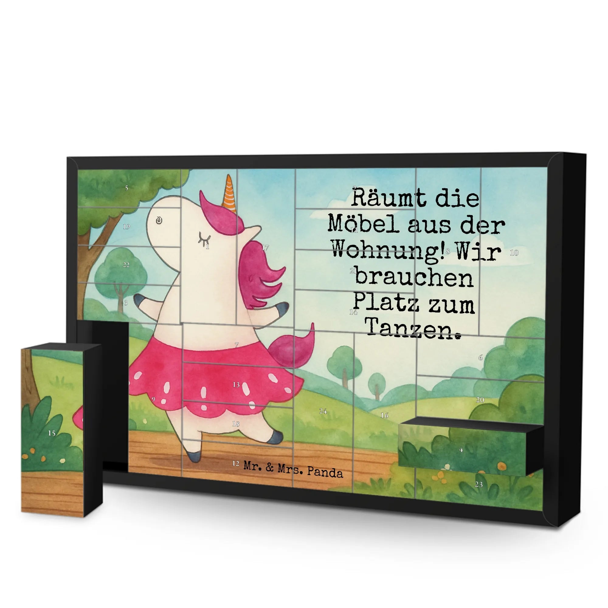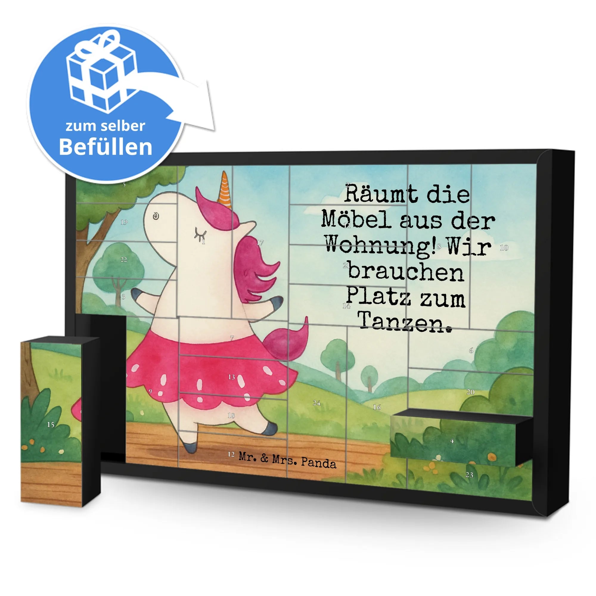 Dieser Adventskalender zum Selbstbefüllen aus der Einhorn - Kollektion von Mr. & Mrs. Panda ist voller Lebensfreude und Tanz. Die zarte, handgezeichnete Illustration von Mrs. Panda zeigt ein zauberhaftes Ballerina-Einhorn im Tütü und trägt den frechen Spruch: „Räumt die Möbel aus der Wohnung! Wir brauchen Platz zum Tanzen." Ein Design, das perfekt zu Einhorn-Fans, jungen Tänzerinnen und allen passt, die gern feiern und das Leben lieben.