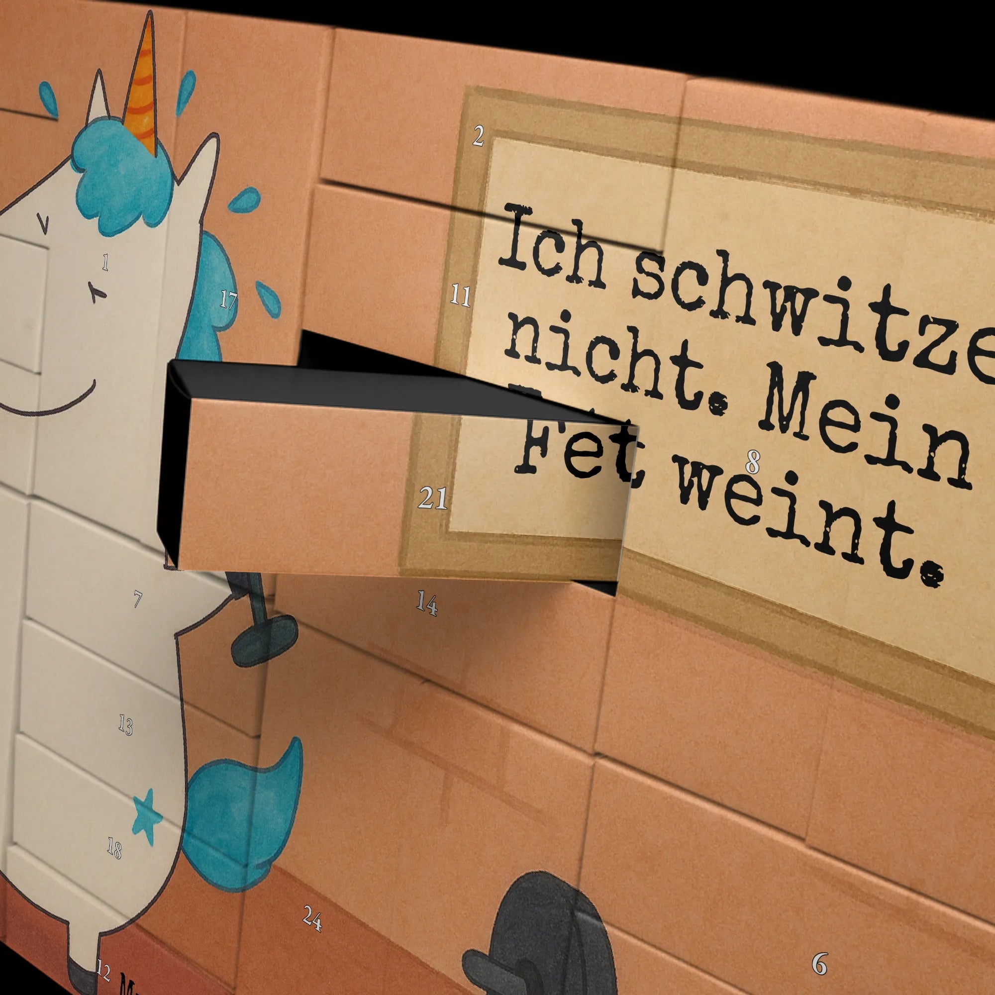 Mit diesem liebevoll gestalteten Adventskalender aus der Einhorn - Kollektion von Mr. & Mrs. Panda schenkst du Humor, Motivation und ganz viel Vorfreude. Das handgezeichnete Einhorn stemmt Hanteln und trägt den frechen Spruch: „Ich schwitze nicht. Mein Fett weint.“ Ein Geschenk, das Fitness-Fans und Einhorn-Liebhaber gleichermaßen begeistert.