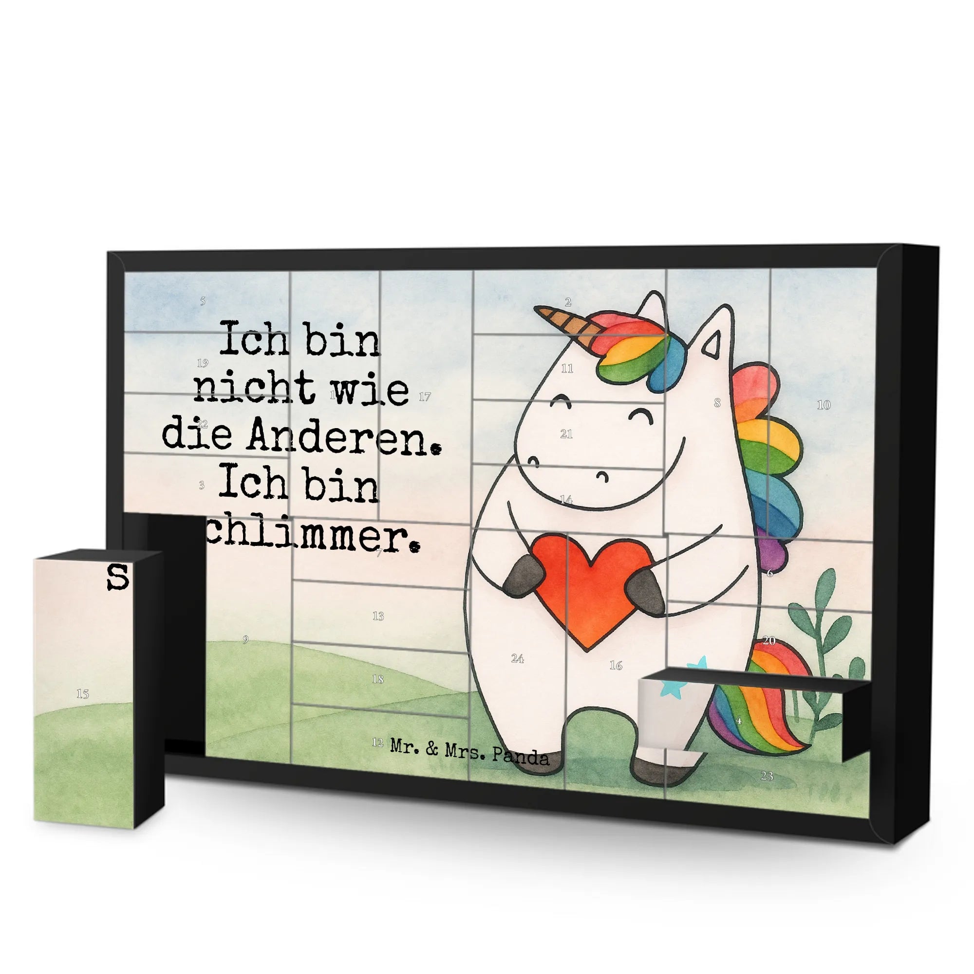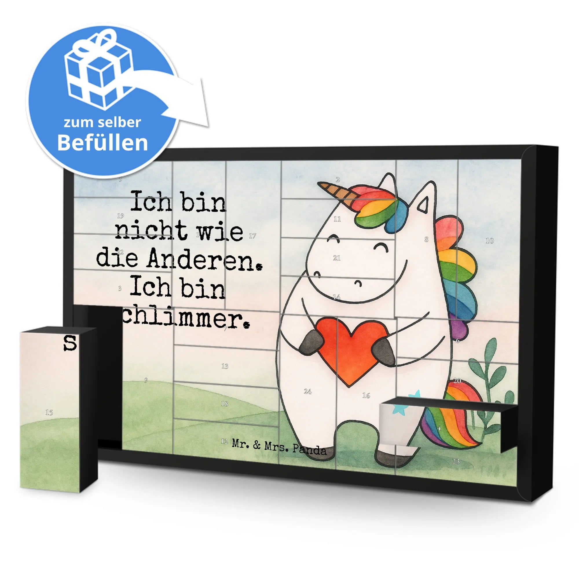 Dieser Adventskalender zum Selbstbefüllen aus der Einhorn - Kollektion von Mr. & Mrs. Panda ist das ideale Geschenk für alle, die Einhörner lieben und einen frechen, liebevollen Spruch schätzen: „Ich bin nicht wie die Anderen. Ich bin schlimmer.“ Die handgezeichnete Illustration von Mrs. Panda zeigt ein süßes Einhorn mit Herz und bringt Freude, Farbe und Witz in die Vorweihnachtszeit.