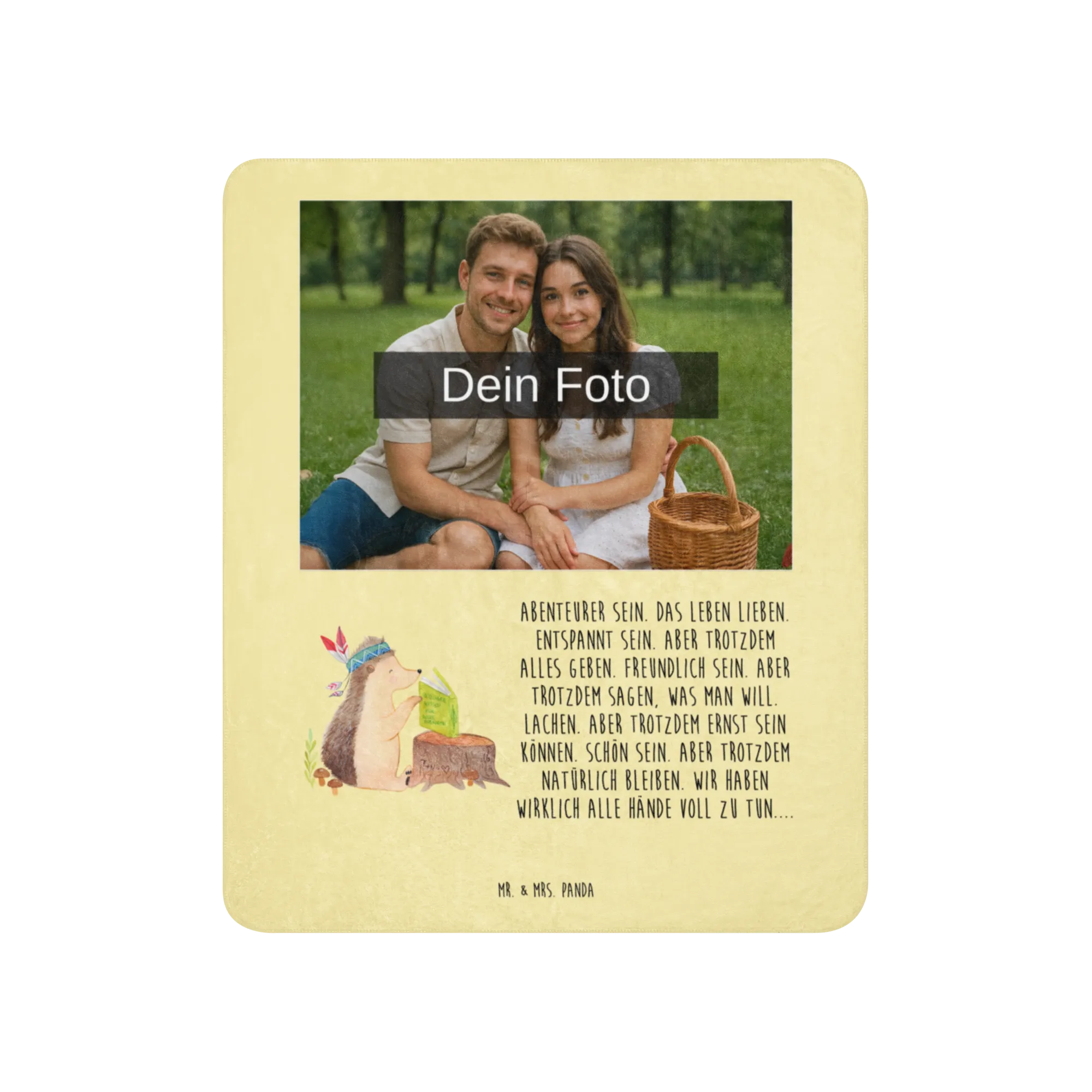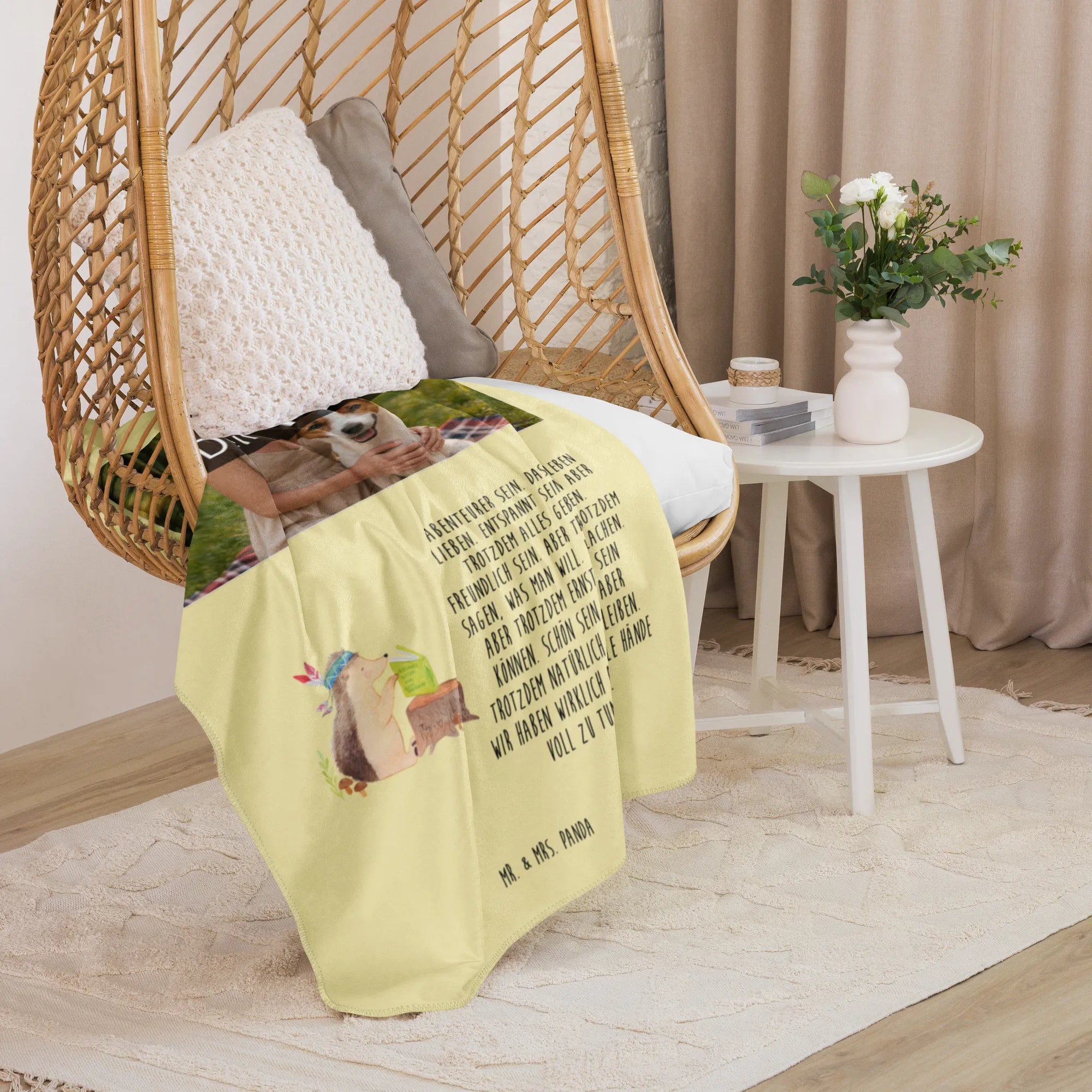 Erlebe die warme Umarmung unserer Sherpa Foto Kuscheldecke von Mr. & Mrs. Panda! Mit einer großzügigen Größe von 1300 mm x 1550 mm bietet sie ausreichend Platz, um dich darin einzukuscheln. Die Decke besteht aus 100 % ultrweichen Polyesterfasern, die perfekt in 51,5 % glattem Obermaterial und 48,5 % kuscheligem Sherpa unterteilt sind. Das Anfassgefühl ist einfach himmlisch! Mit einer Stoffstärke von 220 g/m² und 240 g/m², ist diese Decke nicht nur funktional, sondern auch ein optisches Highlight in jedem Raum. Ihre leuchtenden Farben und das liebevolle Design mit Sprüchen und Motiven von Mr. & Mrs. Panda verleihen jedem Moment magische Momente. Perfekt für gemütliche Filmabende oder entspannende Stunden zu Hause. Vergiss nicht, die Decke vor der ersten Nutzung zu waschen, um ihre volle Pracht zu genießen!