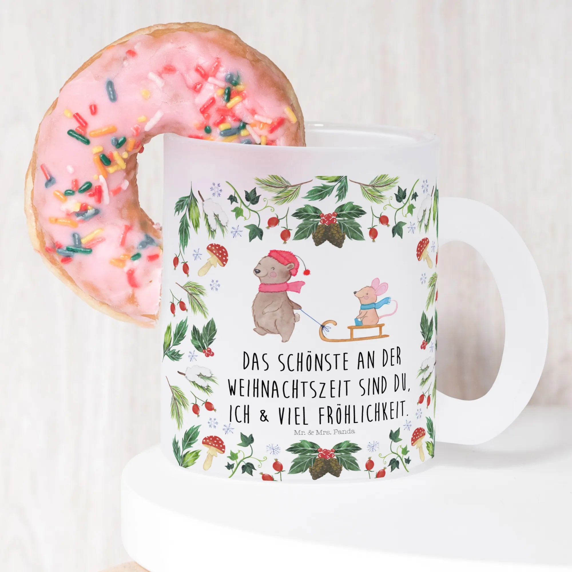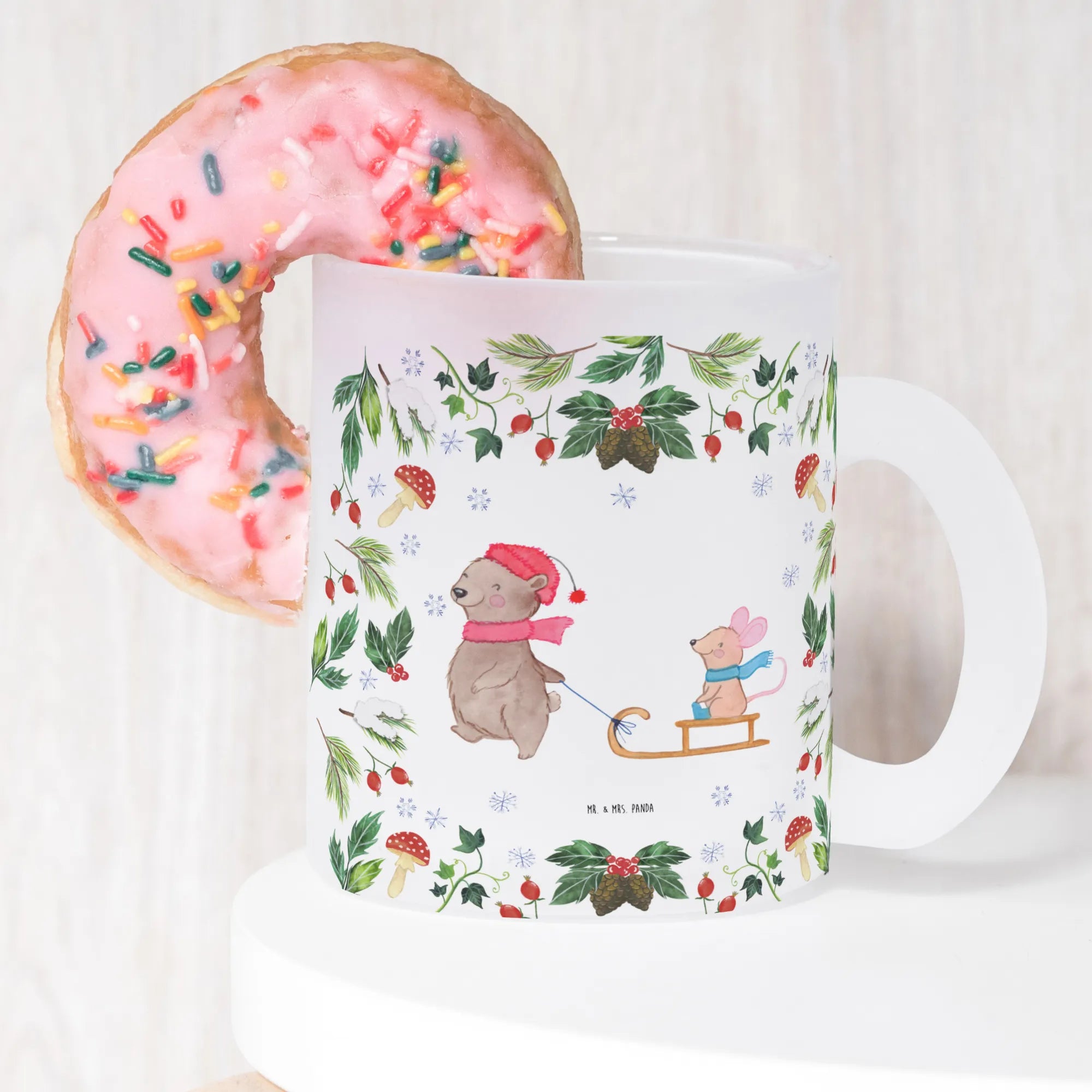 The beautiful scene depicted on the cup showcases a happy bear wearing a festive red hat and a pink scarf, pulling an adorable little mouse dressed in a blue scarf on a sled. Surrounded by winter motifs like delicate snowflakes, festive leaves, and vibrant berries, it brings the spirit of the holiday season right into your home. It's the perfect companion for your cozy evenings, whether spent by the fireplace or while wrapping presents.