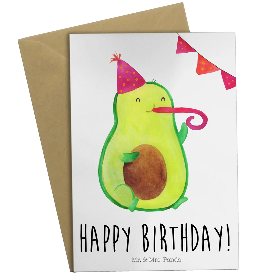 Are you searching for the perfect way to celebrate someone's special day? Then look no further than our delightful "Avocado Birthday" greeting card from the special collection by Mr. & Mrs. Panda! This charming greeting card features an adorable hand-drawn motif of a sweet avocado donning a festive party hat and blowing into a party blower, spreading joy and cheer at every glance.