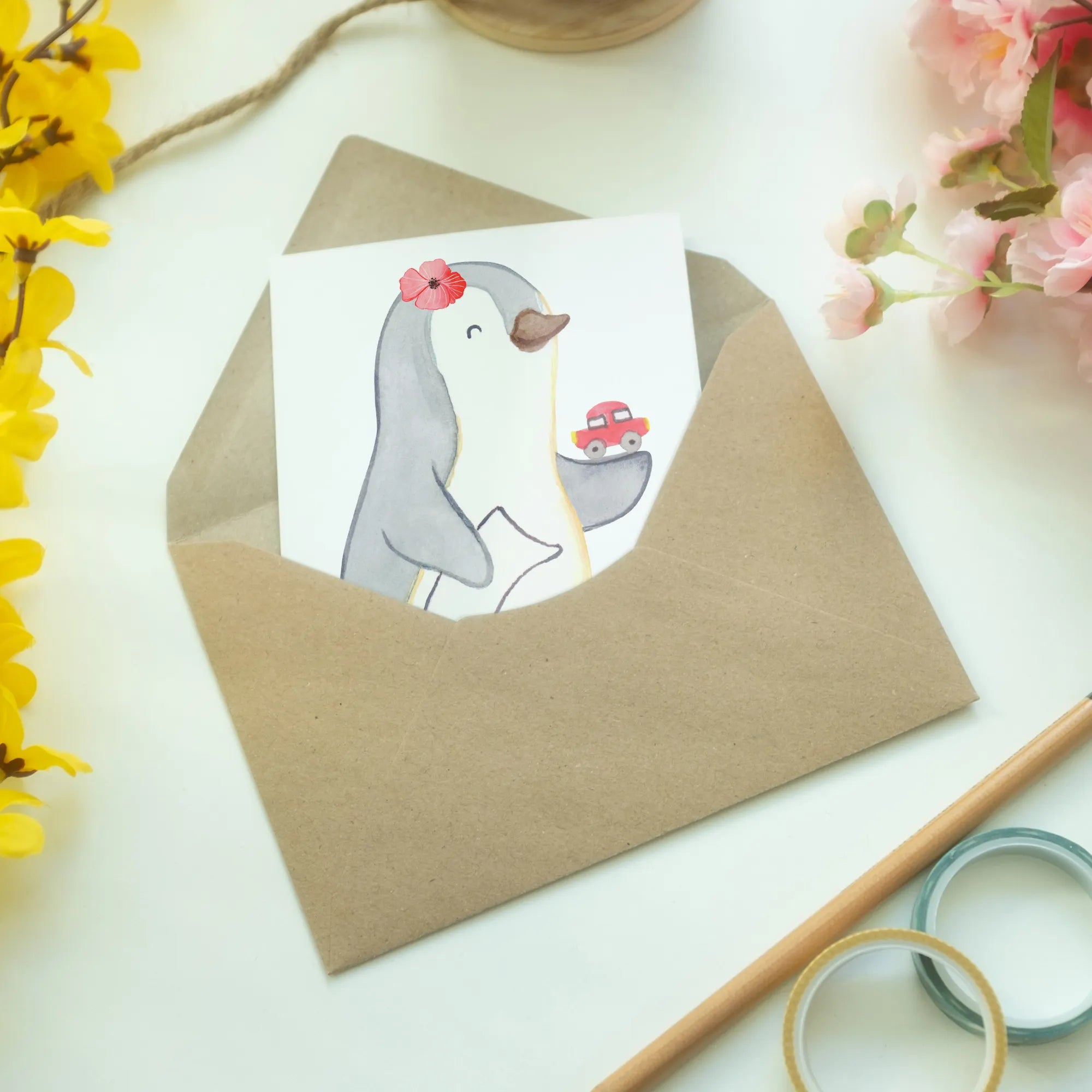 Crafted with love and creativity, this card features a delightful motif of a cheerful penguin holding paperwork in one flipper and a tiny toy car in the other. It encapsulates the spirit of the profession, showcasing that finding a trustworthy car dealer is no easy task — and it surely deserves a fun acknowledgment!
