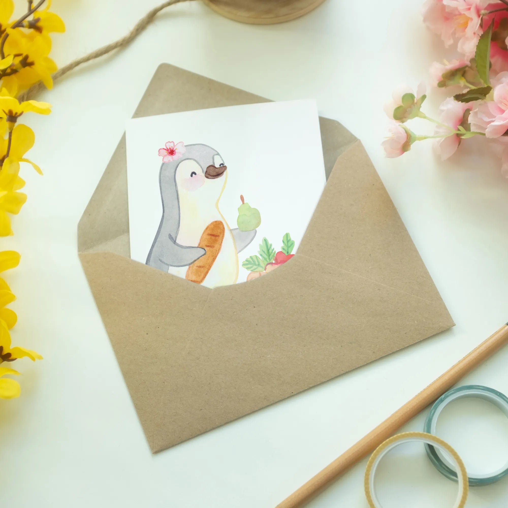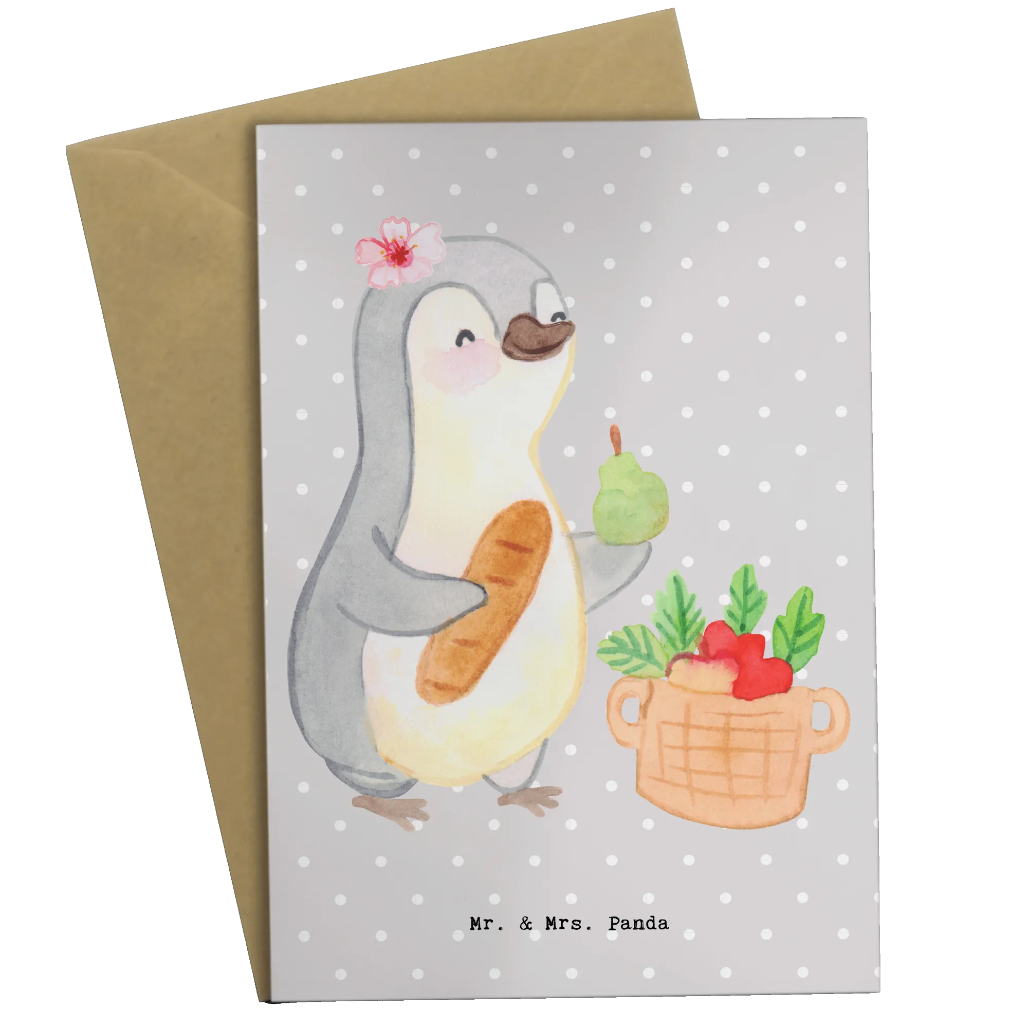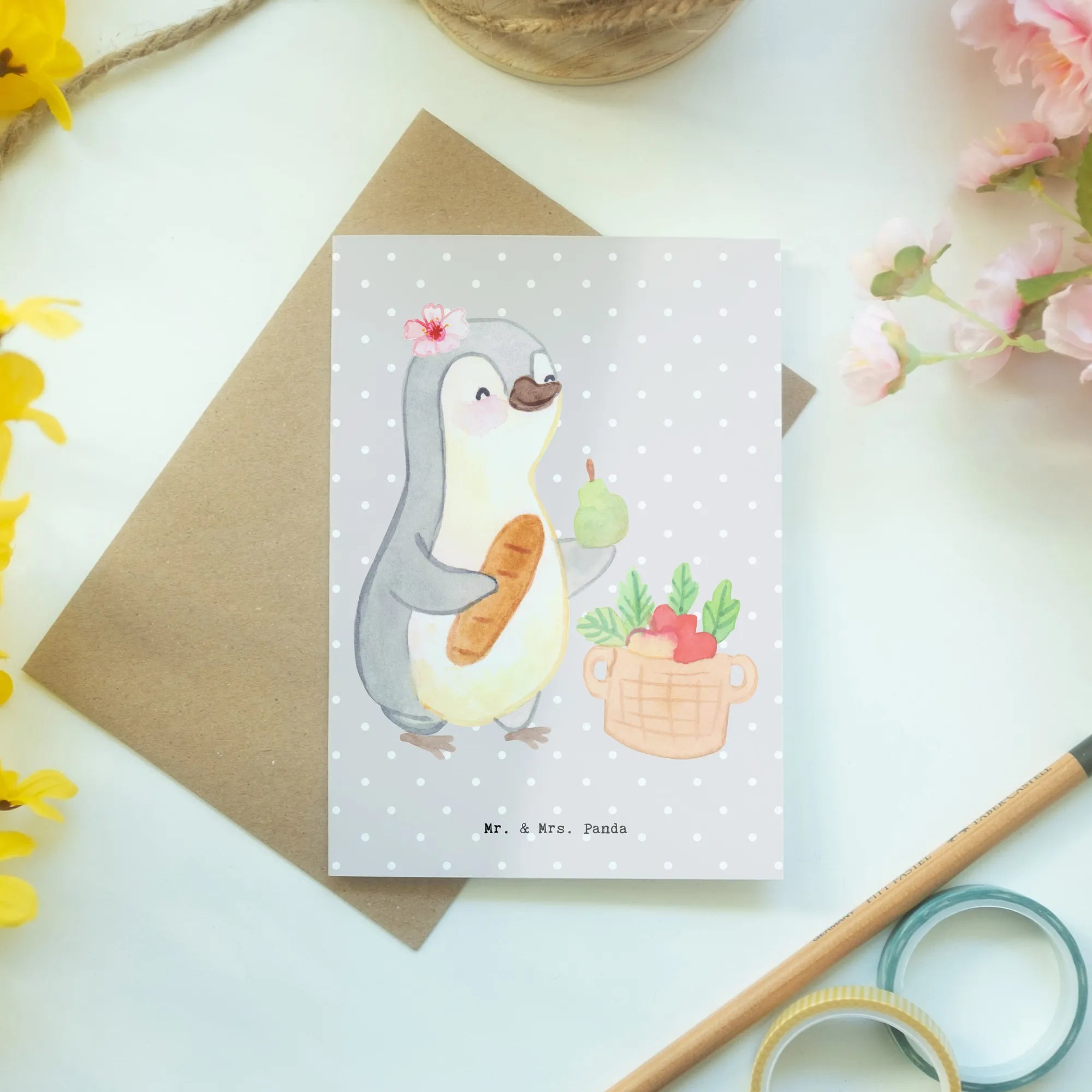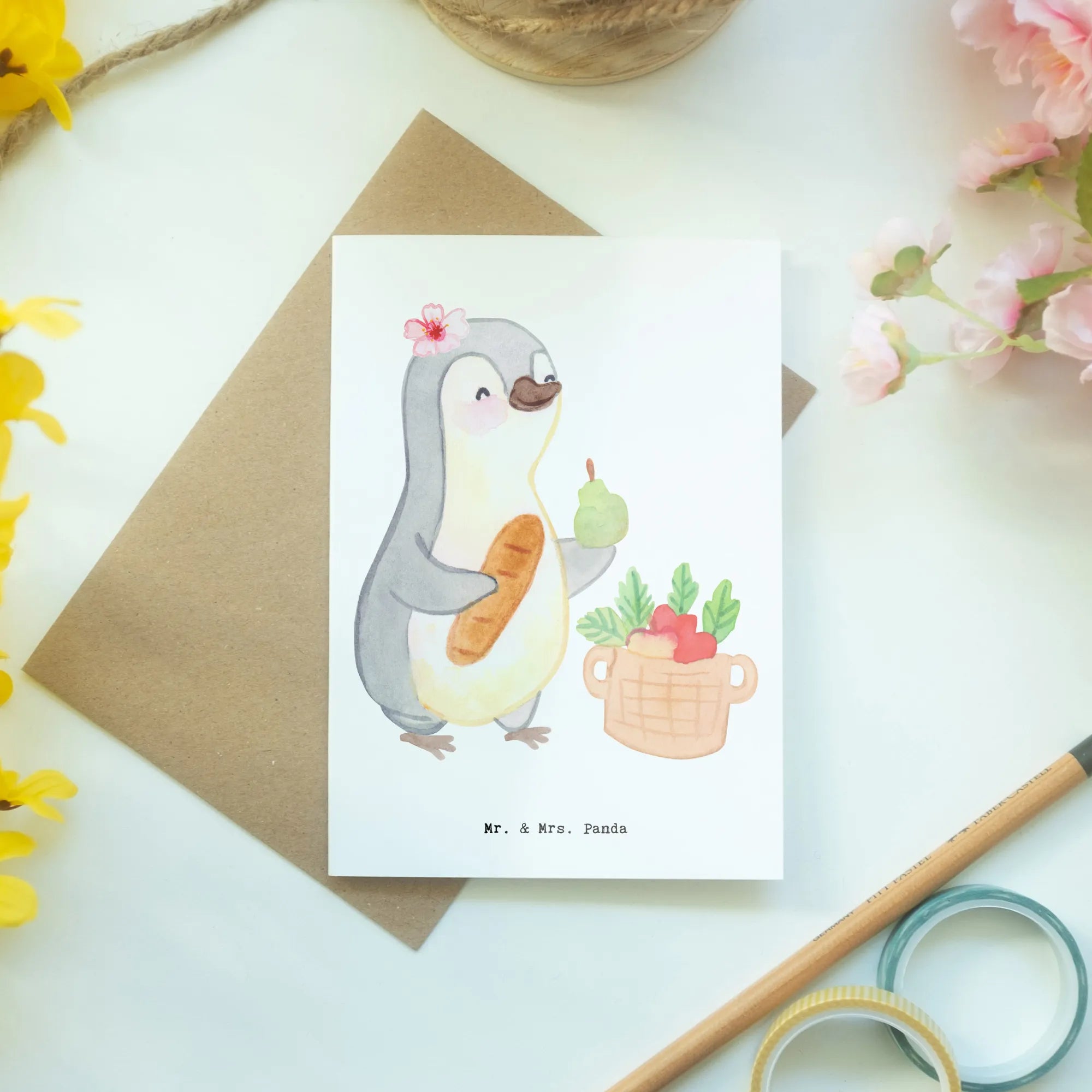 The front of the card showcases a beautifully illustrated female penguin enthusiastically promoting her colorful fruits, capturing the spirit of those who dedicate their lives to bringing fresh, healthy produce to their communities.
