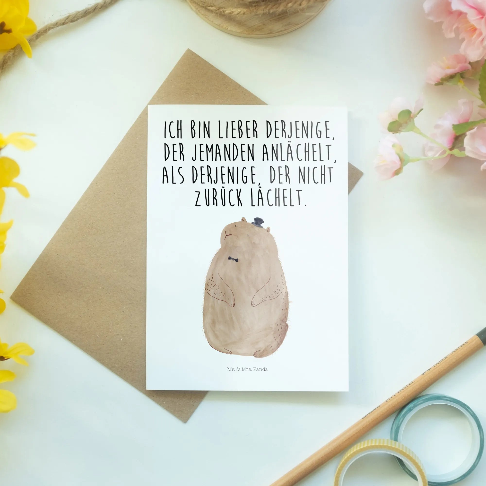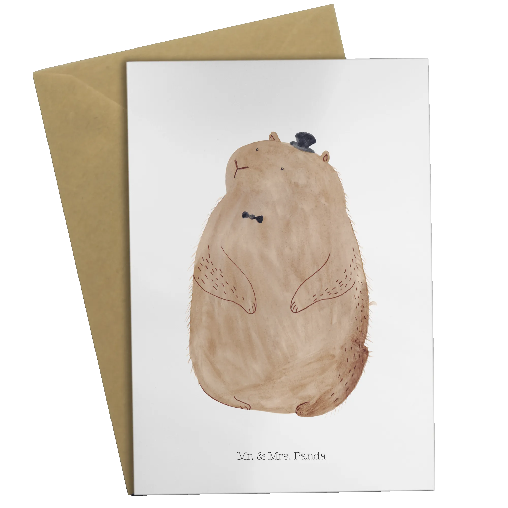 Introducing the delightful Groundhog Greetings Card from the beloved Small World collection by Mr. & Mrs. Panda! Perfect for spreading cheer and warmth, this card captures the essence of happiness with its charming hand-drawn illustration of an adorable groundhog wearing a dapper little cylinder. Crafted from high-quality 300-gram carton, the card exhibits a beautiful glossy finish on the front and back, ensuring your greetings stand out in style.