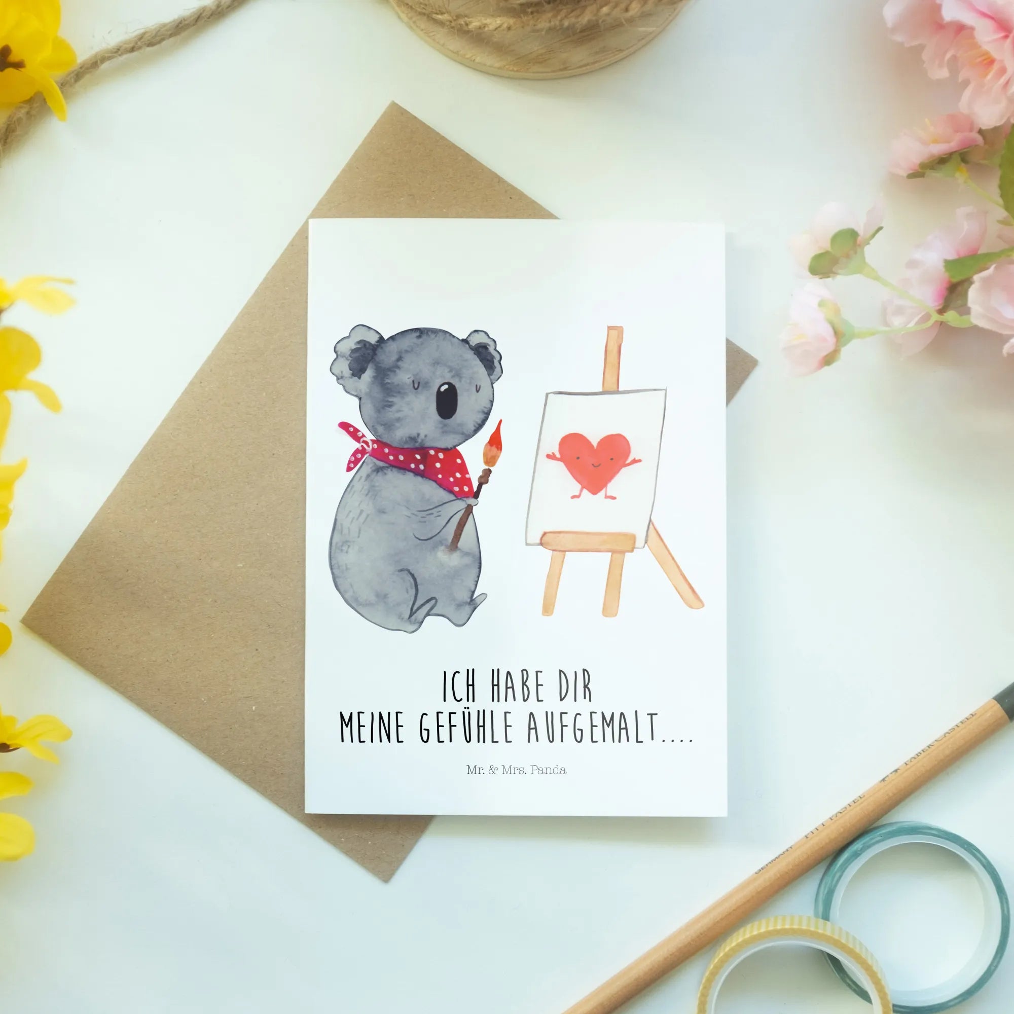 Measuring 148 mm - 6 inch by 105 mm - 4 inch, this beautiful greeting card features a delightful hand-drawn image of a cute koala artist at work on a large canvas, with a brush in paw, capturing the essence of feelings and love. It's perfect for the special someone in your life who understands the proof of love through art and emotions.