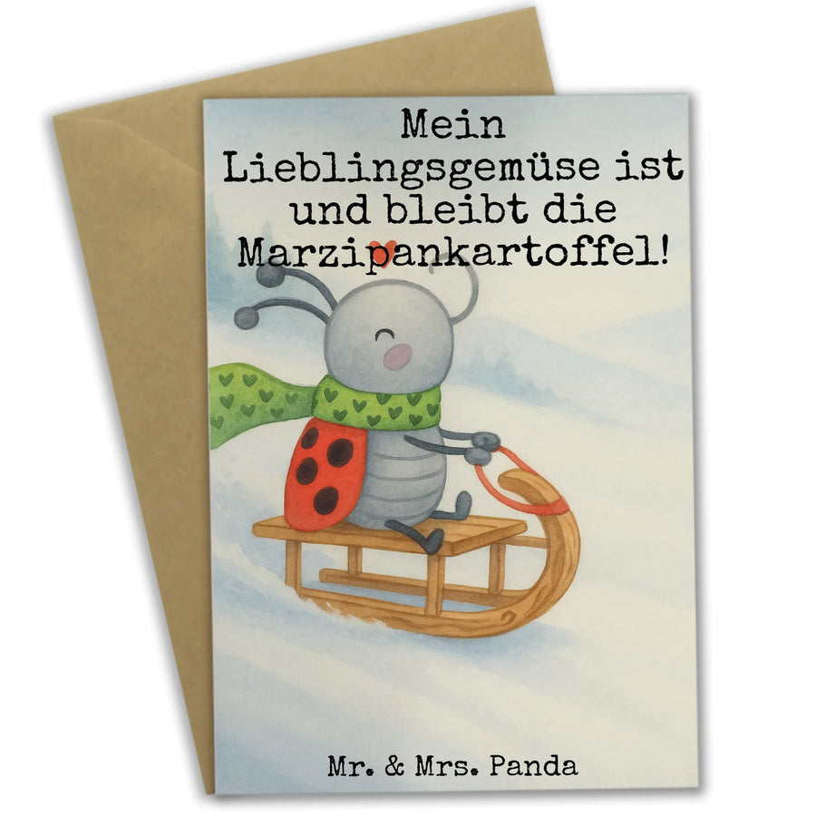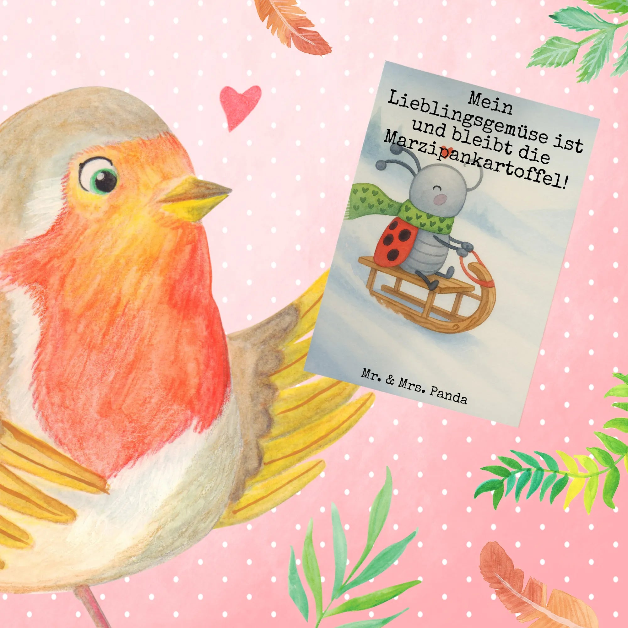 Visualize a smiling ladybug, clad in a cozy heart-covered scarf, riding down snowy hills on a sled. It captures the pure essence of winter delight! With every joyful descent and the heart floating above, it speaks volumes about cherishing simple joys. The motif’s catchy slogan, 'Mein Lieblingsgemüse ist und bleibt die Marzipankartoffel!', cleverly brings into focus those sweet pleasures that warm the heart, reminding us of the importance of letting happiness shine through even the coldest days.