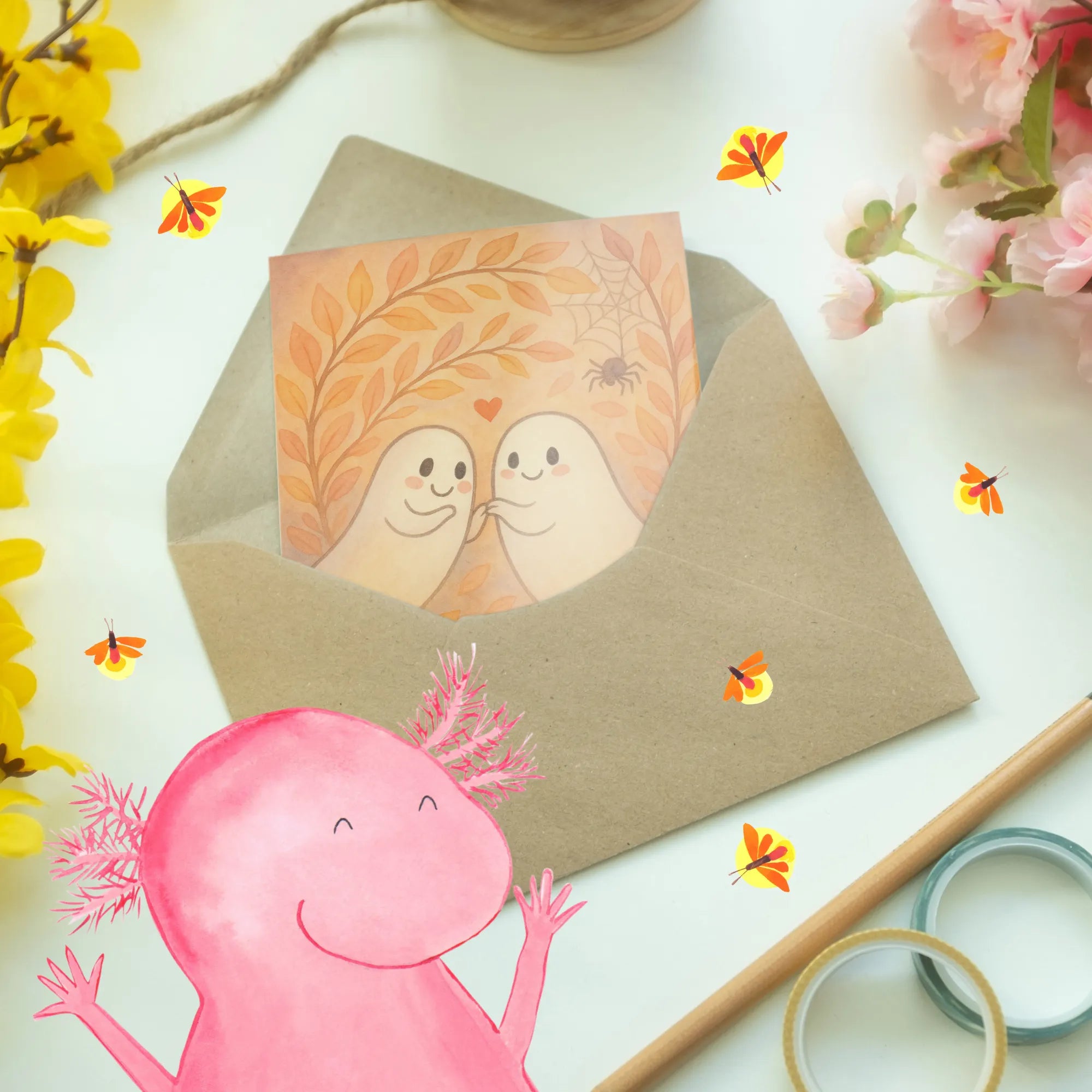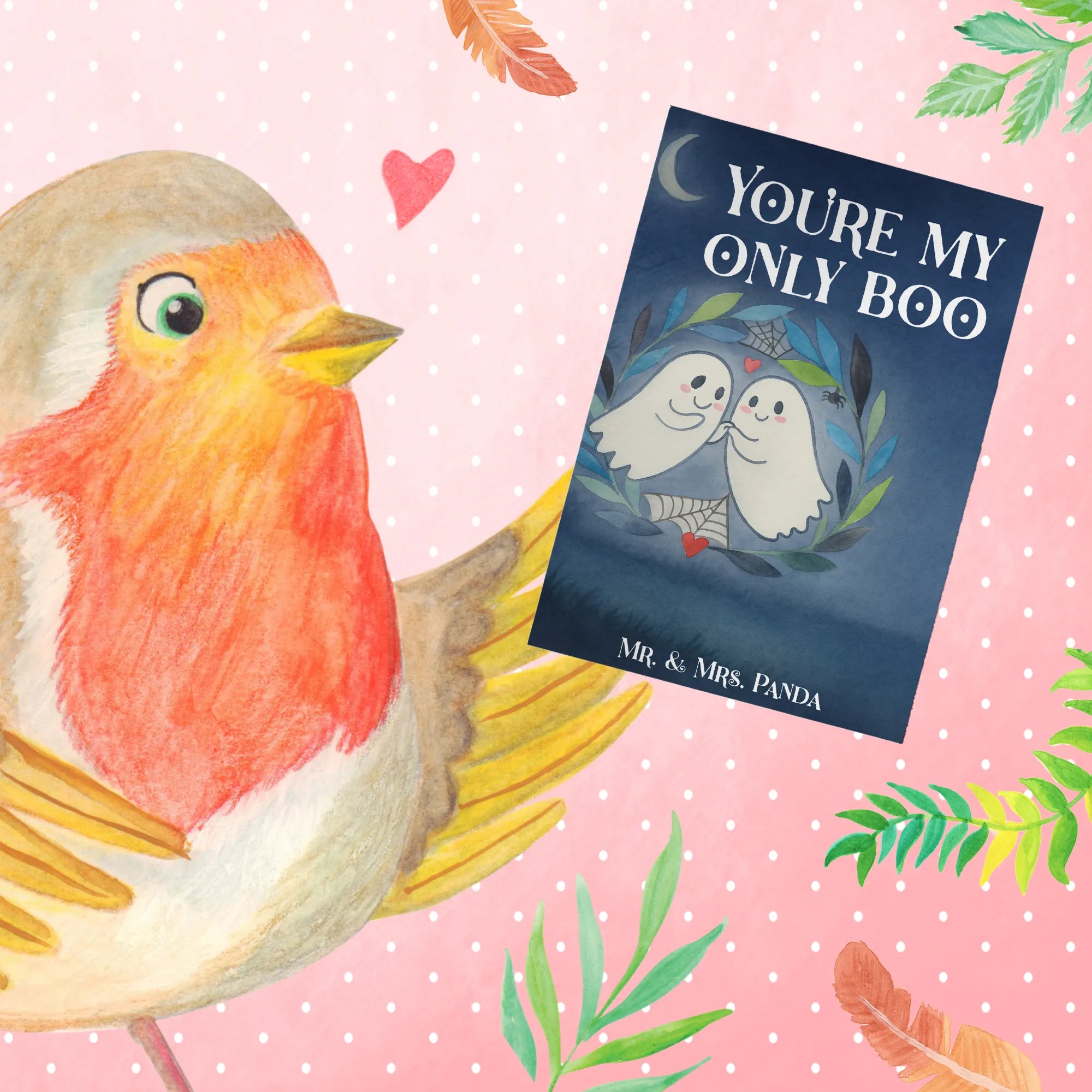 Hier sind zwei gespenstische Freunde zu sehen, die in einem besonderen Moment der Zuneigung schwelgen. Ihre sanften, runden Formen strahlen eine verspielte Atmosphäre aus, während sie sich liebevoll umarmen. Zwischen diesen kleinen Gespenstern schwebt ein zartes Herzchen, das die Tiefe ihrer Verbundenheit symbolisiert. Im Hintergrund tanzen Blätter in sanften Blautönen und lebhaften Grüntönen, die eine herbstliche Stimmung erzeugen und die romantische Halloween-Note perfekt abrunden. Eine filigran gezeichnete Spinne und ein zartes Spinnennetz verleihen dem Bild einen charmanten, mystischen Touch. Gemeinsam scheinen sie uns daran zu erinnern, dass Liebe und Freundschaft in den unerwartetsten Formen und Momenten auftreten können. Diese Motive von Mr. & Mrs. Panda bringen Freude und Wärme in jedes Zuhause und laden dazu ein, die besonderen Augenblicke im Leben zu feiern, egal wie gruselig sie scheinen mögen.