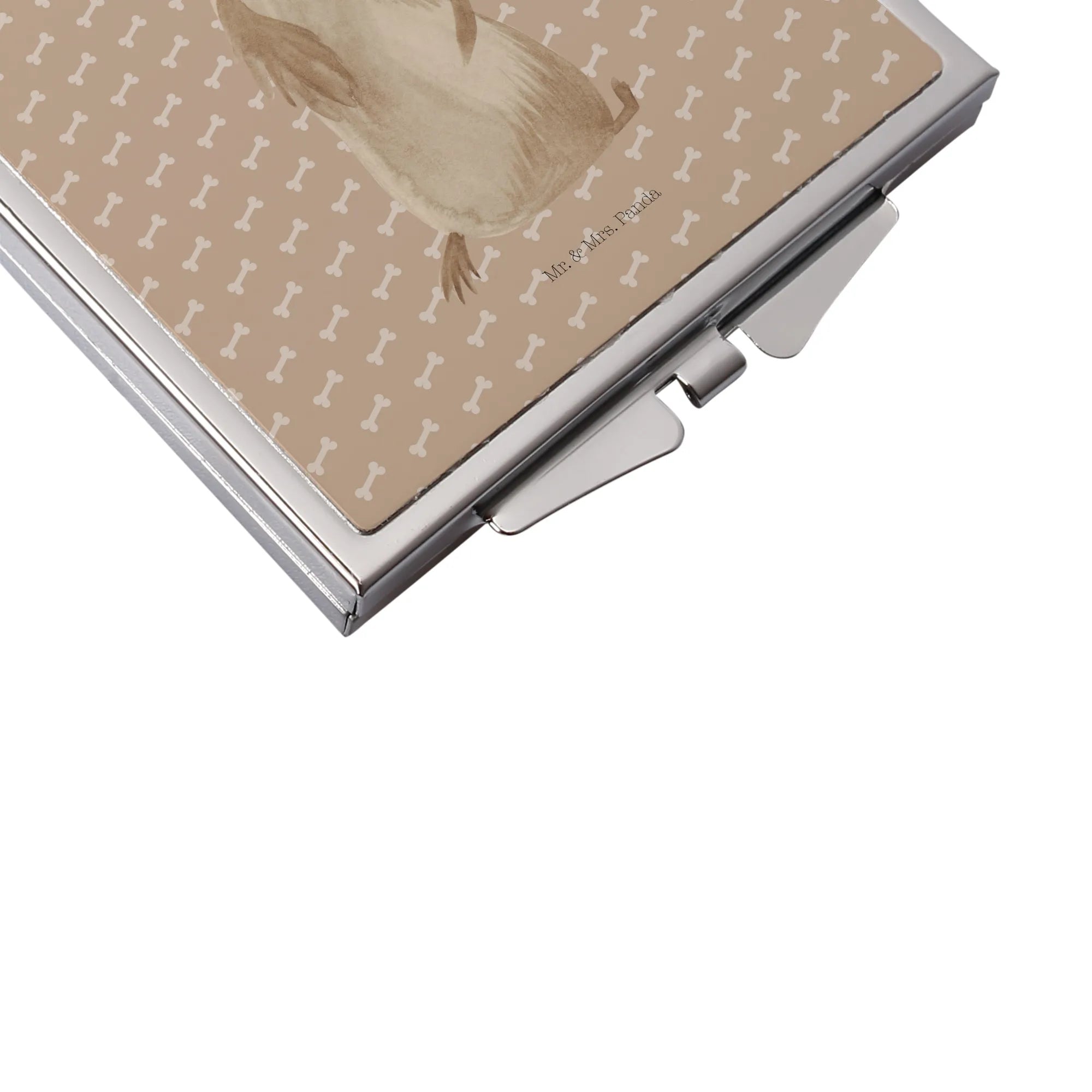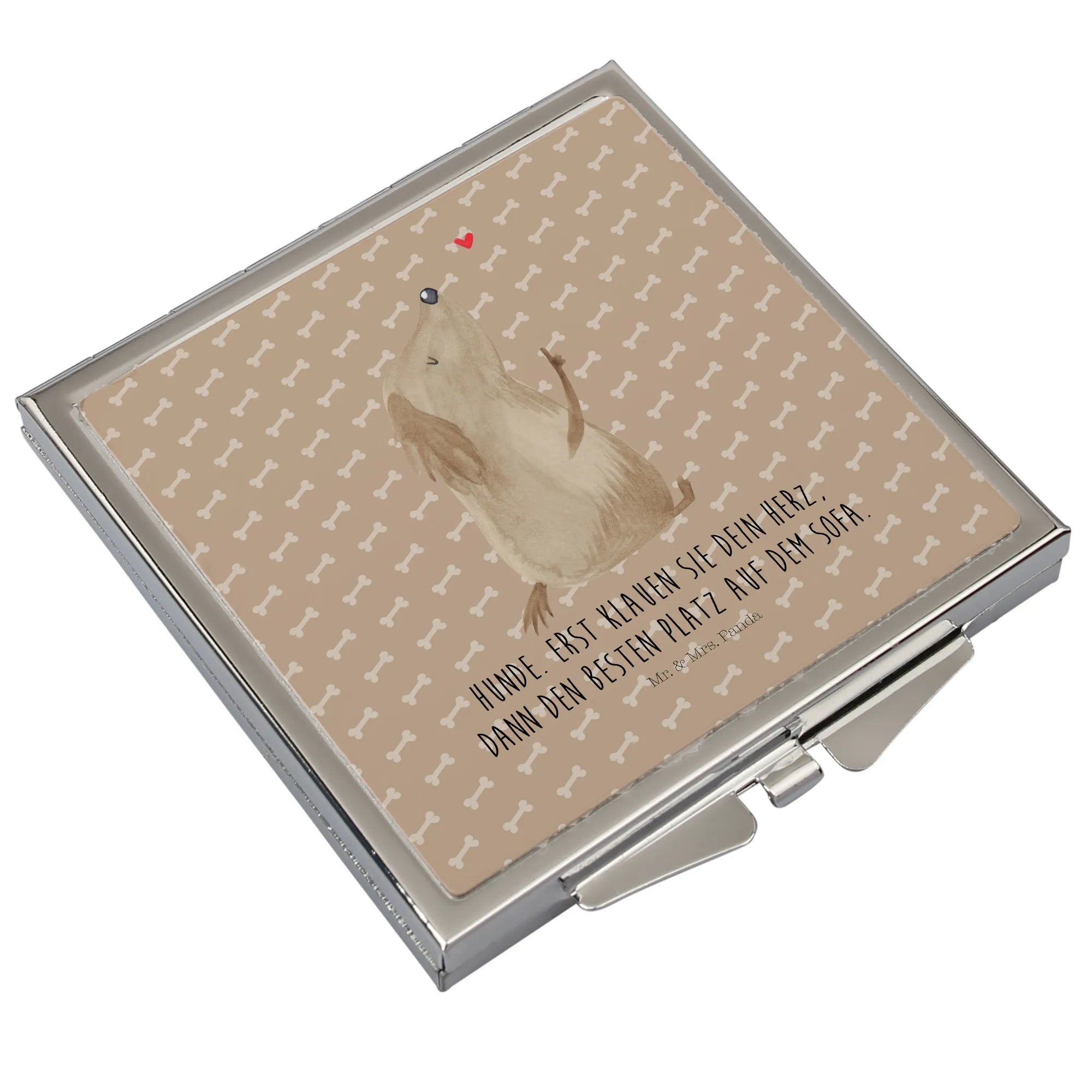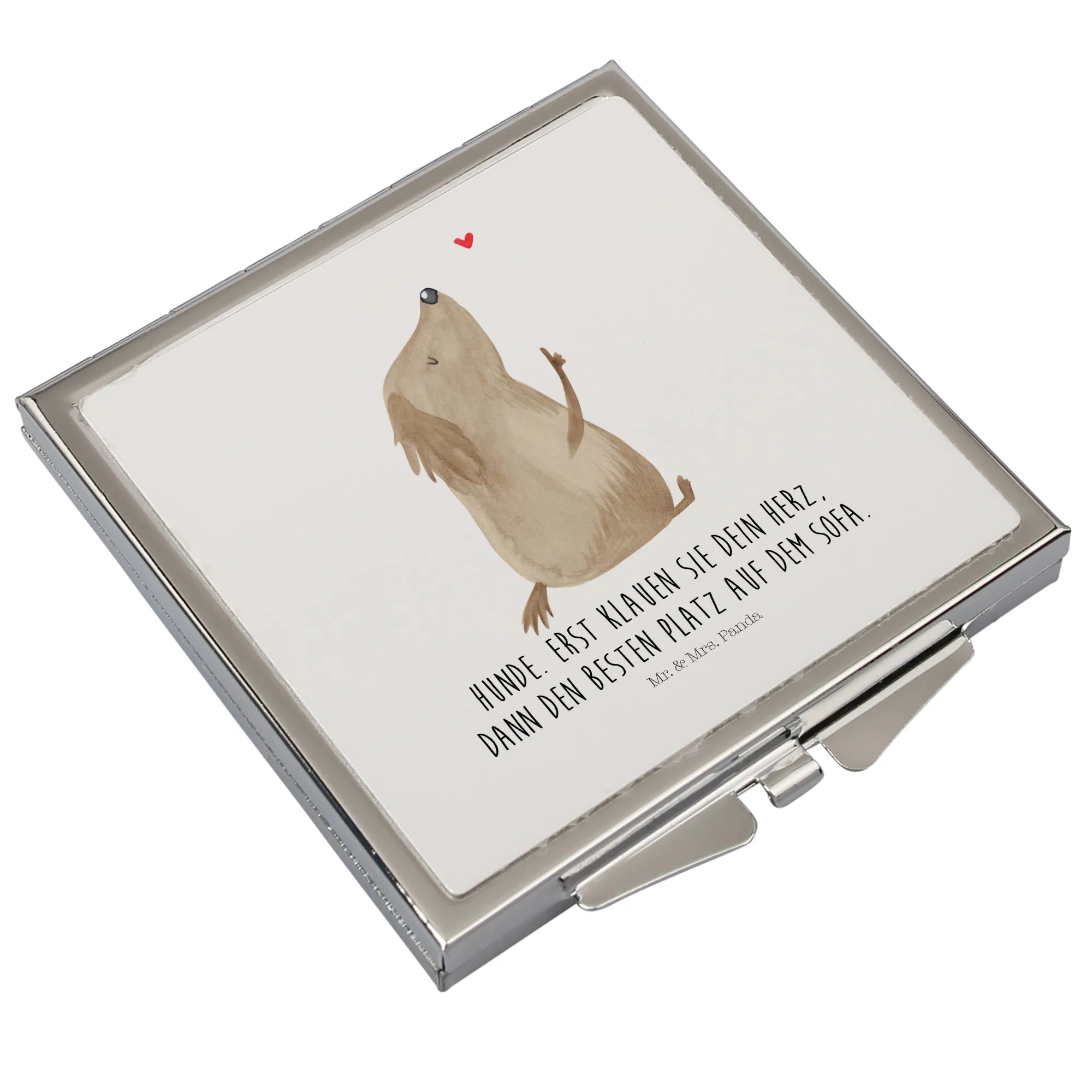 The front side of the mirror features a beautiful design by Mr. & Mrs. Panda, showcasing an irresistibly cute dog who happily presents a small heart. This lovely depiction represents the unconditional love between dogs and their humans, embodying the saying "Dogs! First they steal your heart, then the comfiest spot on the couch." This design not only serves as a practical beauty accessory but also as an uplifting reminder of your beloved four-legged friends.