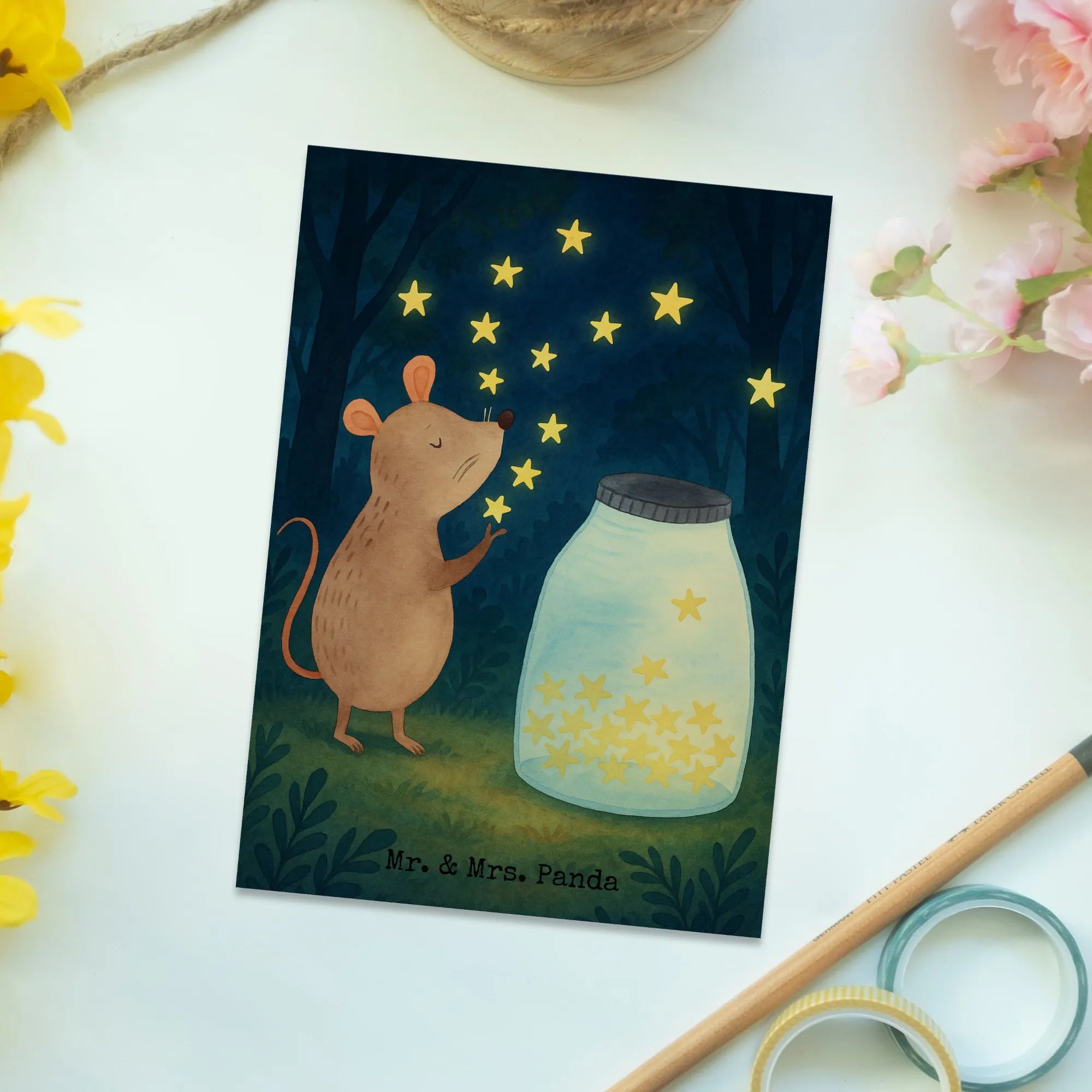 Diese liebevoll illustrierte Postkarte von Mr. & Mrs. Panda zeigt eine kleine Maus, die vor einem Glas voller funkelnder Sterne sitzt und sie in die Freiheit entlässt. Das Motiv vermittelt Wärme, Hoffnung und Träume – perfekt als Grußkarte zur Geburt, als Taufkarte oder als besondere Geburtstagskarte für Kinder.